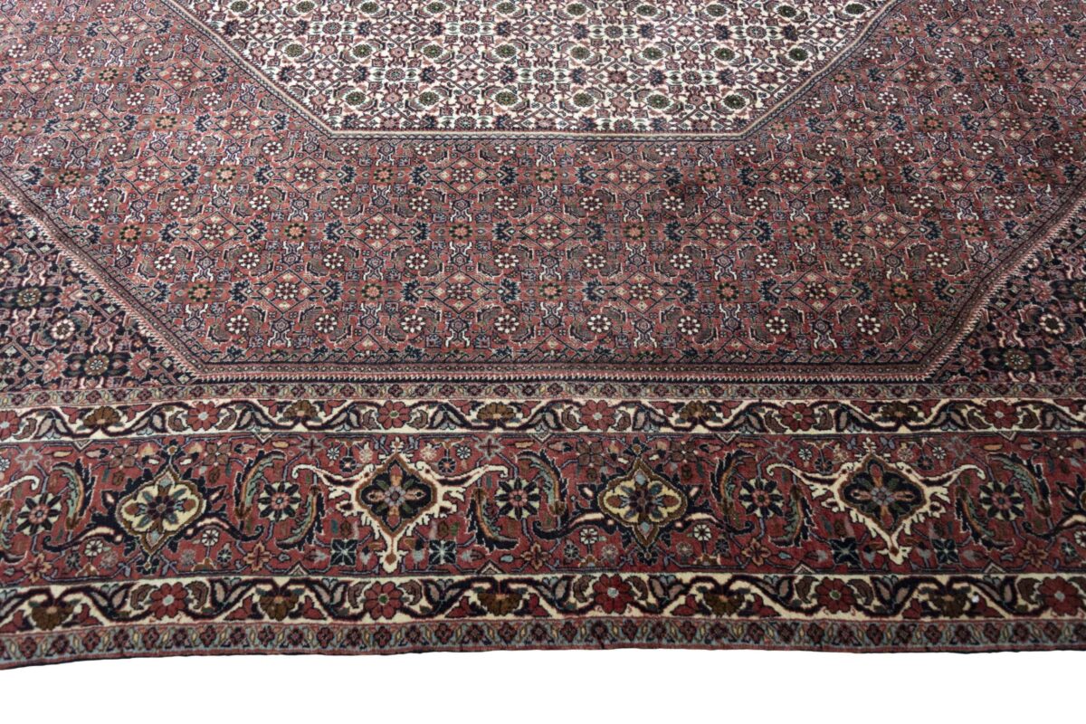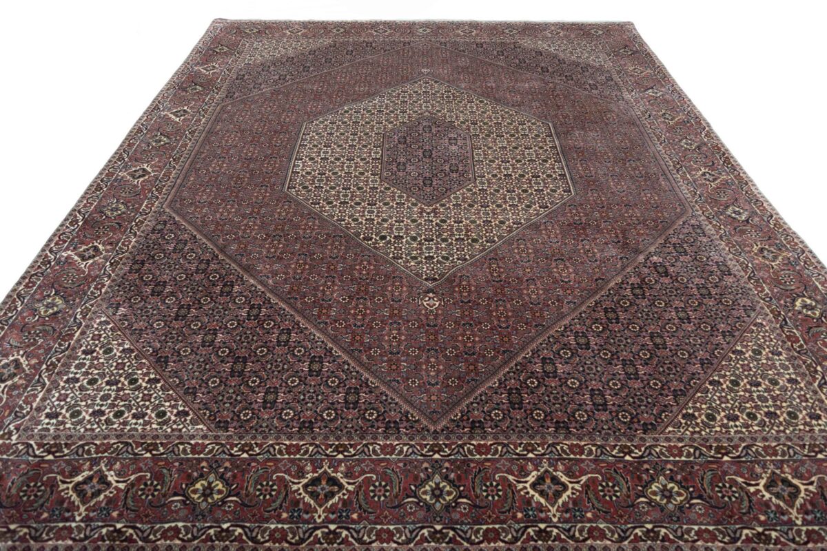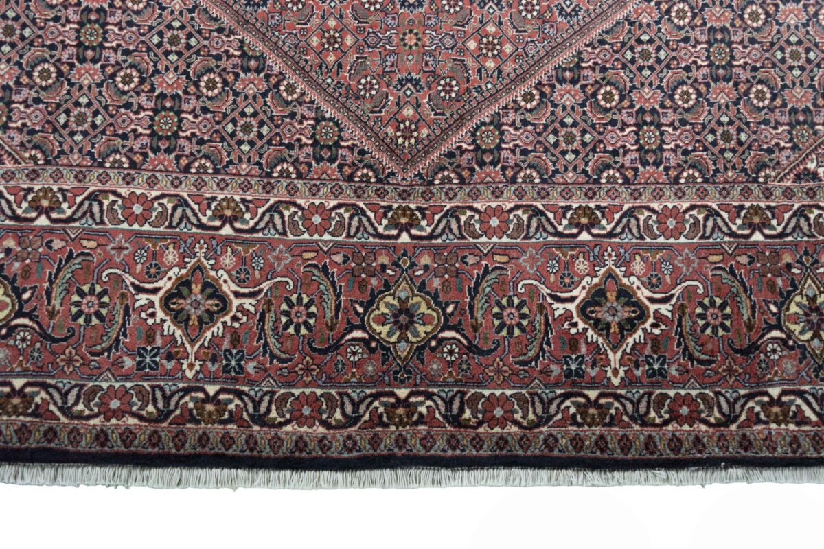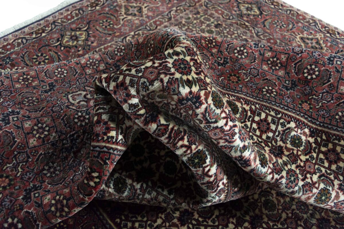 In der kurdischen Teppichprovenienz Bidjar, im Nordwesten des Iran, wird eine besondere Knüpfkunst gepflegt, die dem Bidjar-Perserteppich international einen guten Ruf als äußerst robuster Orientteppichverschafft hat. Im Persischen wird er auch „Eisenteppich“ genannt, da seine Baumwoll-Schussfäden angefeuchtet und durch einen Eisenkamm fest mit den Reihen aus türkischen Knoten zusammengedrückt werden. Somit entsteht ein sehr dichter Flor, der kaum Schmutzpartikel durchlässt und den Bidjar-Perserteppich zur idealen Ausstattung für stark beanspruchte Bodenflächen, beispielsweise in öffentlichen Räumen oder im Essbereich, macht.