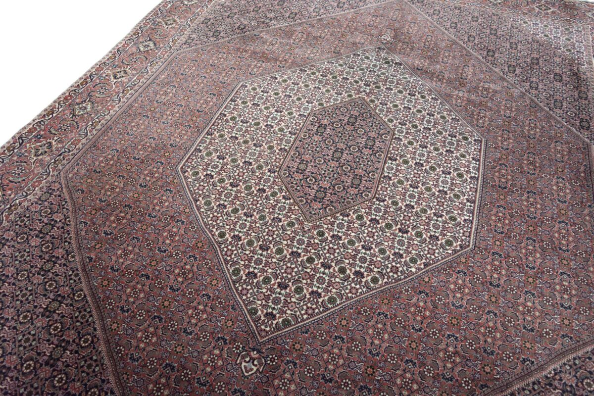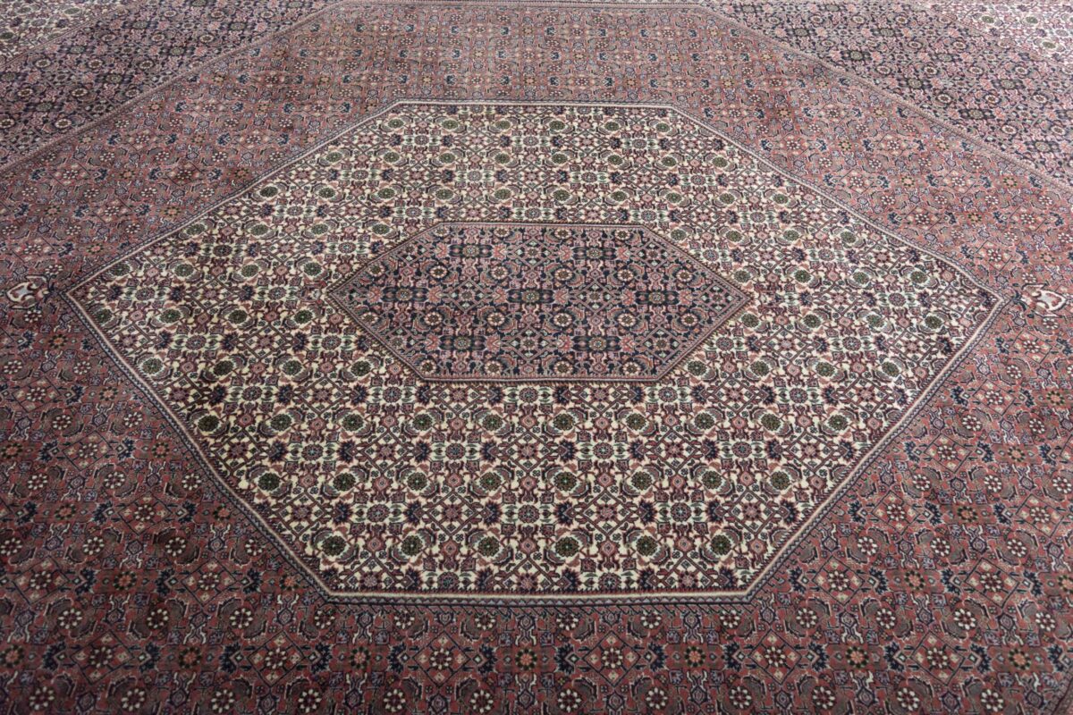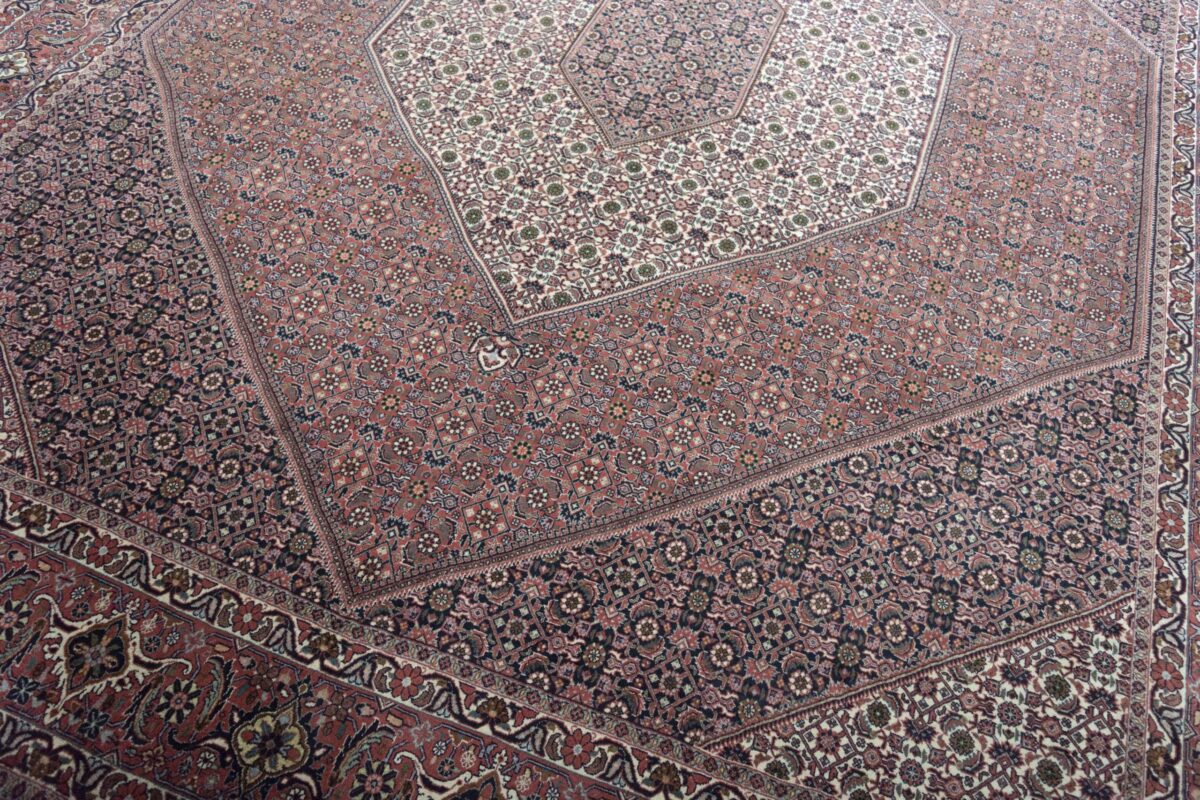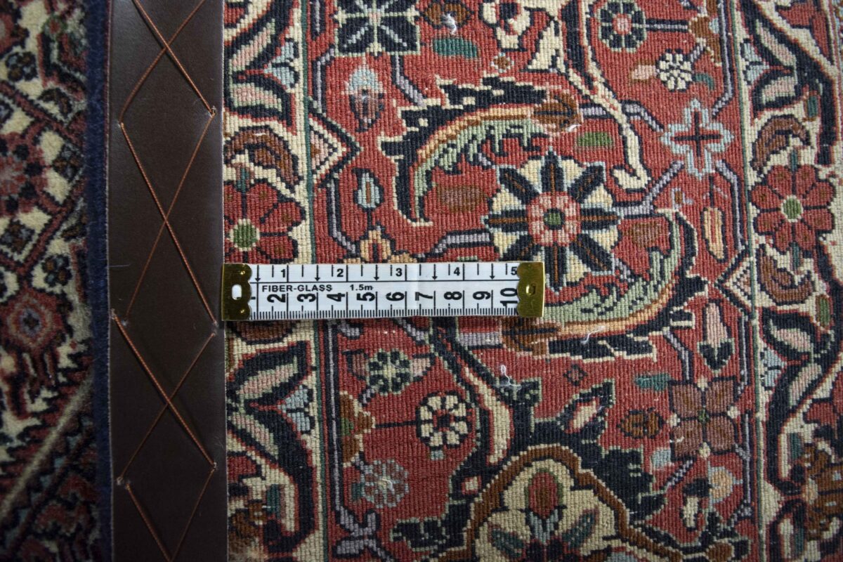 In der kurdischen Teppichprovenienz Bidjar, im Nordwesten des Iran, wird eine besondere Knüpfkunst gepflegt, die dem Bidjar-Perserteppich international einen guten Ruf als äußerst robuster Orientteppichverschafft hat. Im Persischen wird er auch „Eisenteppich“ genannt, da seine Baumwoll-Schussfäden angefeuchtet und durch einen Eisenkamm fest mit den Reihen aus türkischen Knoten zusammengedrückt werden. Somit entsteht ein sehr dichter Flor, der kaum Schmutzpartikel durchlässt und den Bidjar-Perserteppich zur idealen Ausstattung für stark beanspruchte Bodenflächen, beispielsweise in öffentlichen Räumen oder im Essbereich, macht.
