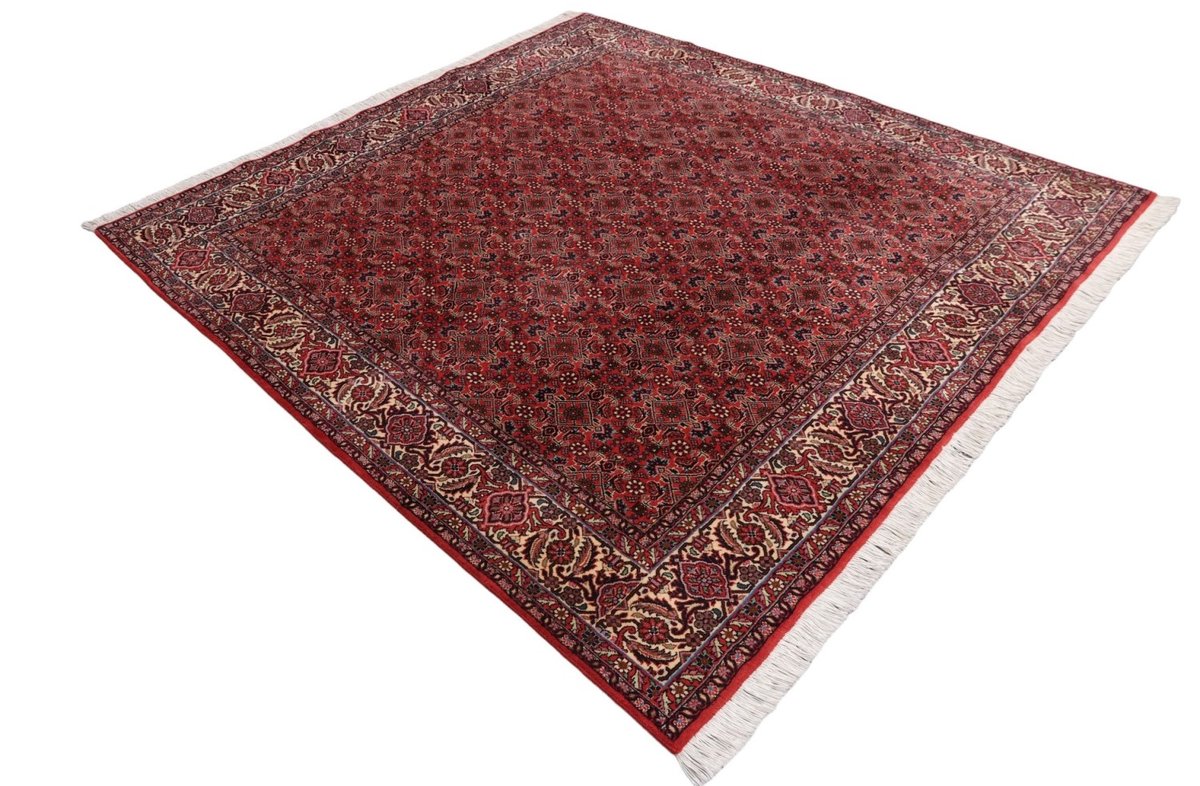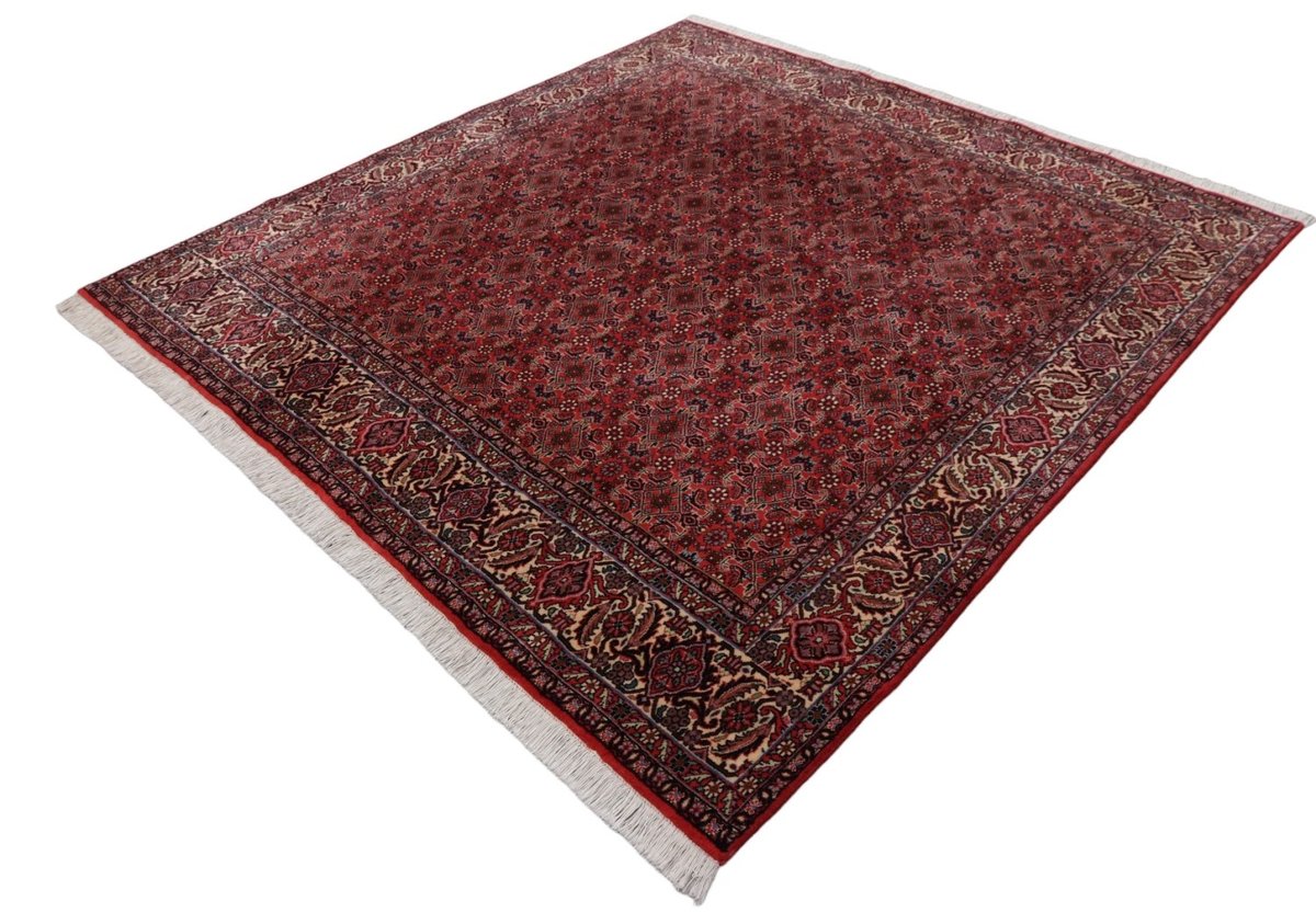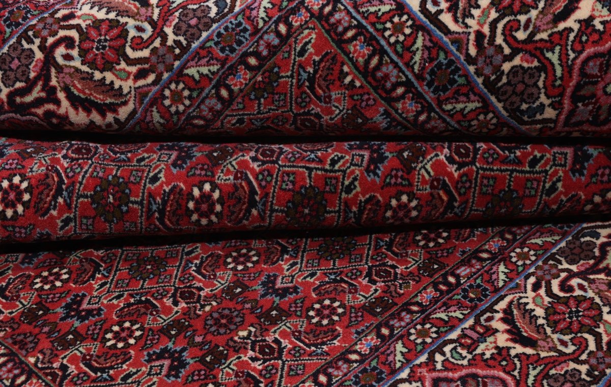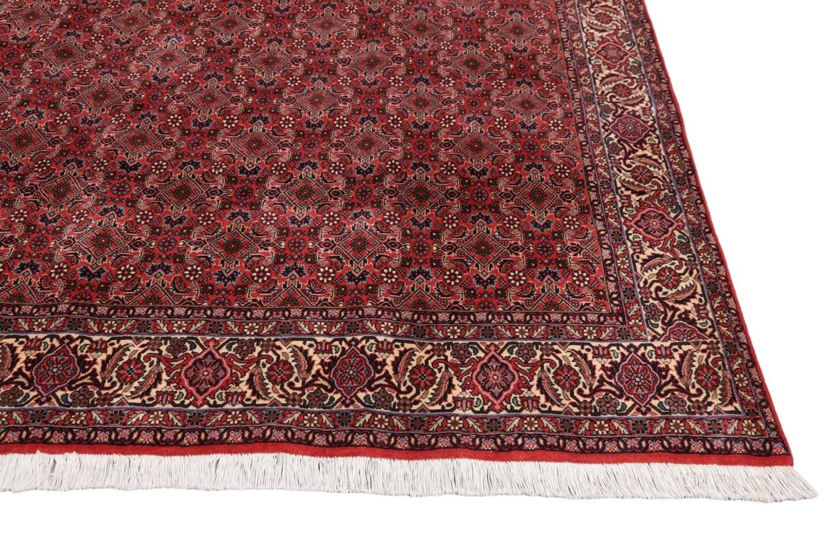 In der kurdischen Teppichprovenienz Bidjar, im Nordwesten des Iran, wird eine besondere Knüpfkunst gepflegt, die dem Bidjar-Perserteppich international einen guten Ruf als äußerst robuster Orientteppichverschafft hat. Im Persischen wird er auch „Eisenteppich“ genannt, da seine Baumwoll-Schussfäden angefeuchtet und durch einen Eisenkamm fest mit den Reihen aus türkischen Knoten zusammengedrückt werden. Somit entsteht ein sehr dichter Flor, der kaum Schmutzpartikel durchlässt und den Bidjar-Perserteppich zur idealen Ausstattung für stark beanspruchte Bodenflächen, beispielsweise in öffentlichen Räumen oder im Essbereich, macht.