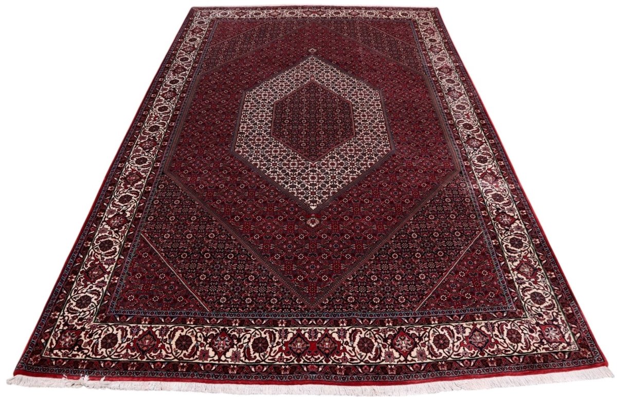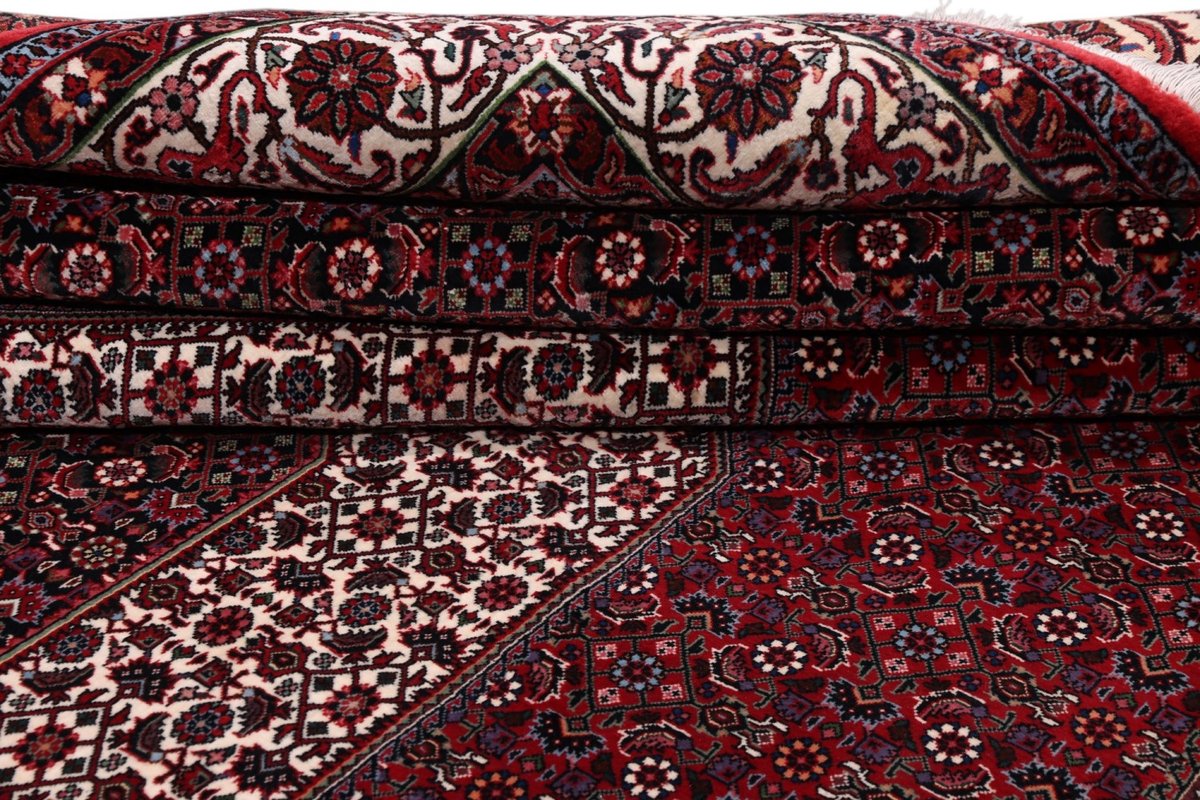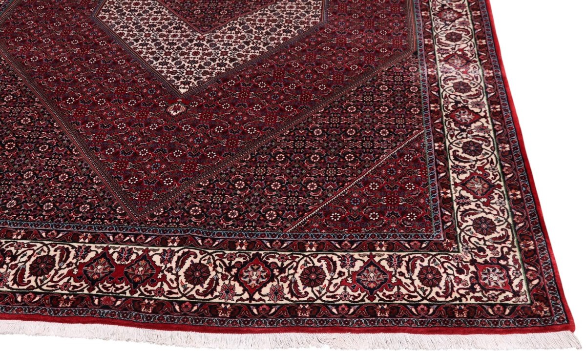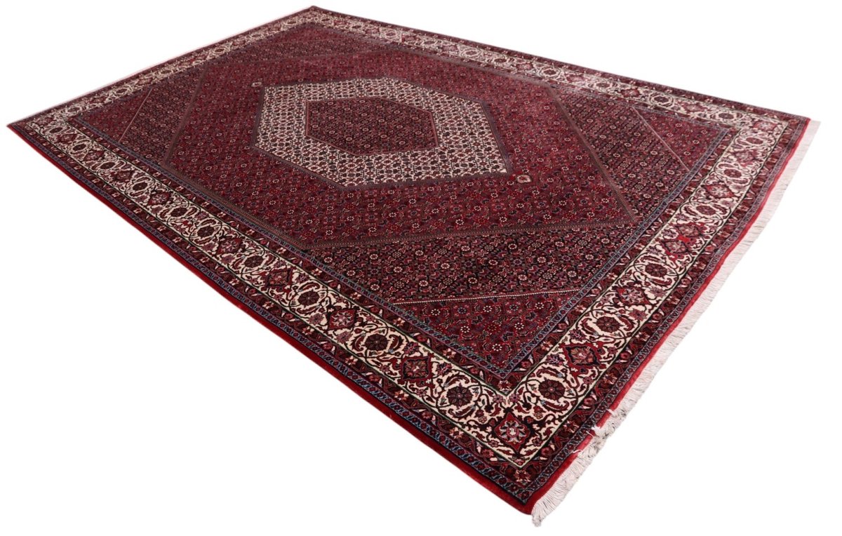 In der kurdischen Teppichprovenienz Bidjar, im Nordwesten des Iran, wird eine besondere Knüpfkunst gepflegt, die dem Bidjar-Perserteppich international einen guten Ruf als äußerst robuster Orientteppichverschafft hat. Im Persischen wird er auch „Eisenteppich“ genannt, da seine Baumwoll-Schussfäden angefeuchtet und durch einen Eisenkamm fest mit den Reihen aus türkischen Knoten zusammengedrückt werden. Somit entsteht ein sehr dichter Flor, der kaum Schmutzpartikel durchlässt und den Bidjar-Perserteppich zur idealen Ausstattung für stark beanspruchte Bodenflächen, beispielsweise in öffentlichen Räumen oder im Essbereich, macht.