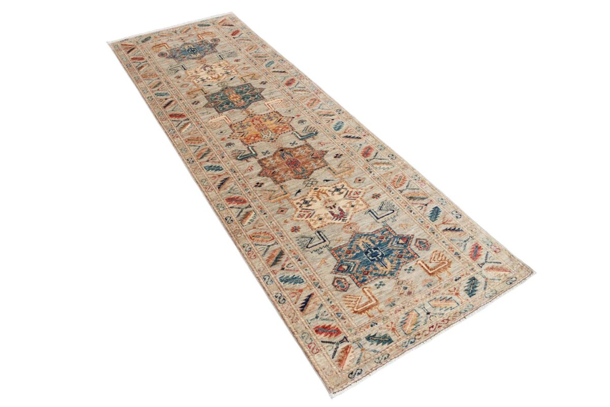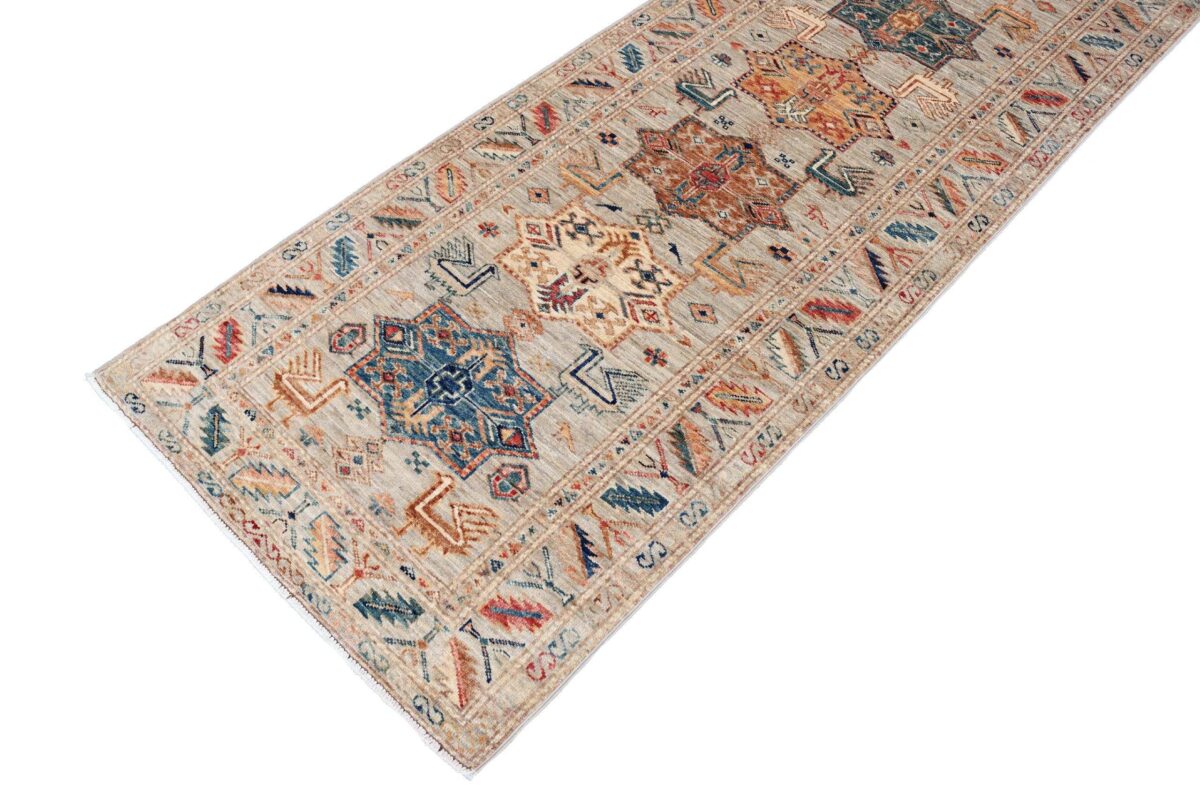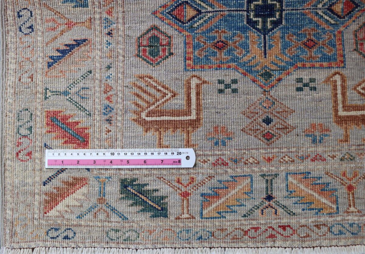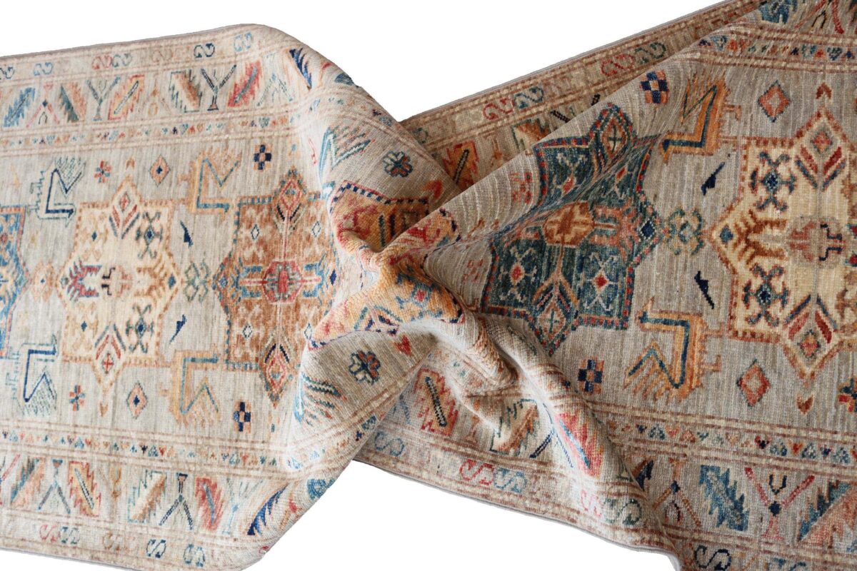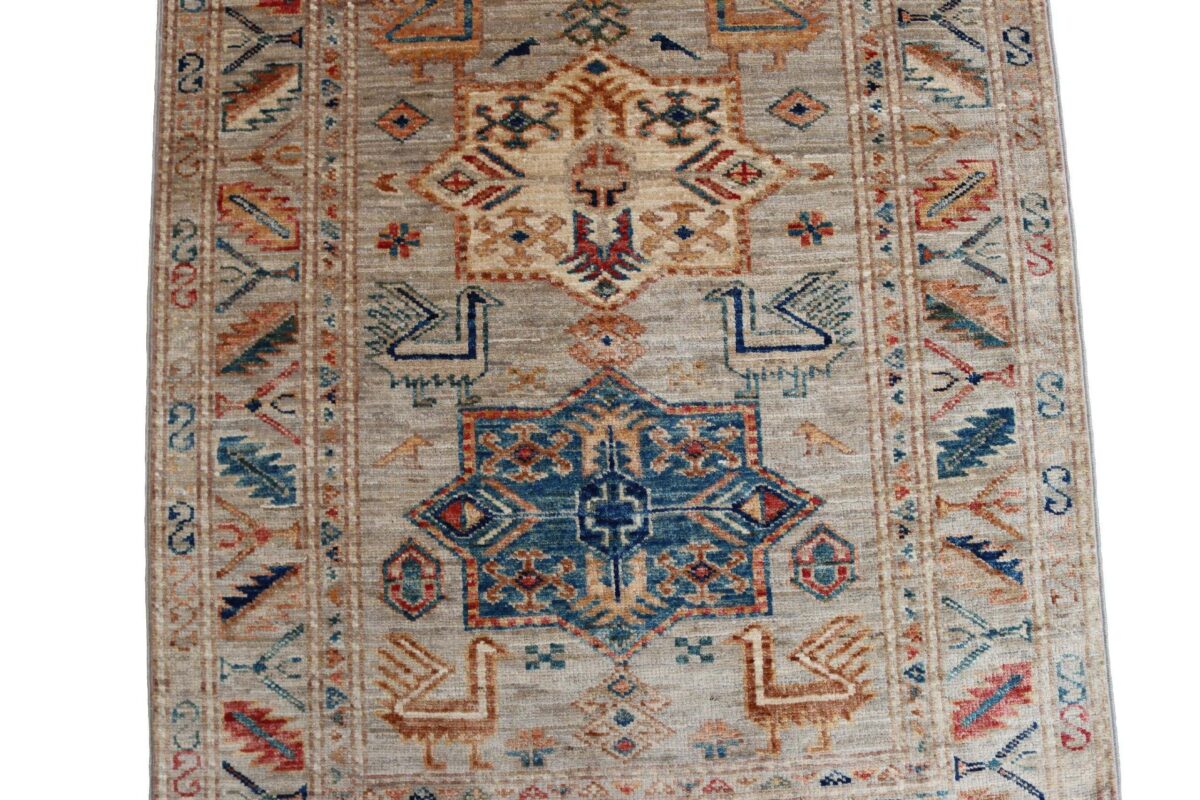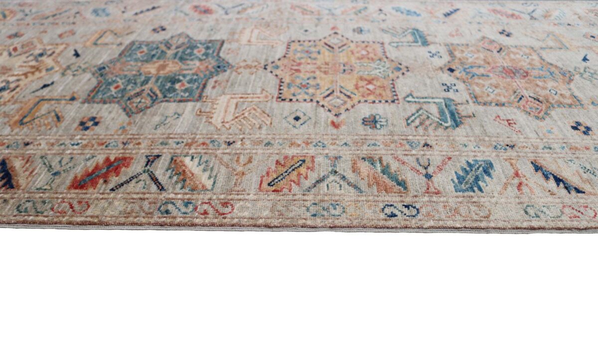Mit ihren klaren, geometrischen Mustern sind kaukasische Teppiche eine ideale Ergänzung zu zeitgenössischen Einrichtungen und werden auch wegen ihrer Robustheit gerne nachgefragt. Wer sich für kaukasische Teppiche interessiert, kann selbstverständlich bei uns ausgewählte Exemplare online kaufen. Zu den geläufigsten kaukasischen Teppichen zählt der Kazak-Orientteppich, der hauptsächlich im Knüpfgebiet nördlich des Sewansees angefertigt wird. Das Kazak-Design weist die typischen kaukasischen Geometrieformen auf, manchmal mit zierlichen Details wie vereinfachten Tierdarstellungen. Ein Kazak-Orientteppich beeindruckt außerdem durch seine harmonische Farbgebung. So mancher Betrachter staunt über den gelungenen Einsatz von Türkis- und Grüntönen, der in dieser hochgradig-ästhetischen Form bei Orientteppichen selten ist. Beachtenswert sind ebenso die feinsinnig gestalteten Abschlüsse an den Teppichseiten eines Kazaks. Für den Flor wird reine Schurwolle mit türkischen Knoten auf Baumwollkette verarbeitet, wobei die durchschnittliche Knüpfung mit etwa 220.000 Knoten/m² als fein anzusehen ist. Online kaufen lassen sich außerdem sehr begehrte antike Kazak-Teppiche mit extra-feiner Knüpfung, die zur Gänze aus Schurwolle bestehen.