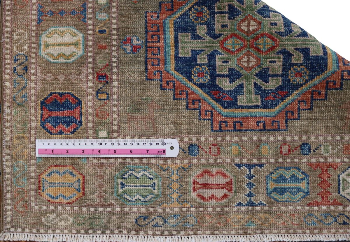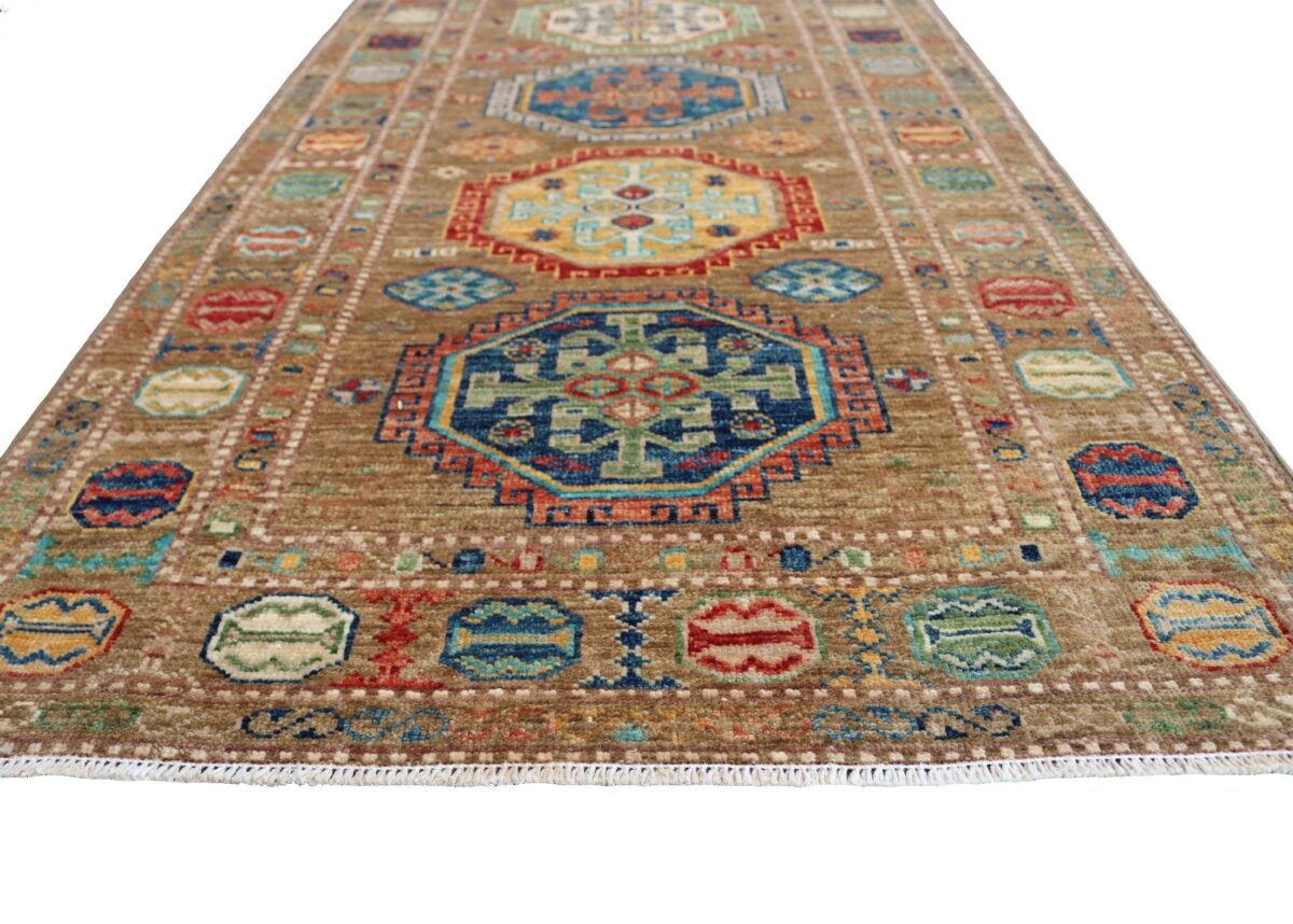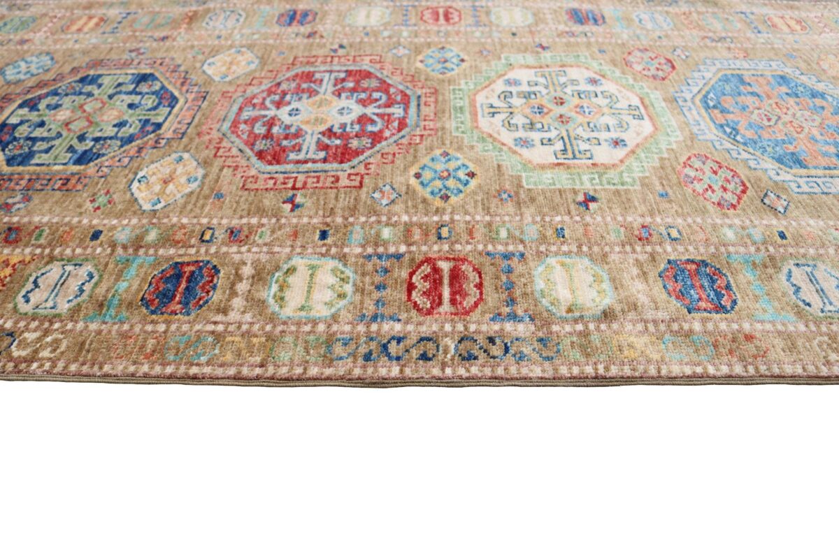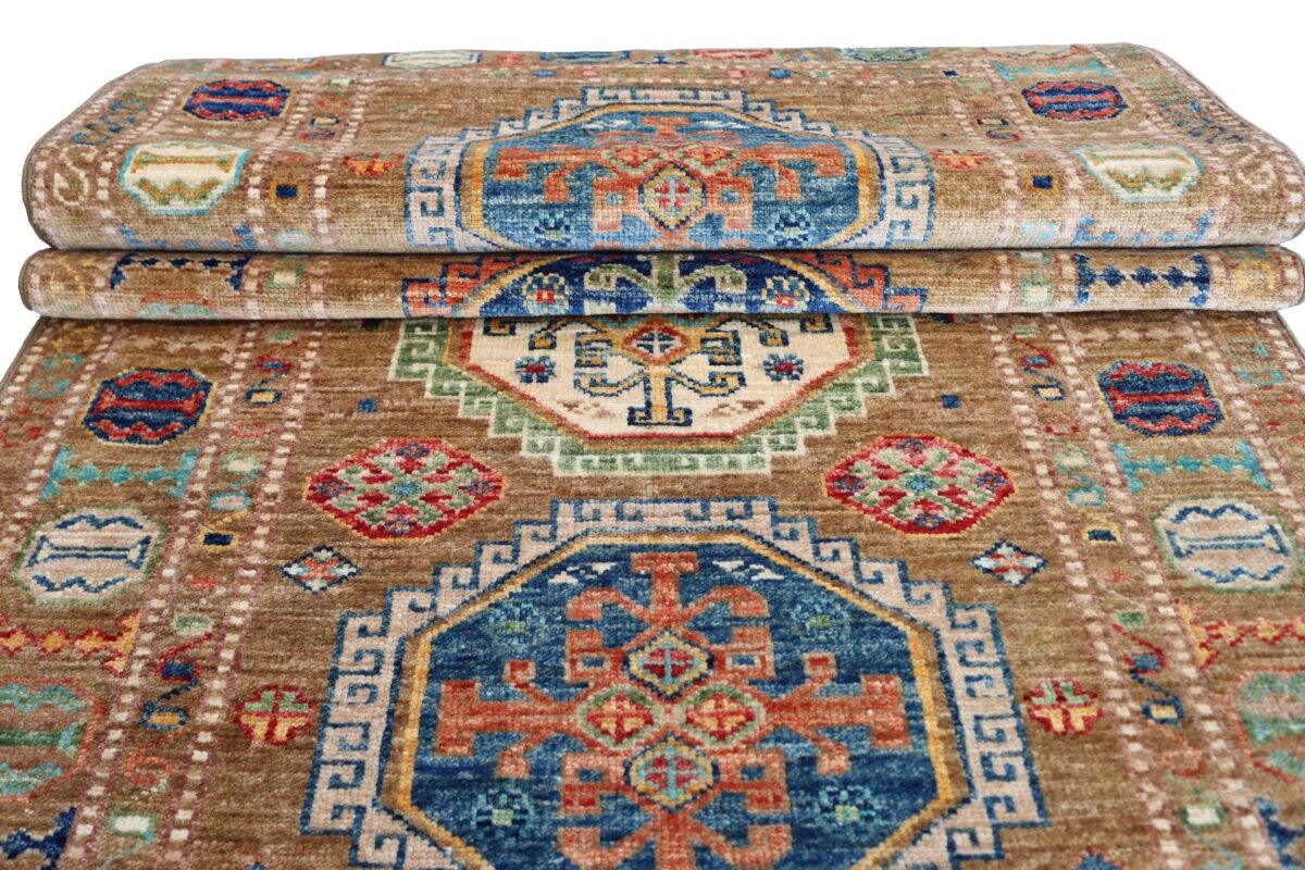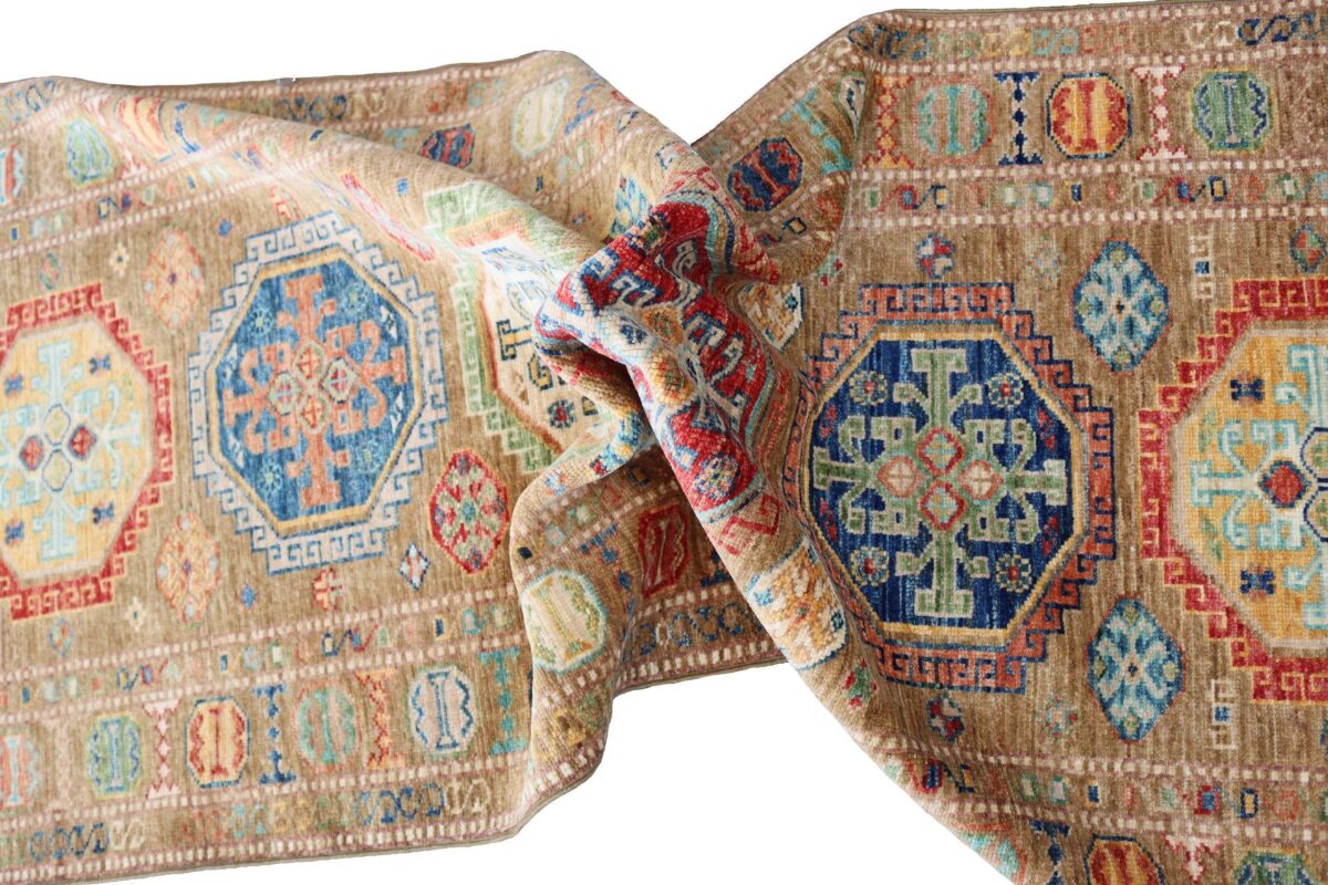 Mit ihren klaren, geometrischen Mustern sind kaukasische Teppiche eine ideale Ergänzung zu zeitgenössischen Einrichtungen und werden auch wegen ihrer Robustheit gerne nachgefragt. Wer sich für kaukasische Teppiche interessiert, kann selbstverständlich bei uns ausgewählte Exemplare online kaufen. Zu den geläufigsten kaukasischen Teppichen zählt der Kazak-Orientteppich, der hauptsächlich im Knüpfgebiet nördlich des Sewansees angefertigt wird. Das Kazak-Design weist die typischen kaukasischen Geometrieformen auf, manchmal mit zierlichen Details wie vereinfachten Tierdarstellungen. Ein Kazak-Orientteppich beeindruckt außerdem durch seine harmonische Farbgebung. So mancher Betrachter staunt über den gelungenen Einsatz von Türkis- und Grüntönen, der in dieser hochgradig-ästhetischen Form bei Orientteppichen selten ist. Beachtenswert sind ebenso die feinsinnig gestalteten Abschlüsse an den Teppichseiten eines Kazaks. Für den Flor wird reine Schurwolle mit türkischen Knoten auf Baumwollkette verarbeitet, wobei die durchschnittliche Knüpfung mit etwa 220.000 Knoten/m² als fein anzusehen ist. Online kaufen lassen sich außerdem sehr begehrte antike Kazak-Teppiche mit extra-feiner Knüpfung, die zur Gänze aus Schurwolle bestehen.