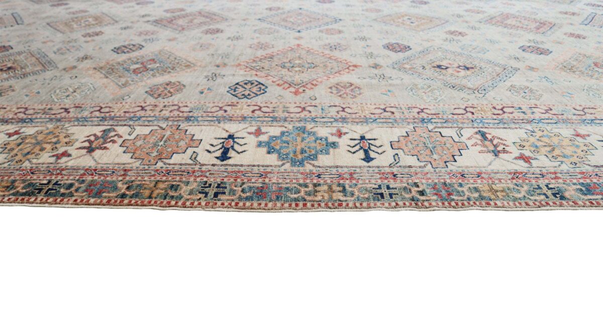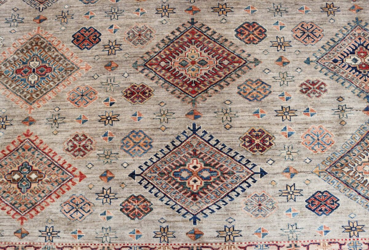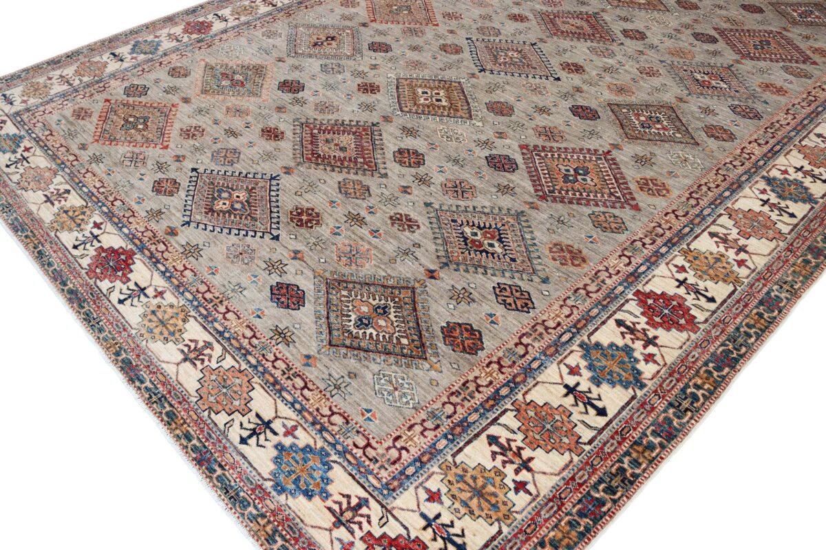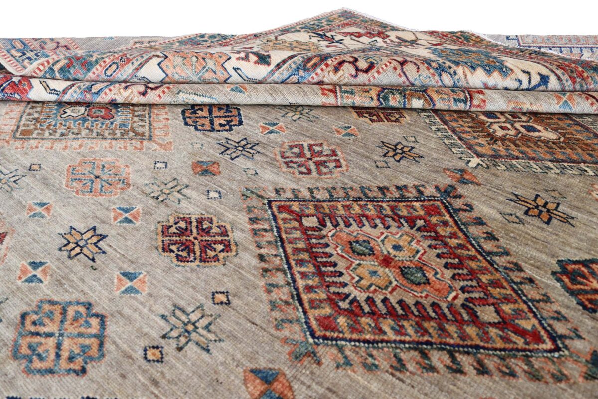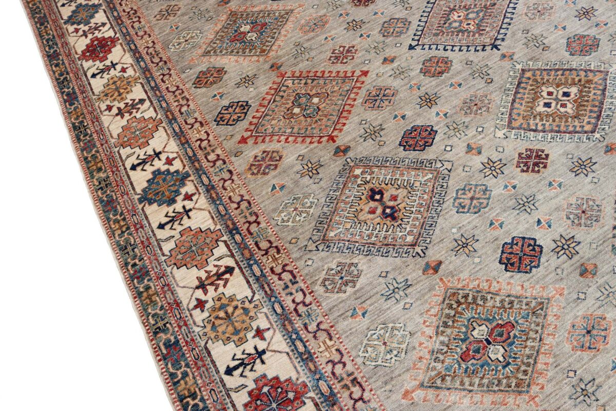 Mit ihren klaren, geometrischen Mustern sind kaukasische Teppiche eine ideale Ergänzung zu zeitgenössischen Einrichtungen und werden auch wegen ihrer Robustheit gerne nachgefragt. Wer sich für kaukasische Teppiche interessiert, kann selbstverständlich bei uns ausgewählte Exemplare online kaufen. Zu den geläufigsten kaukasischen Teppichen zählt der Kazak-Orientteppich, der hauptsächlich im Knüpfgebiet nördlich des Sewansees angefertigt wird. Das Kazak-Design weist die typischen kaukasischen Geometrieformen auf, manchmal mit zierlichen Details wie vereinfachten Tierdarstellungen. Ein Kazak-Orientteppich beeindruckt außerdem durch seine harmonische Farbgebung. So mancher Betrachter staunt über den gelungenen Einsatz von Türkis- und Grüntönen, der in dieser hochgradig-ästhetischen Form bei Orientteppichen selten ist. Beachtenswert sind ebenso die feinsinnig gestalteten Abschlüsse an den Teppichseiten eines Kazaks. Für den Flor wird reine Schurwolle mit türkischen Knoten auf Baumwollkette verarbeitet, wobei die durchschnittliche Knüpfung mit etwa 220.000 Knoten/m² als fein anzusehen ist. Online kaufen lassen sich außerdem sehr begehrte antike Kazak-Teppiche mit extra-feiner Knüpfung, die zur Gänze aus Schurwolle bestehen.