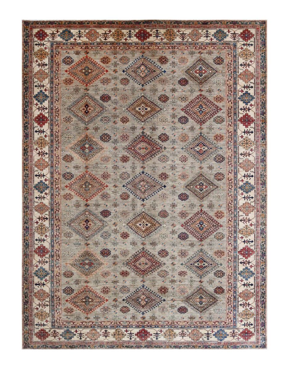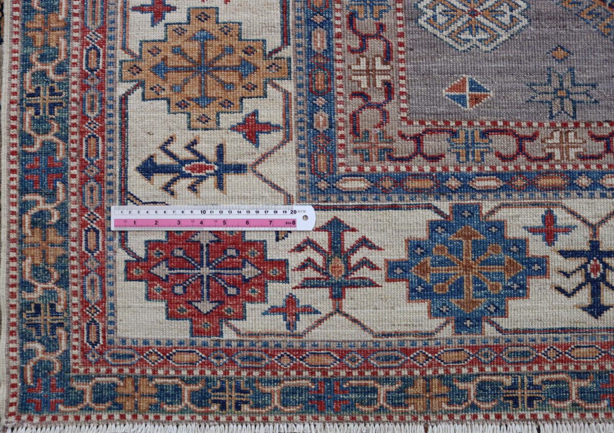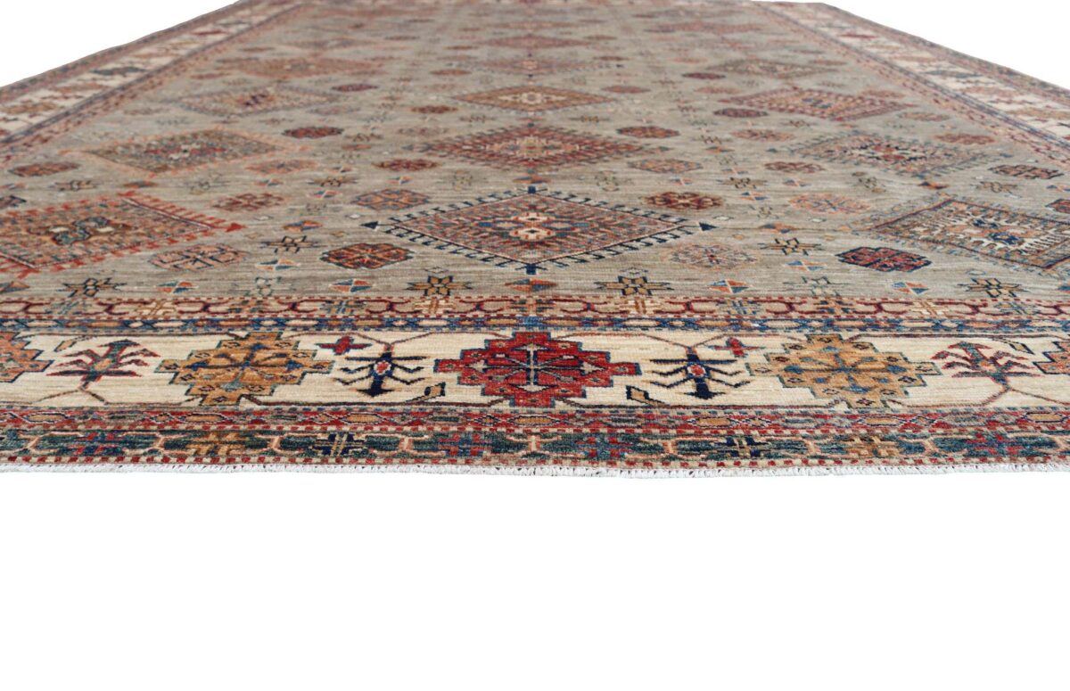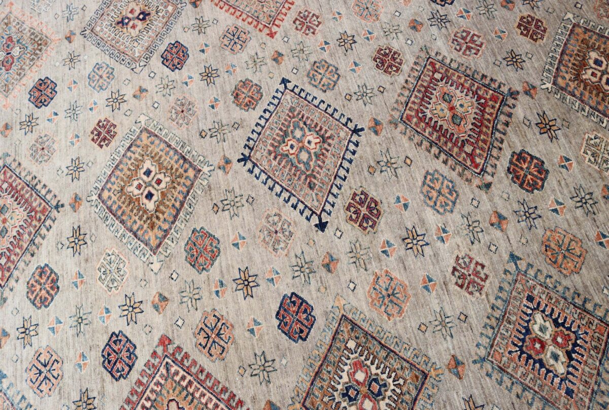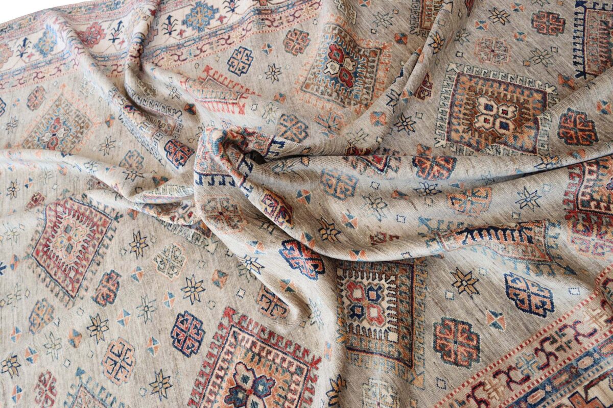 Mit ihren klaren, geometrischen Mustern sind kaukasische Teppiche eine ideale Ergänzung zu zeitgenössischen Einrichtungen und werden auch wegen ihrer Robustheit gerne nachgefragt. Wer sich für kaukasische Teppiche interessiert, kann selbstverständlich bei uns ausgewählte Exemplare online kaufen. Zu den geläufigsten kaukasischen Teppichen zählt der Kazak-Orientteppich, der hauptsächlich im Knüpfgebiet nördlich des Sewansees angefertigt wird. Das Kazak-Design weist die typischen kaukasischen Geometrieformen auf, manchmal mit zierlichen Details wie vereinfachten Tierdarstellungen. Ein Kazak-Orientteppich beeindruckt außerdem durch seine harmonische Farbgebung. So mancher Betrachter staunt über den gelungenen Einsatz von Türkis- und Grüntönen, der in dieser hochgradig-ästhetischen Form bei Orientteppichen selten ist. Beachtenswert sind ebenso die feinsinnig gestalteten Abschlüsse an den Teppichseiten eines Kazaks. Für den Flor wird reine Schurwolle mit türkischen Knoten auf Baumwollkette verarbeitet, wobei die durchschnittliche Knüpfung mit etwa 220.000 Knoten/m² als fein anzusehen ist. Online kaufen lassen sich außerdem sehr begehrte antike Kazak-Teppiche mit extra-feiner Knüpfung, die zur Gänze aus Schurwolle bestehen.