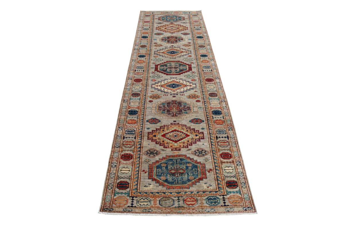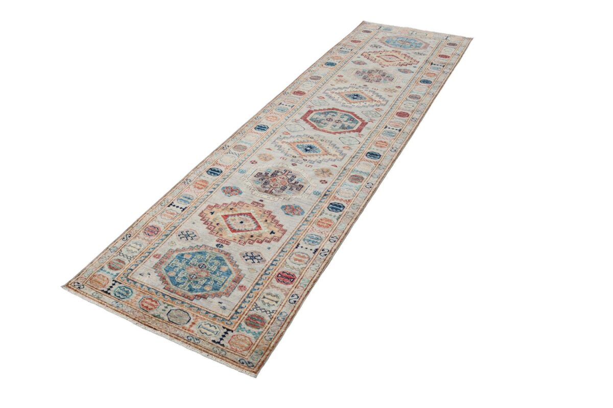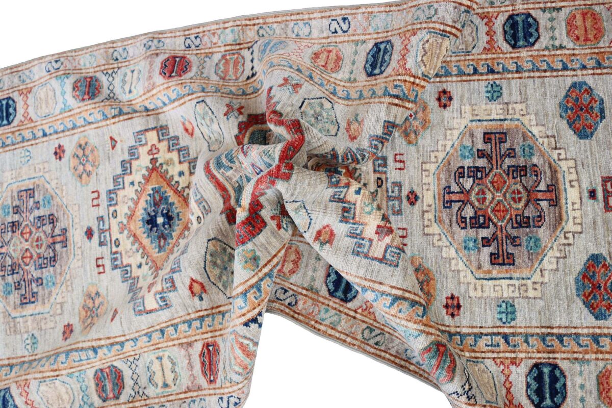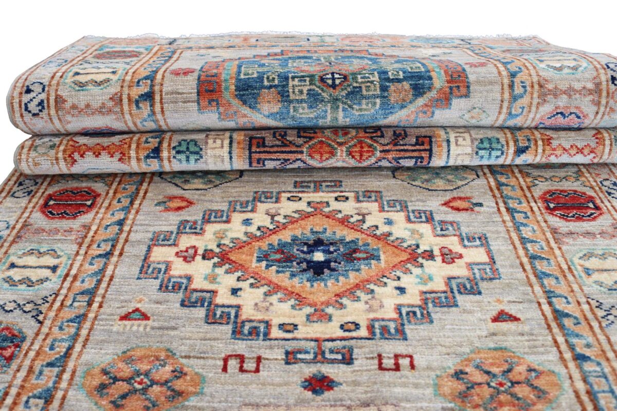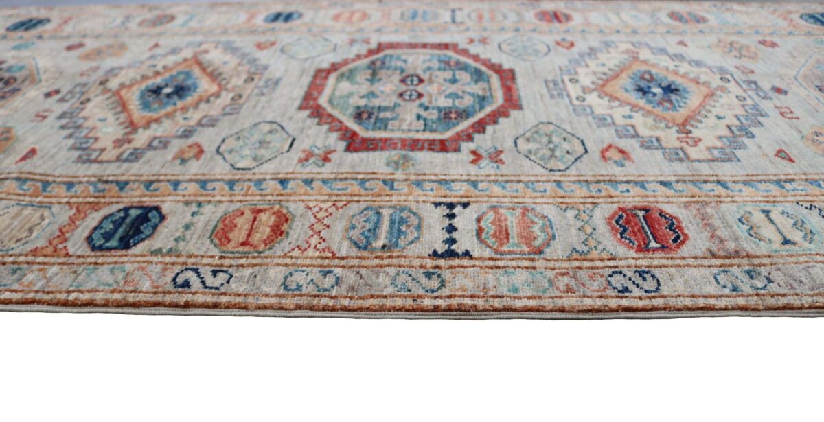 Mit ihren klaren, geometrischen Mustern sind kaukasische Teppiche eine ideale Ergänzung zu zeitgenössischen Einrichtungen und werden auch wegen ihrer Robustheit gerne nachgefragt. Wer sich für kaukasische Teppiche interessiert, kann selbstverständlich bei uns ausgewählte Exemplare online kaufen. Zu den geläufigsten kaukasischen Teppichen zählt der Kazak-Orientteppich, der hauptsächlich im Knüpfgebiet nördlich des Sewansees angefertigt wird. Das Kazak-Design weist die typischen kaukasischen Geometrieformen auf, manchmal mit zierlichen Details wie vereinfachten Tierdarstellungen. Ein Kazak-Orientteppich beeindruckt außerdem durch seine harmonische Farbgebung. So mancher Betrachter staunt über den gelungenen Einsatz von Türkis- und Grüntönen, der in dieser hochgradig-ästhetischen Form bei Orientteppichen selten ist. Beachtenswert sind ebenso die feinsinnig gestalteten Abschlüsse an den Teppichseiten eines Kazaks. Für den Flor wird reine Schurwolle mit türkischen Knoten auf Baumwollkette verarbeitet, wobei die durchschnittliche Knüpfung mit etwa 220.000 Knoten/m² als fein anzusehen ist. Online kaufen lassen sich außerdem sehr begehrte antike Kazak-Teppiche mit extra-feiner Knüpfung, die zur Gänze aus Schurwolle bestehen.