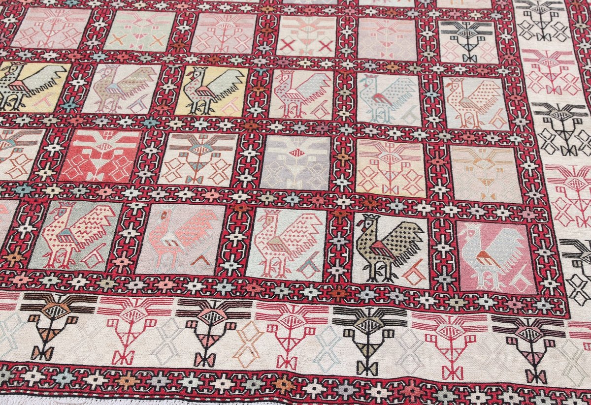 Kelim-Teppiche sind grundsätzlich flach gewebt und relativ leicht im Gewicht. Daher können sie auch effektvoll als Wanddekoration oder Bettüberwurf eingesetzt werden. Die charakteristische Kelim-Webtechnik mit Kette und farbigem Schussmaterial eignet sich hervorragend für zeitlose geometrische Muster und Abstraktionen aus Fauna und Flora. Auch bei modernen Kelim-Designs sind die Entwürfe häufig von traditioneller Symbolik inspiriert, wodurch der Kelim-Teppich seinen gefragten ethnischen Charme bewahrt.