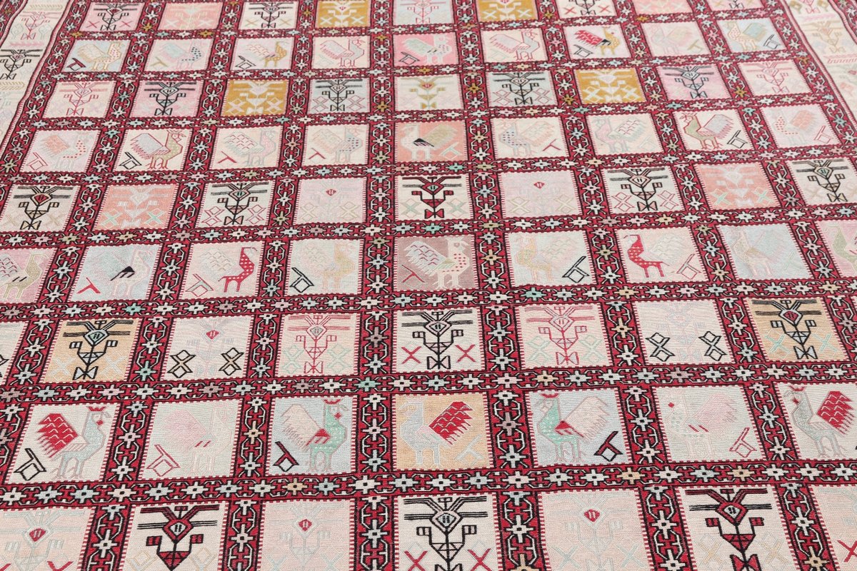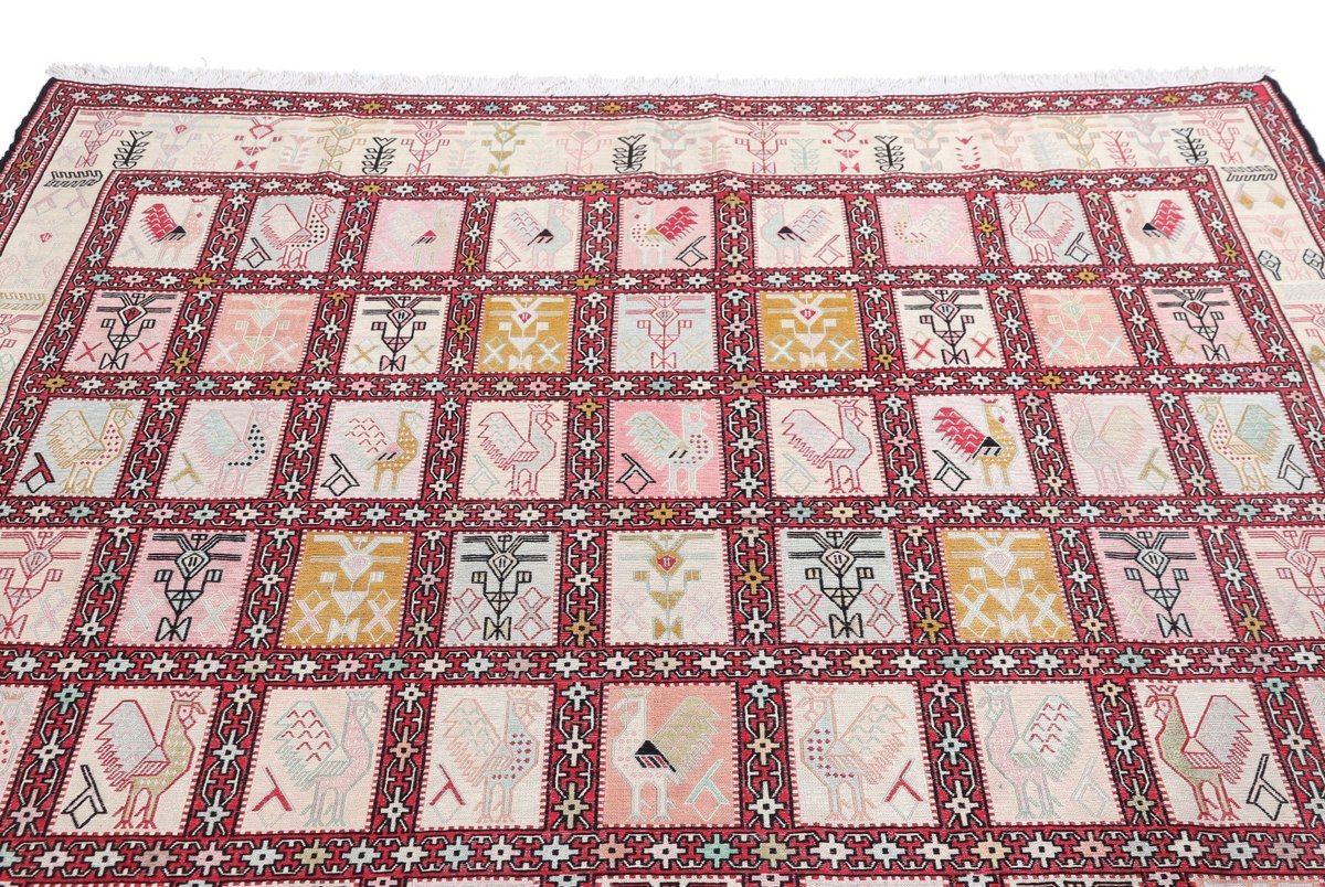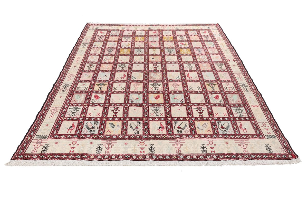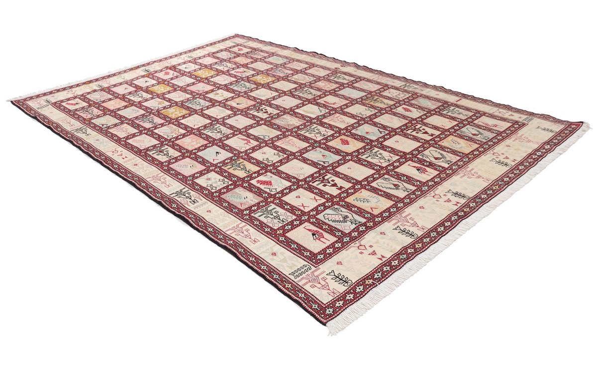 Kelim-Teppiche sind grundsätzlich flach gewebt und relativ leicht im Gewicht. Daher können sie auch effektvoll als Wanddekoration oder Bettüberwurf eingesetzt werden. Die charakteristische Kelim-Webtechnik mit Kette und farbigem Schussmaterial eignet sich hervorragend für zeitlose geometrische Muster und Abstraktionen aus Fauna und Flora. Auch bei modernen Kelim-Designs sind die Entwürfe häufig von traditioneller Symbolik inspiriert, wodurch der Kelim-Teppich seinen gefragten ethnischen Charme bewahrt.