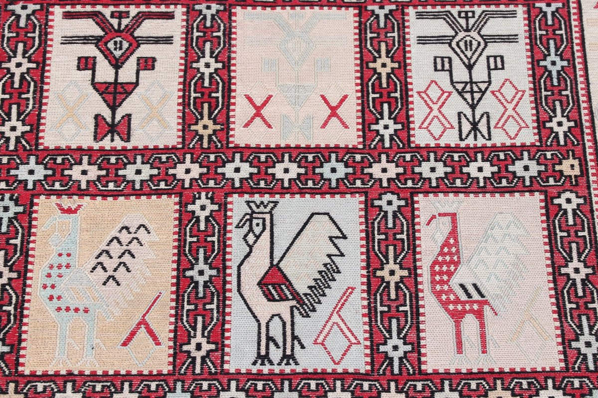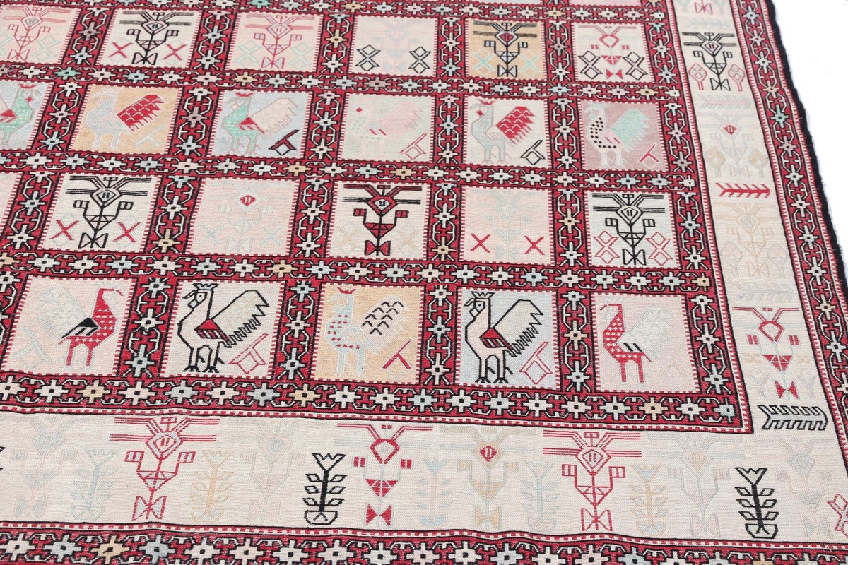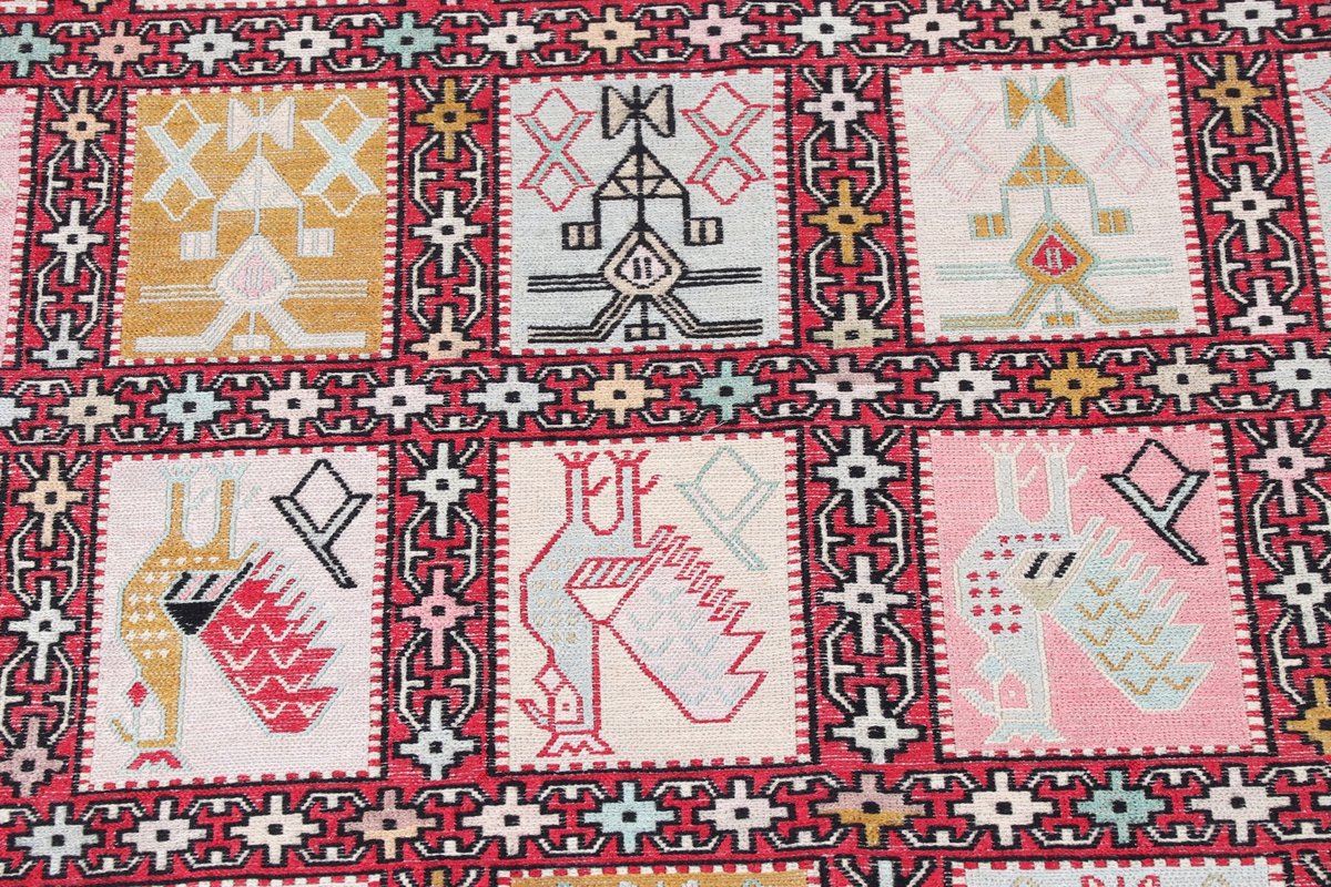 Kelim-Teppiche sind grundsätzlich flach gewebt und relativ leicht im Gewicht. Daher können sie auch effektvoll als Wanddekoration oder Bettüberwurf eingesetzt werden. Die charakteristische Kelim-Webtechnik mit Kette und farbigem Schussmaterial eignet sich hervorragend für zeitlose geometrische Muster und Abstraktionen aus Fauna und Flora. Auch bei modernen Kelim-Designs sind die Entwürfe häufig von traditioneller Symbolik inspiriert, wodurch der Kelim-Teppich seinen gefragten ethnischen Charme bewahrt.