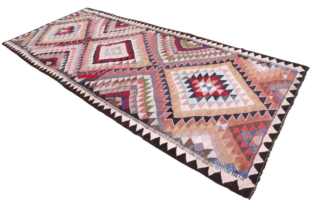 Kelim-Teppiche sind grundsätzlich flach gewebt und relativ leicht im Gewicht. Daher können sie auch effektvoll als Wanddekoration oder Bettüberwurf eingesetzt werden. Die charakteristische Kelim-Webtechnik mit Kette und farbigem Schussmaterial eignet sich hervorragend für zeitlose geometrische Muster und Abstraktionen aus Fauna und Flora. Auch bei modernen Kelim-Designs sind die Entwürfe häufig von traditioneller Symbolik inspiriert, wodurch der Kelim-Teppich seinen gefragten ethnischen Charme bewahrt.