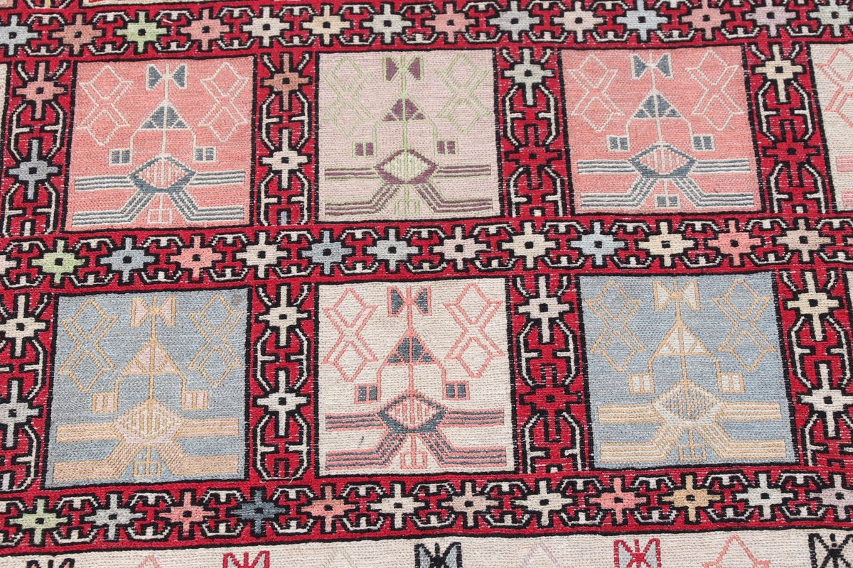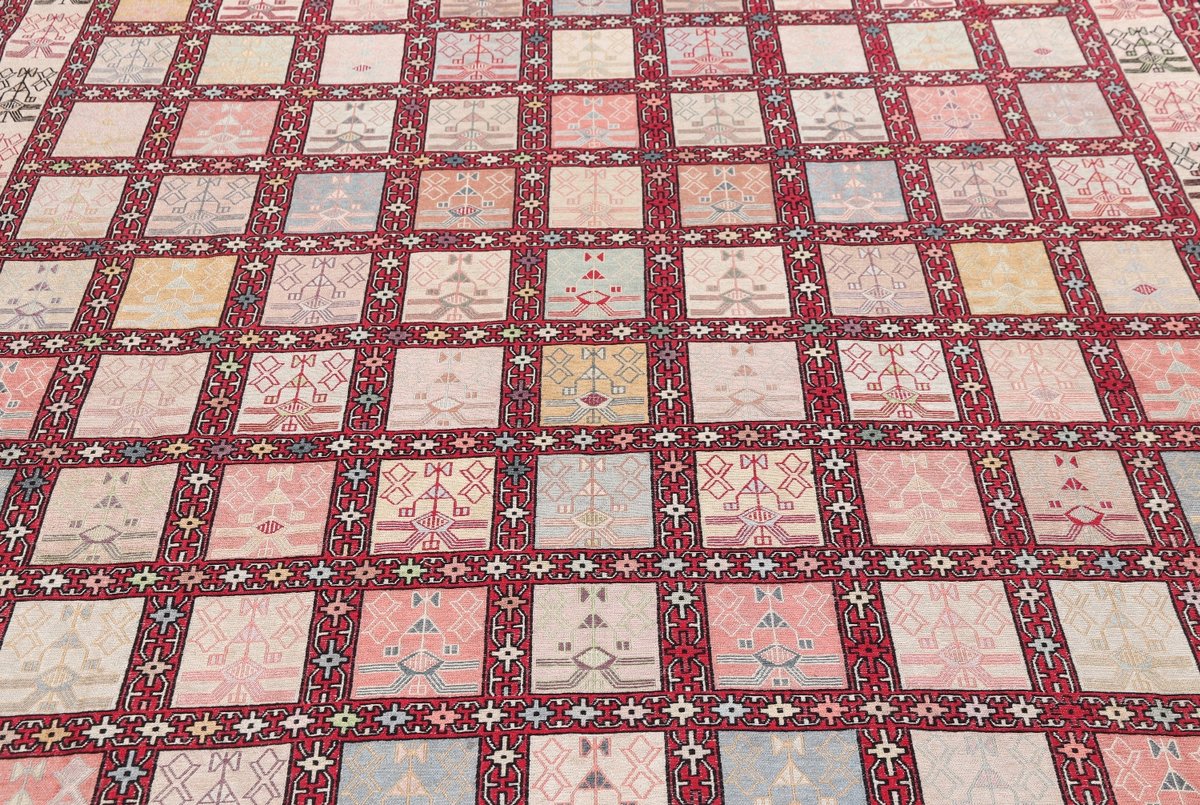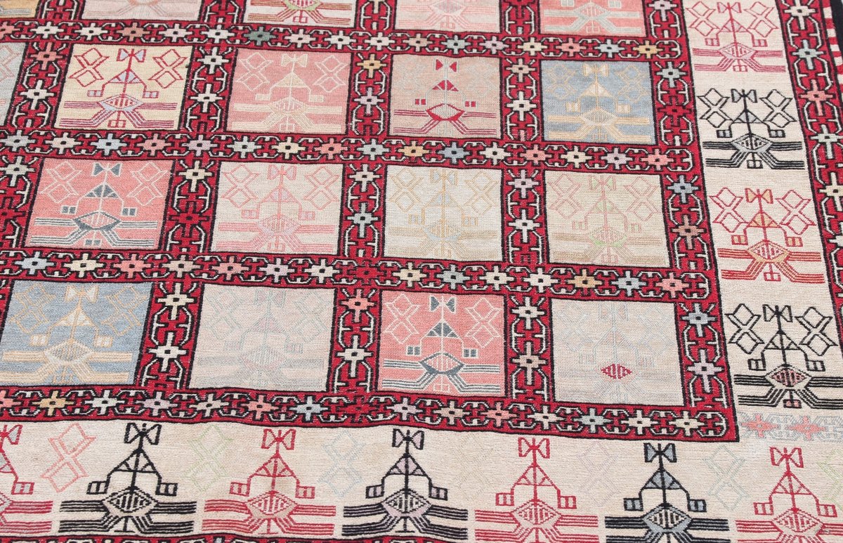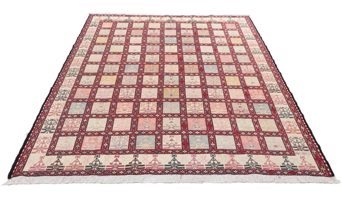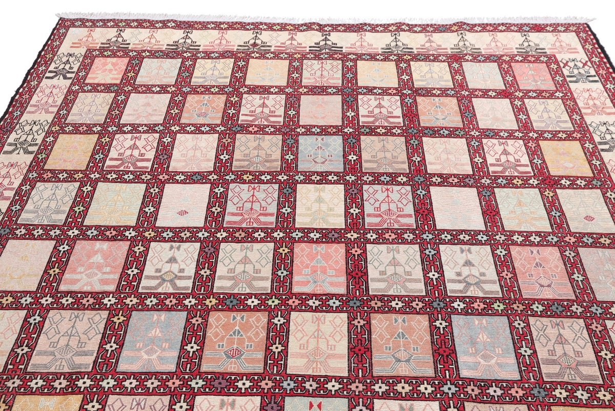 Kelim-Teppiche sind grundsätzlich flach gewebt und relativ leicht im Gewicht. Daher können sie auch effektvoll als Wanddekoration oder Bettüberwurf eingesetzt werden. Die charakteristische Kelim-Webtechnik mit Kette und farbigem Schussmaterial eignet sich hervorragend für zeitlose geometrische Muster und Abstraktionen aus Fauna und Flora. Auch bei modernen Kelim-Designs sind die Entwürfe häufig von traditioneller Symbolik inspiriert, wodurch der Kelim-Teppich seinen gefragten ethnischen Charme bewahrt.