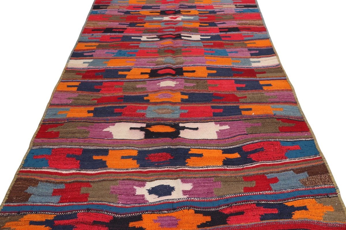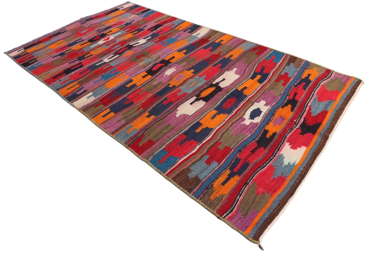 Kelim-Teppiche sind grundsätzlich flach gewebt und relativ leicht im Gewicht. Daher können sie auch effektvoll als Wanddekoration oder Bettüberwurf eingesetzt werden. Die charakteristische Kelim-Webtechnik mit Kette und farbigem Schussmaterial eignet sich hervorragend für zeitlose geometrische Muster und Abstraktionen aus Fauna und Flora. Auch bei modernen Kelim-Designs sind die Entwürfe häufig von traditioneller Symbolik inspiriert, wodurch der Kelim-Teppich seinen gefragten ethnischen Charme bewahrt.