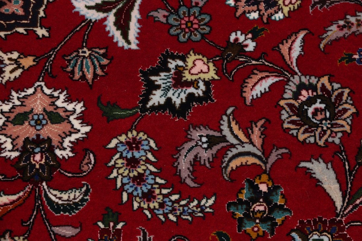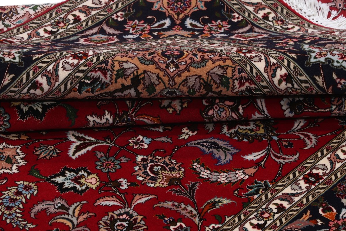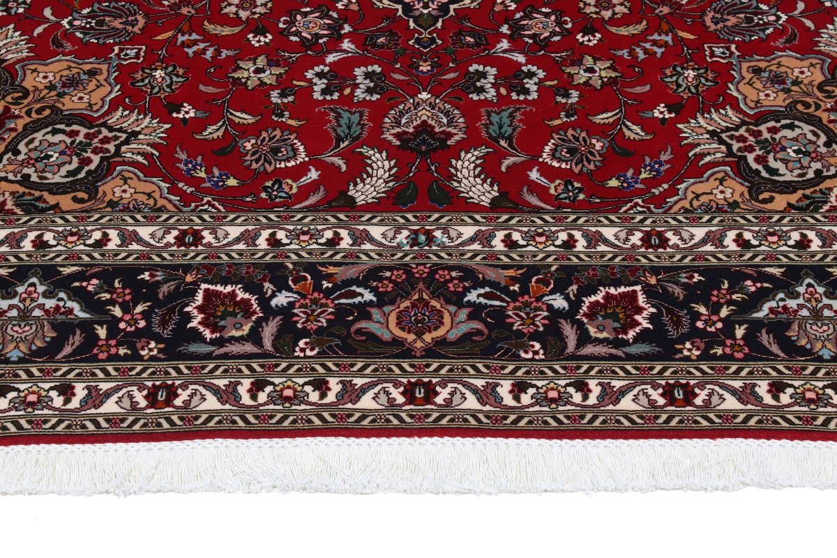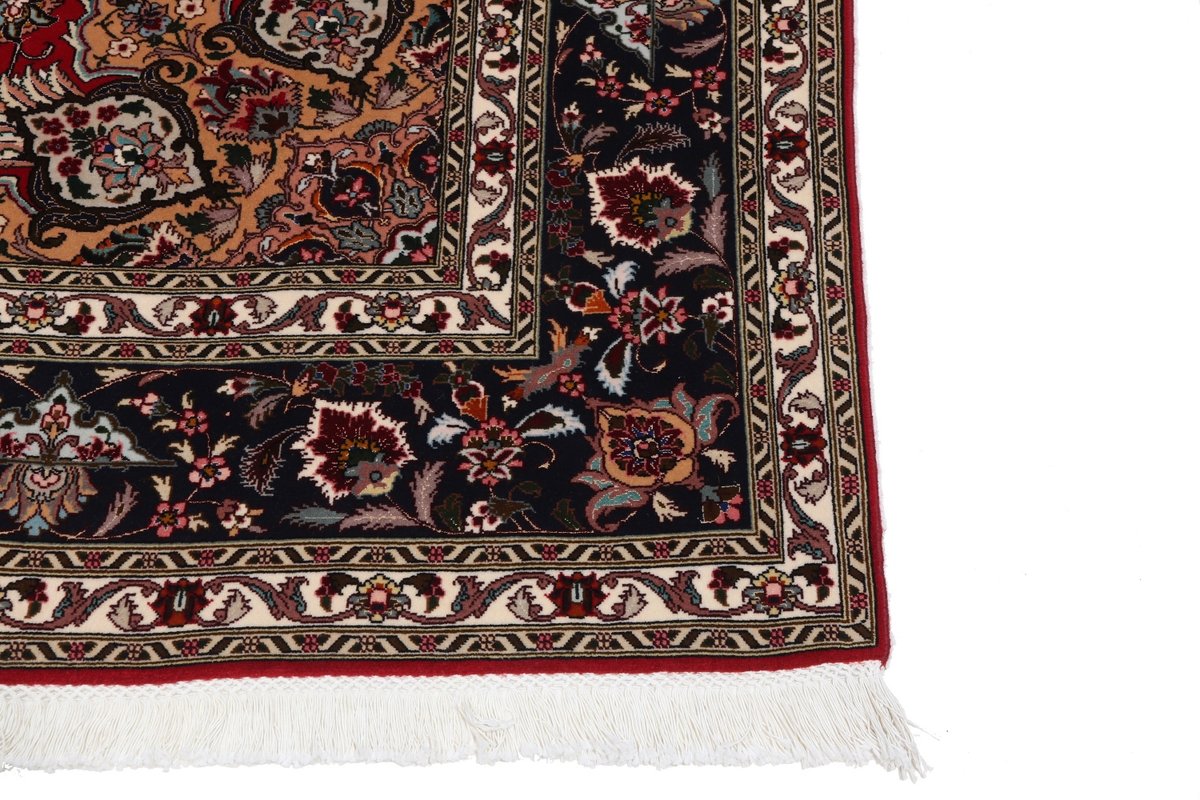Für die besondere Eleganz des Täbriz-Flors sorgen hervorragende Materialien wie samtig anmutende Korkwolle und glänzende Seidenfäden. Die Knüpfqualität eines Täbriz-Teppichs lässt sich aus der angegebenen Raj-Zahl erschließen – je höher diese ausfällt, umso feiner ist die Knüpfdichte, die eine Million und mehr Knoten pro Quadratmeter erreichen kann. Bei besonders feingeknüpften Qualitäten kommt für die Kette statt des üblichen Baumwollgarns sogar Seide zum Einsatz.