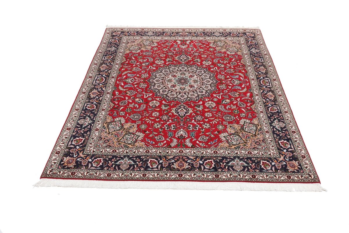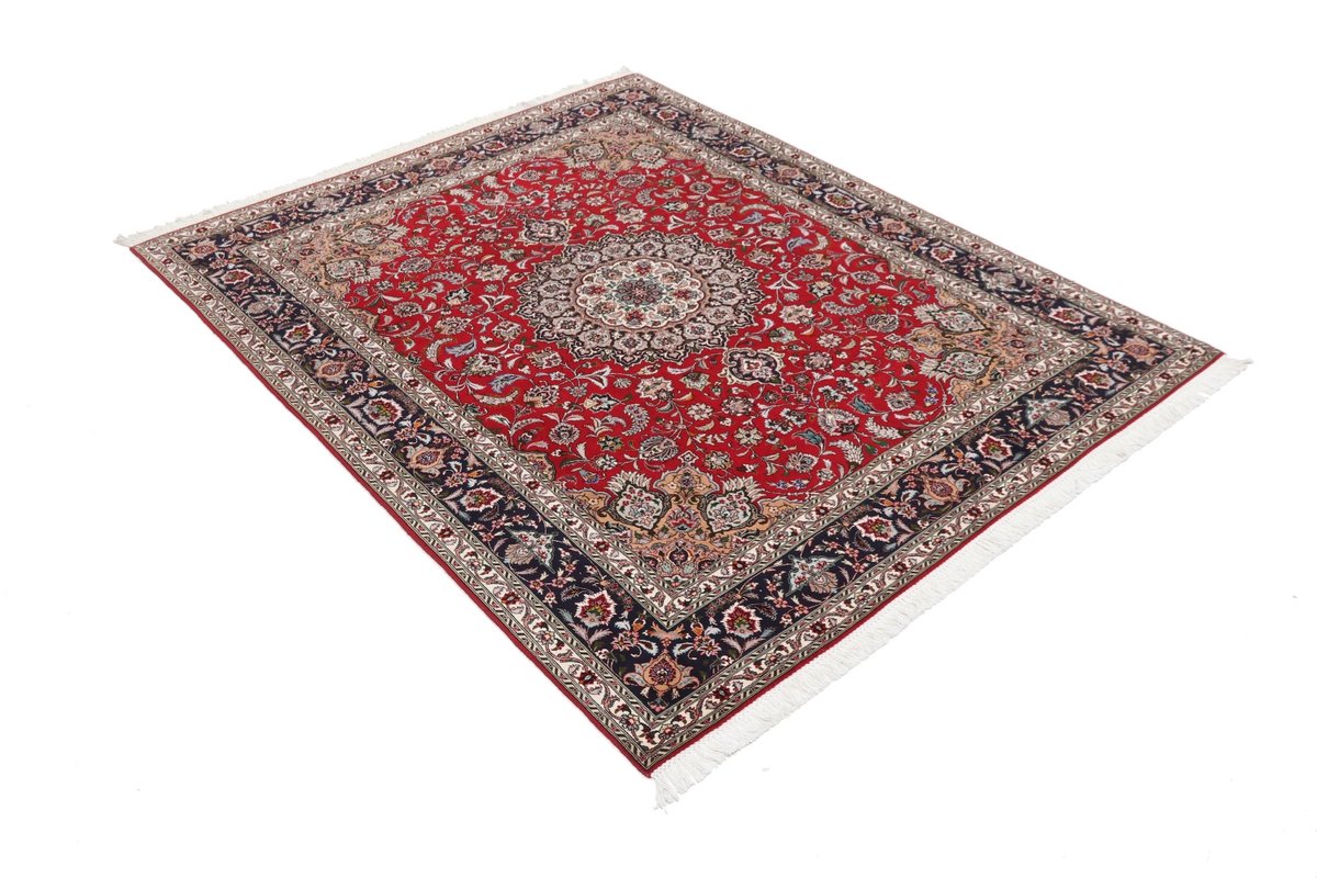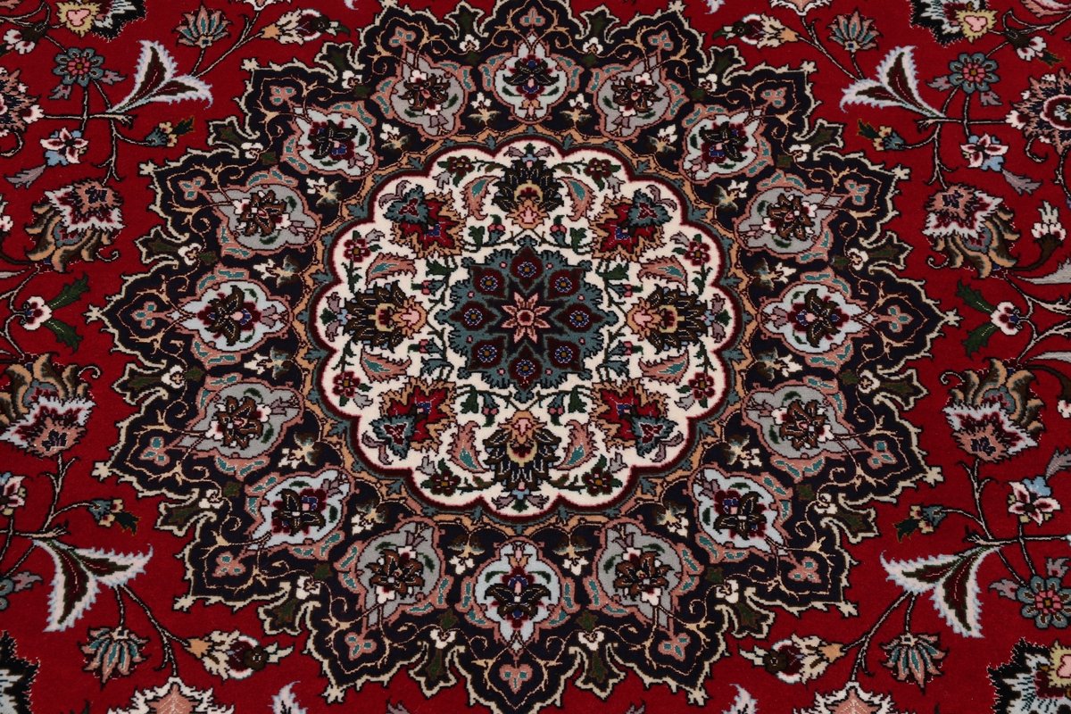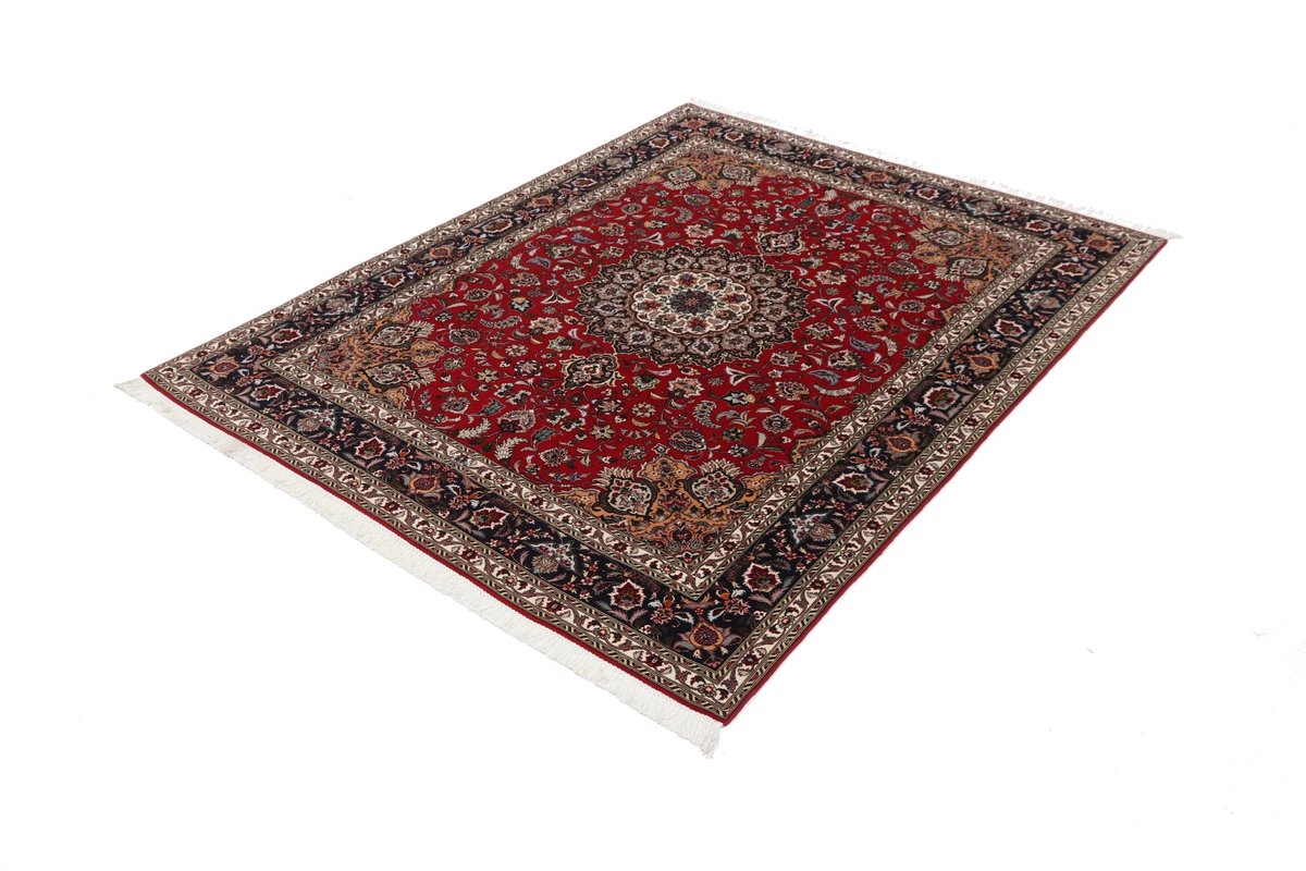 Für die besondere Eleganz des Täbriz-Flors sorgen hervorragende Materialien wie samtig anmutende Korkwolle und glänzende Seidenfäden. Die Knüpfqualität eines Täbriz-Teppichs lässt sich aus der angegebenen Raj-Zahl erschließen – je höher diese ausfällt, umso feiner ist die Knüpfdichte, die eine Million und mehr Knoten pro Quadratmeter erreichen kann. Bei besonders feingeknüpften Qualitäten kommt für die Kette statt des üblichen Baumwollgarns sogar Seide zum Einsatz.
