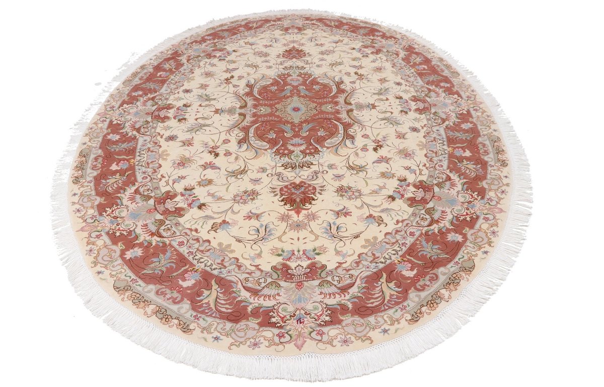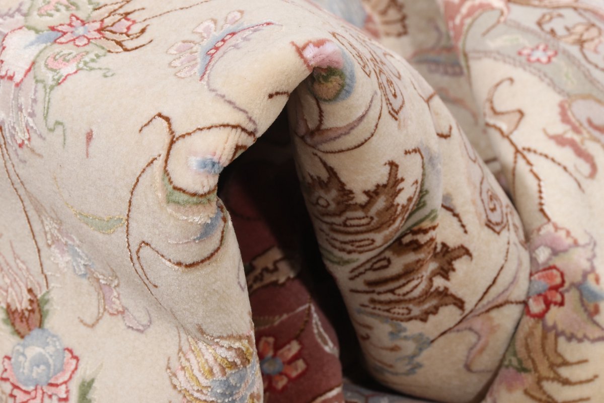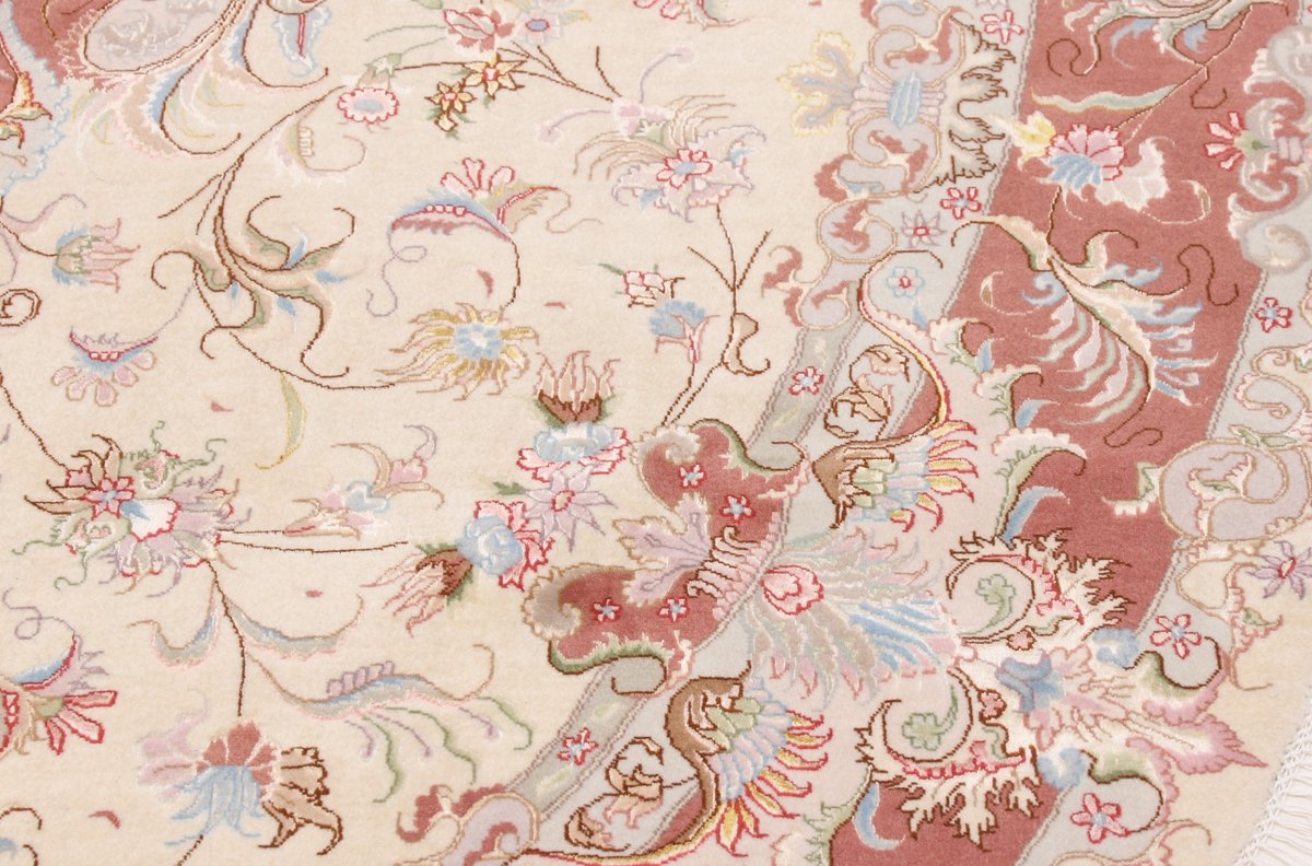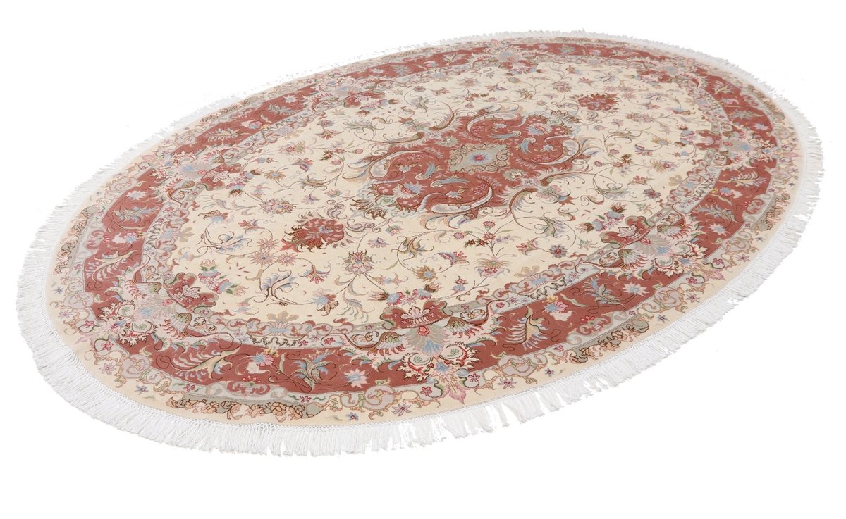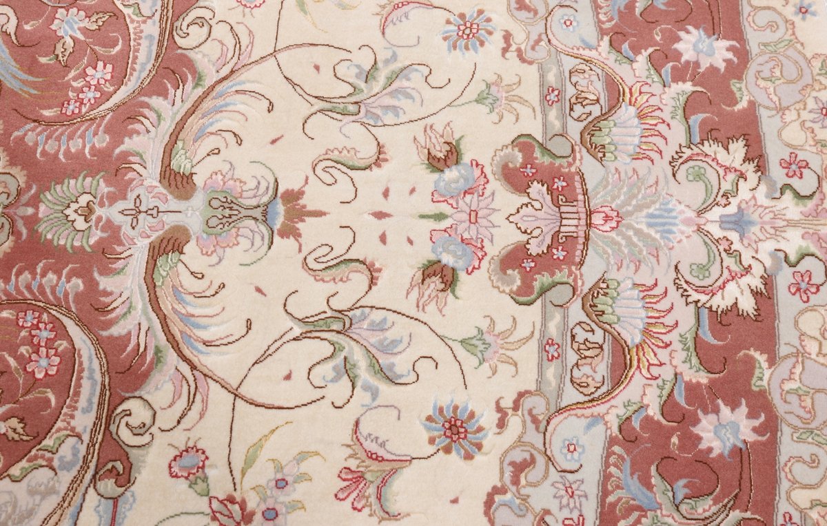Für die besondere Eleganz des Täbriz-Flors sorgen hervorragende Materialien wie samtig anmutende Korkwolle und glänzende Seidenfäden. Die Knüpfqualität eines Täbriz-Teppichs lässt sich aus der angegebenen Raj-Zahl erschließen – je höher diese ausfällt, umso feiner ist die Knüpfdichte, die eine Million und mehr Knoten pro Quadratmeter erreichen kann. Bei besonders feingeknüpften Qualitäten kommt für die Kette statt des üblichen Baumwollgarns sogar Seide zum Einsatz.