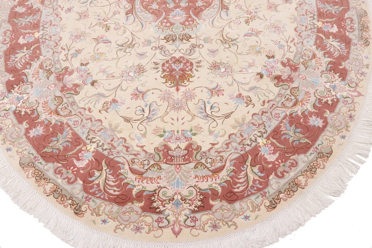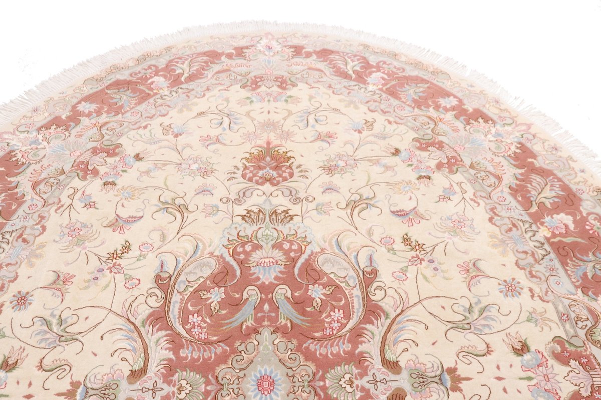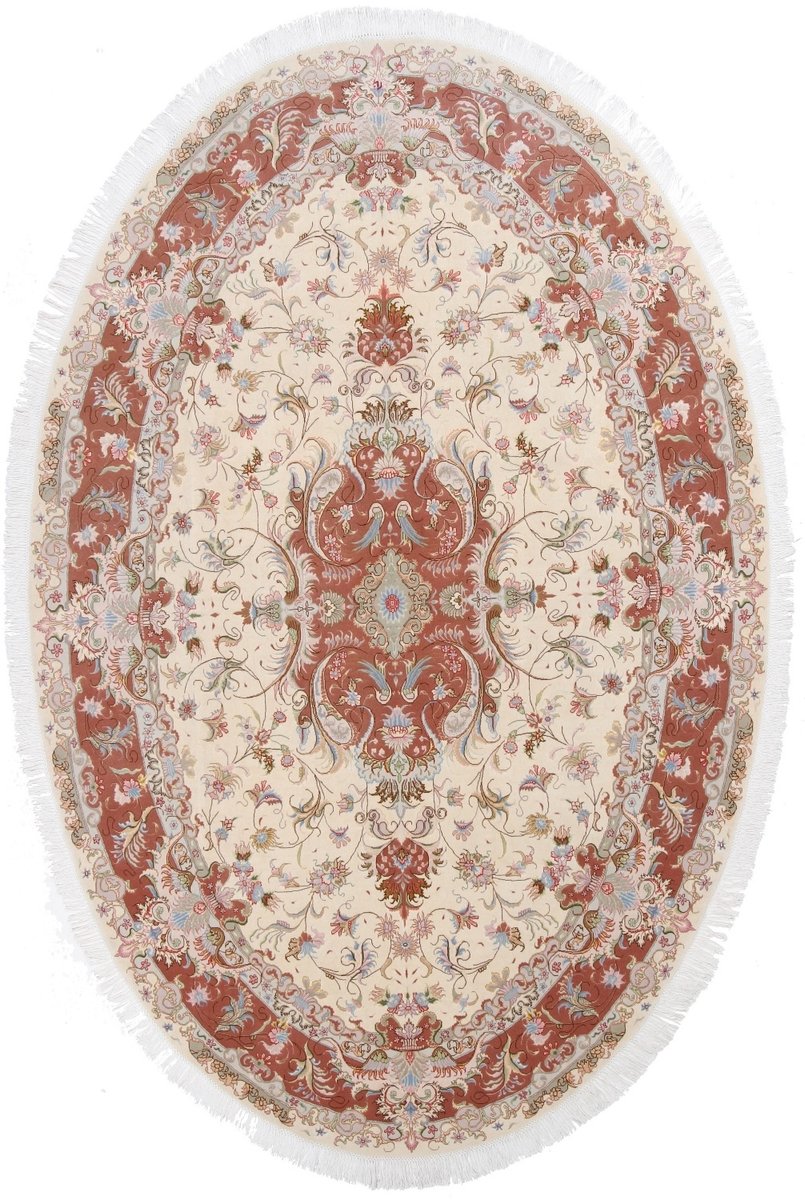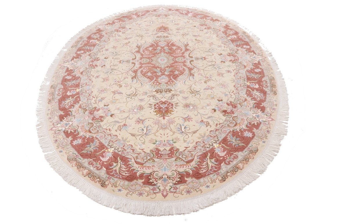 Für die besondere Eleganz des Täbriz-Flors sorgen hervorragende Materialien wie samtig anmutende Korkwolle und glänzende Seidenfäden. Die Knüpfqualität eines Täbriz-Teppichs lässt sich aus der angegebenen Raj-Zahl erschließen – je höher diese ausfällt, umso feiner ist die Knüpfdichte, die eine Million und mehr Knoten pro Quadratmeter erreichen kann. Bei besonders feingeknüpften Qualitäten kommt für die Kette statt des üblichen Baumwollgarns sogar Seide zum Einsatz.