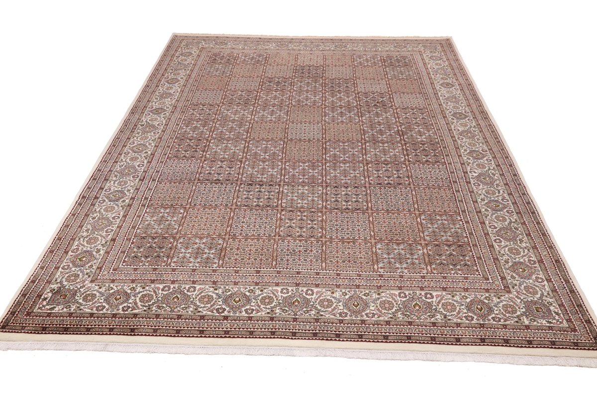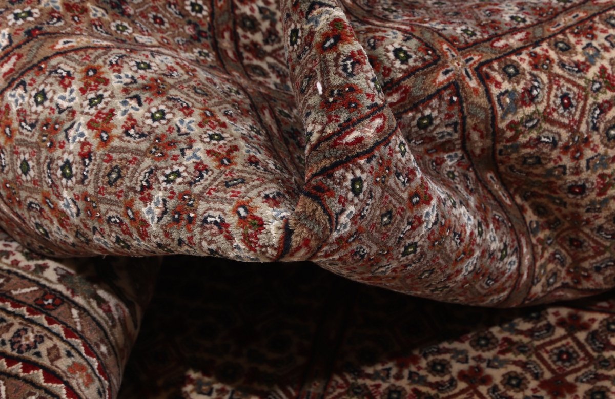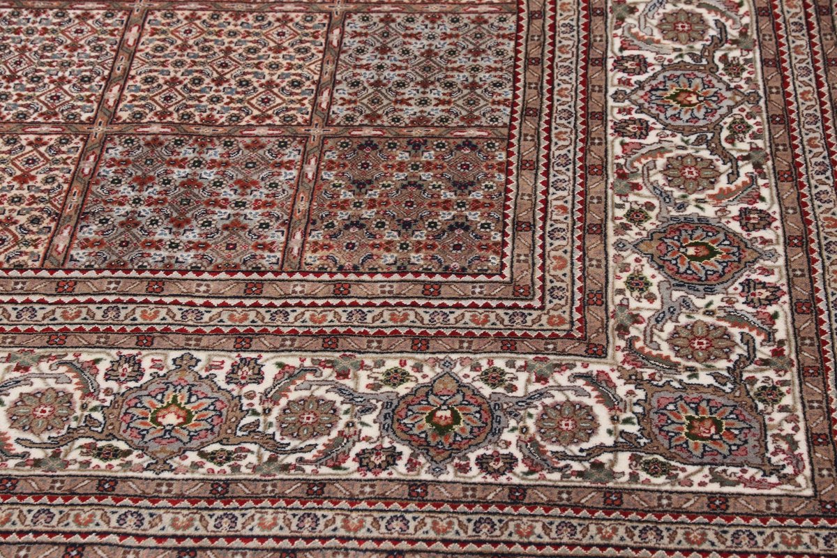 Für die besondere Eleganz des Täbriz-Flors sorgen hervorragende Materialien wie samtig anmutende Korkwolle und glänzende Seidenfäden. Die Knüpfqualität eines Täbriz-Teppichs lässt sich aus der angegebenen Raj-Zahl erschließen – je höher diese ausfällt, umso feiner ist die Knüpfdichte, die eine Million und mehr Knoten pro Quadratmeter erreichen kann. Bei besonders feingeknüpften Qualitäten kommt für die Kette statt des üblichen Baumwollgarns sogar Seide zum Einsatz.