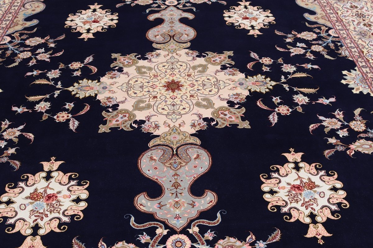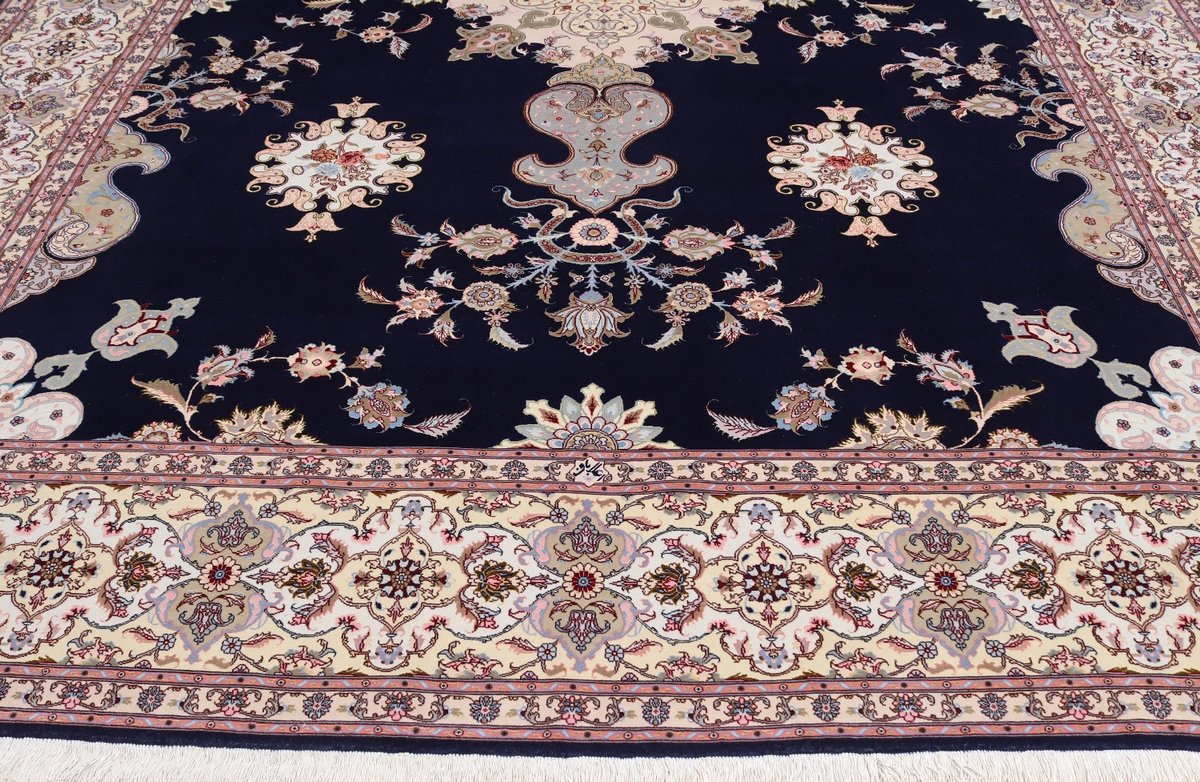 Für die besondere Eleganz des Täbriz-Flors sorgen hervorragende Materialien wie samtig anmutende Korkwolle und glänzende Seidenfäden. Die Knüpfqualität eines Täbriz-Teppichs lässt sich aus der angegebenen Raj-Zahl erschließen – je höher diese ausfällt, umso feiner ist die Knüpfdichte, die eine Million und mehr Knoten pro Quadratmeter erreichen kann. Bei besonders feingeknüpften Qualitäten kommt für die Kette statt des üblichen Baumwollgarns sogar Seide zum Einsatz.
