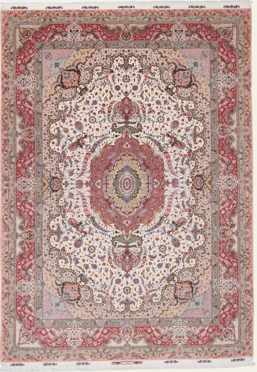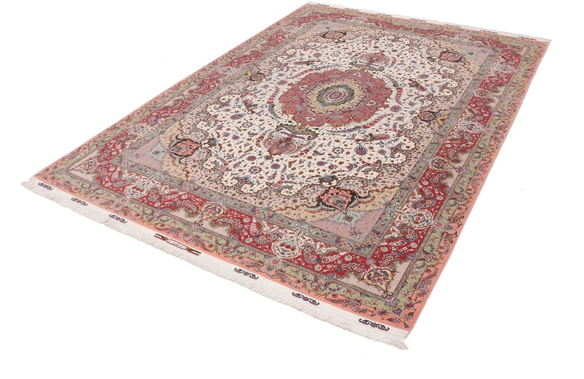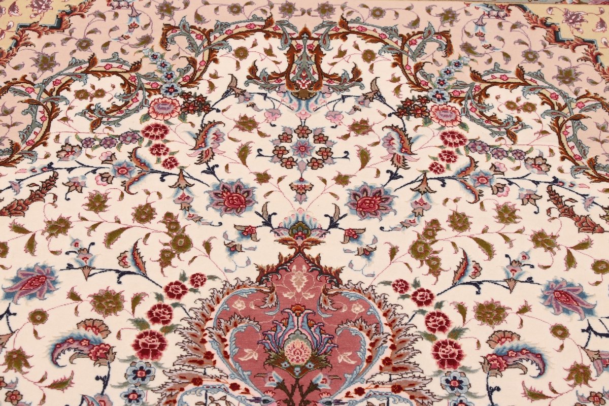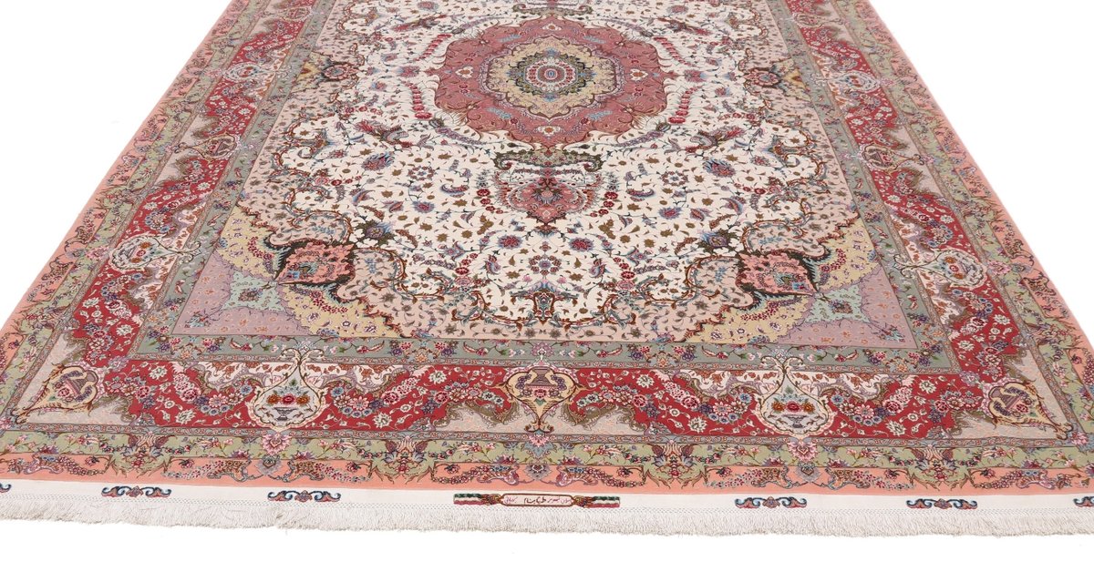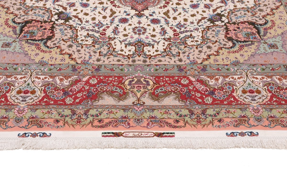 Für die besondere Eleganz des Täbriz-Flors sorgen hervorragende Materialien wie samtig anmutende Korkwolle und glänzende Seidenfäden. Die Knüpfqualität eines Täbriz-Teppichs lässt sich aus der angegebenen Raj-Zahl erschließen – je höher diese ausfällt, umso feiner ist die Knüpfdichte, die eine Million und mehr Knoten pro Quadratmeter erreichen kann. Bei besonders feingeknüpften Qualitäten kommt für die Kette statt des üblichen Baumwollgarns sogar Seide zum Einsatz.