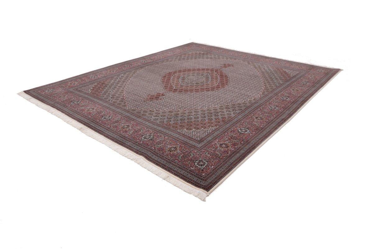 Für die besondere Eleganz des Täbriz-Flors sorgen hervorragende Materialien wie samtig anmutende Korkwolle und glänzende Seidenfäden. Die Knüpfqualität eines Täbriz-Teppichs lässt sich aus der angegebenen Raj-Zahl erschließen – je höher diese ausfällt, umso feiner ist die Knüpfdichte, die eine Million und mehr Knoten pro Quadratmeter erreichen kann. Bei besonders feingeknüpften Qualitäten kommt für die Kette statt des üblichen Baumwollgarns sogar Seide zum Einsatz.