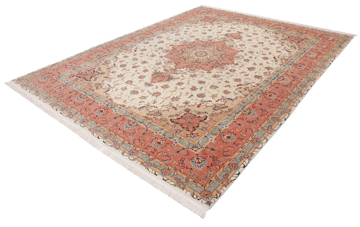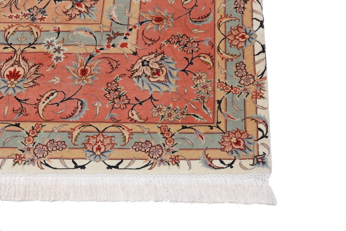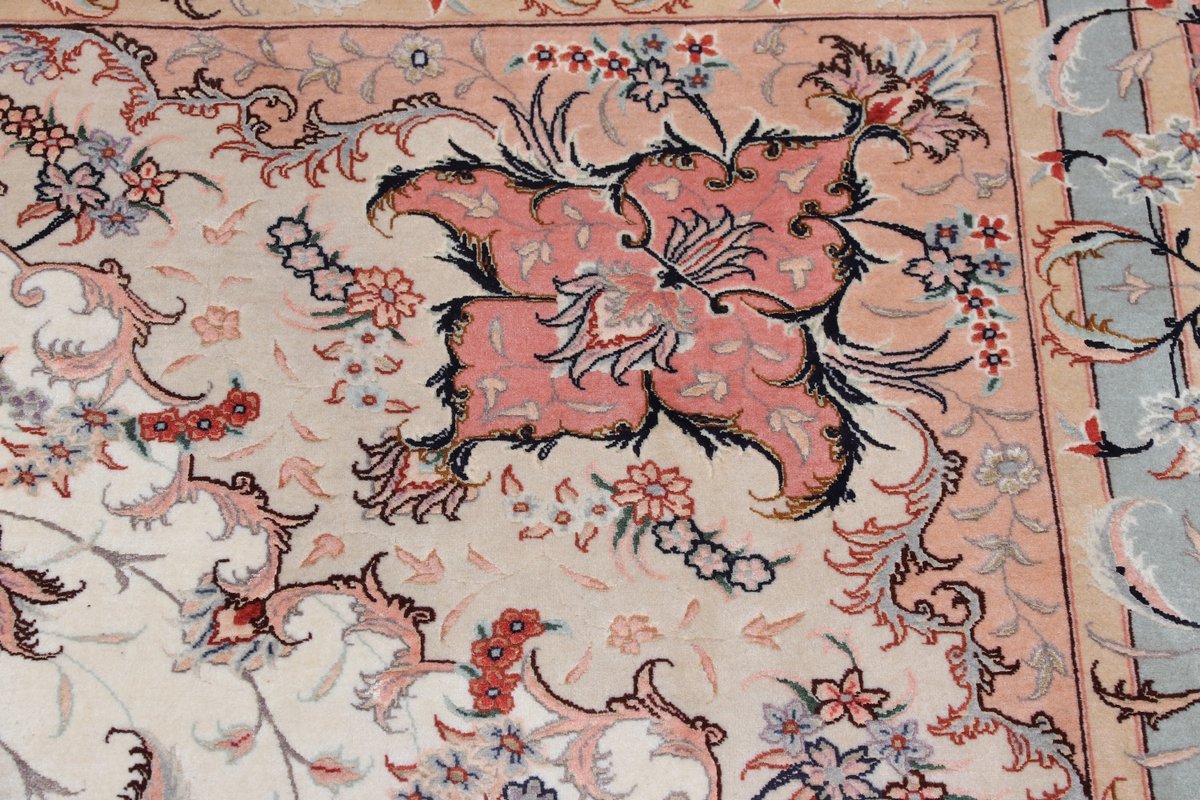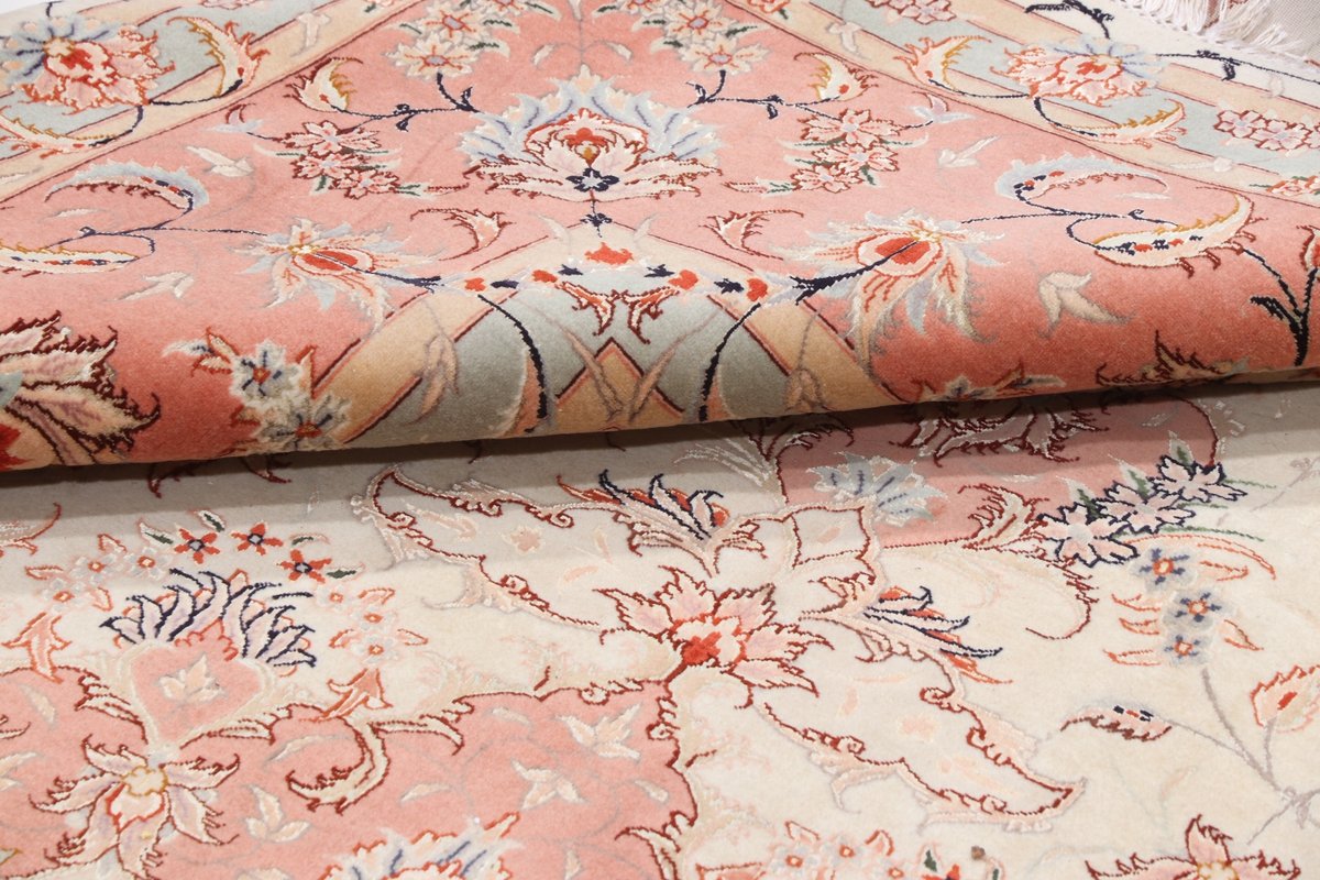 Für die besondere Eleganz des Täbriz-Flors sorgen hervorragende Materialien wie samtig anmutende Korkwolle und glänzende Seidenfäden. Die Knüpfqualität eines Täbriz-Teppichs lässt sich aus der angegebenen Raj-Zahl erschließen – je höher diese ausfällt, umso feiner ist die Knüpfdichte, die eine Million und mehr Knoten pro Quadratmeter erreichen kann. Bei besonders feingeknüpften Qualitäten kommt für die Kette statt des üblichen Baumwollgarns sogar Seide zum Einsatz.