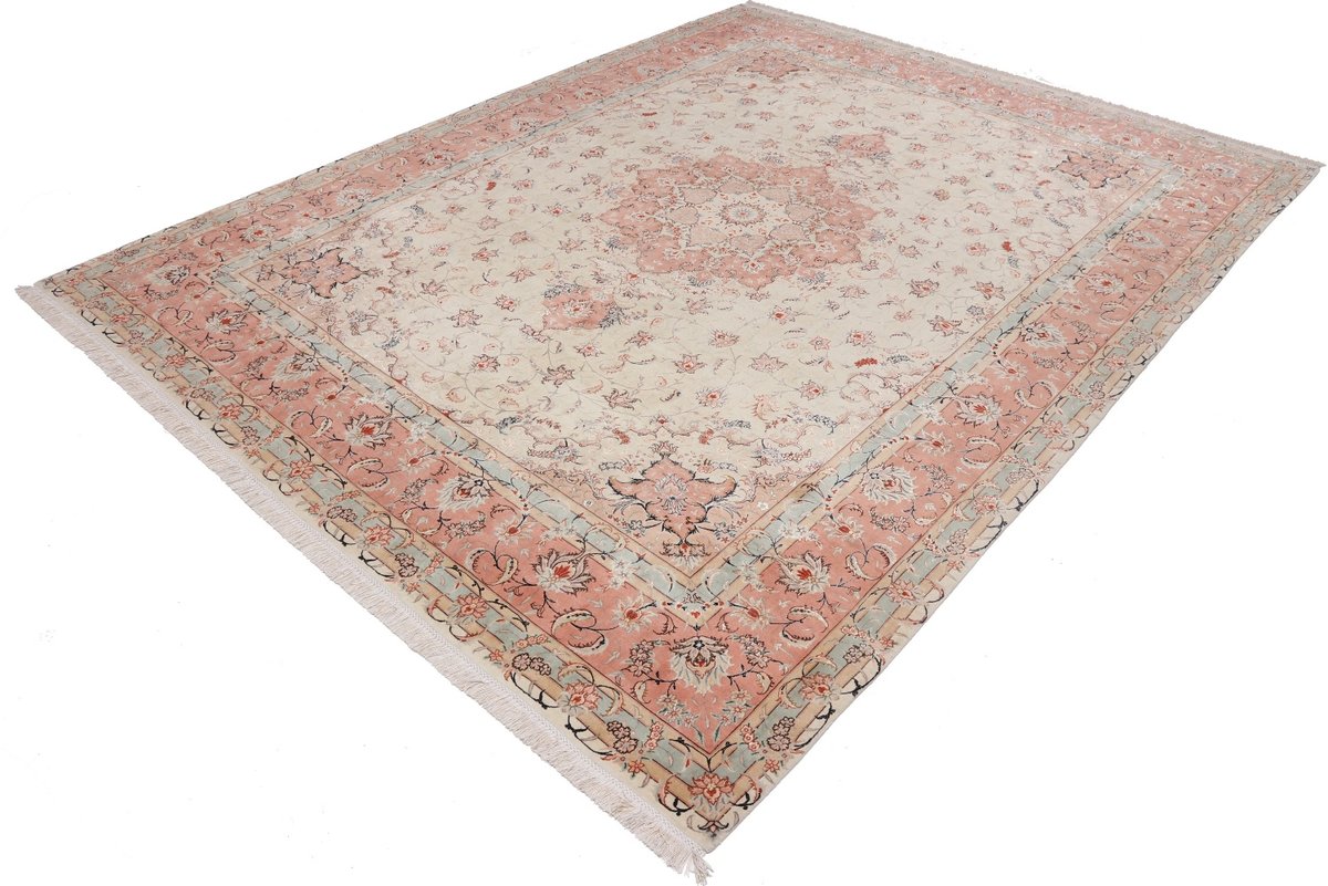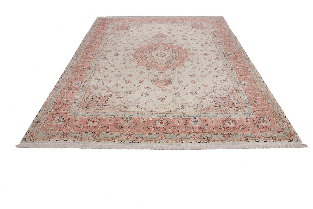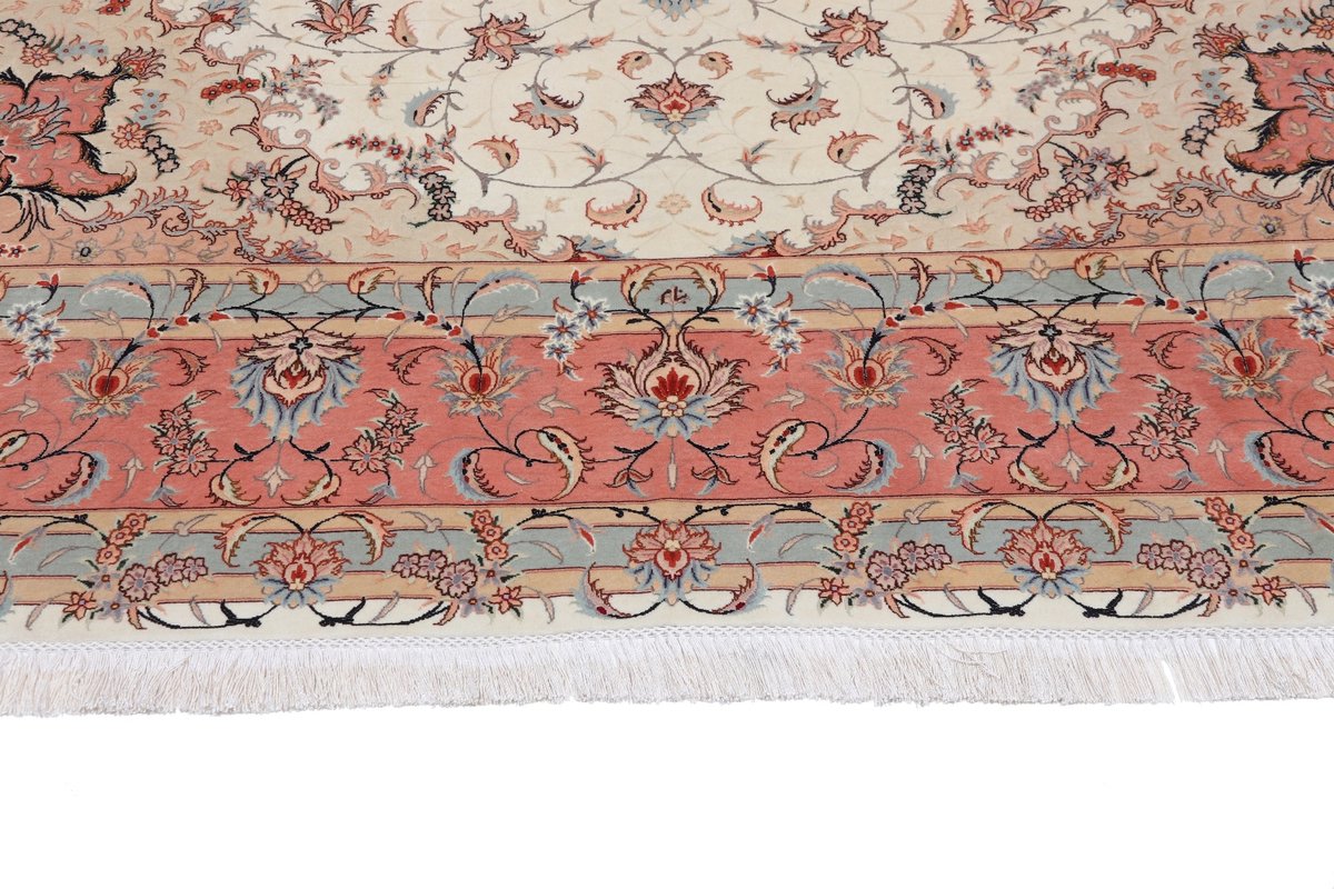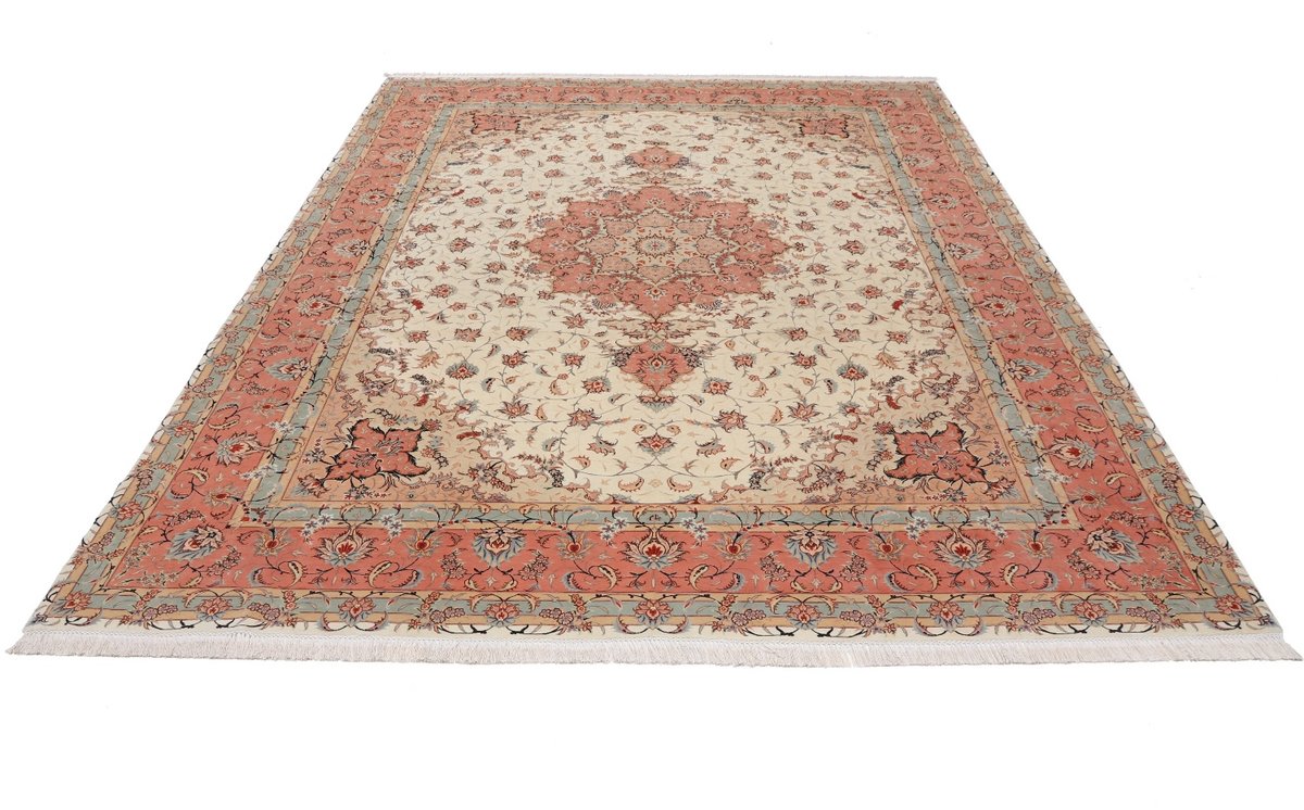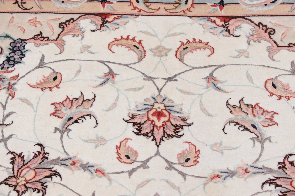 Für die besondere Eleganz des Täbriz-Flors sorgen hervorragende Materialien wie samtig anmutende Korkwolle und glänzende Seidenfäden. Die Knüpfqualität eines Täbriz-Teppichs lässt sich aus der angegebenen Raj-Zahl erschließen – je höher diese ausfällt, umso feiner ist die Knüpfdichte, die eine Million und mehr Knoten pro Quadratmeter erreichen kann. Bei besonders feingeknüpften Qualitäten kommt für die Kette statt des üblichen Baumwollgarns sogar Seide zum Einsatz.
