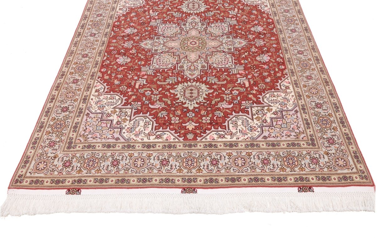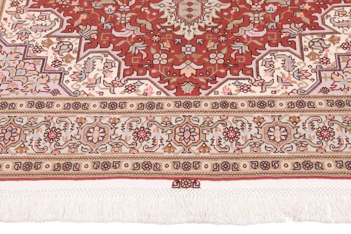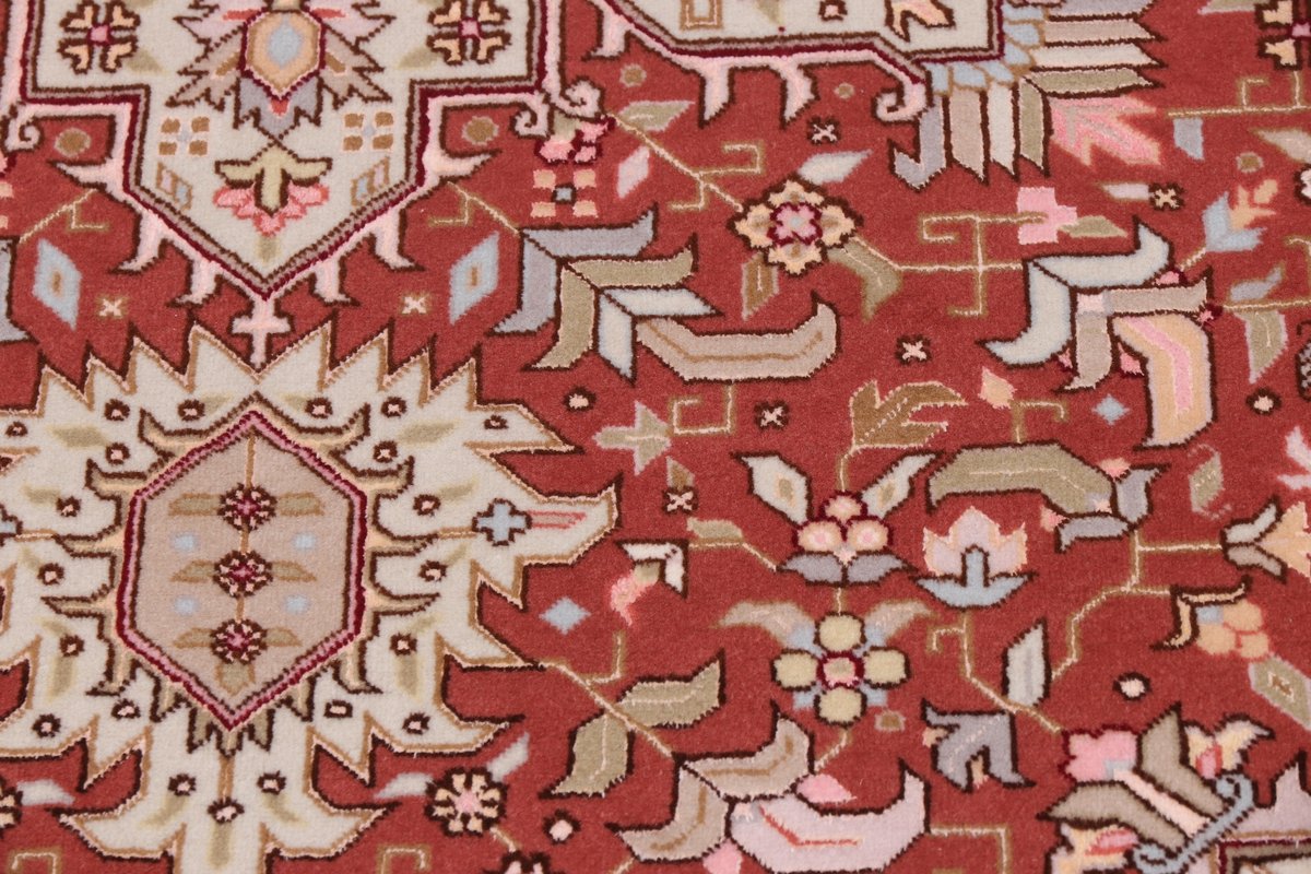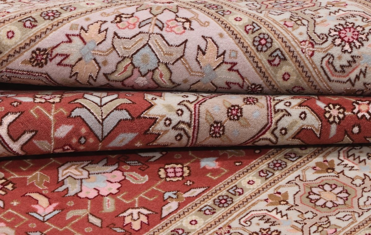 Für die besondere Eleganz des Täbriz-Flors sorgen hervorragende Materialien wie samtig anmutende Korkwolle und glänzende Seidenfäden. Die Knüpfqualität eines Täbriz-Teppichs lässt sich aus der angegebenen Raj-Zahl erschließen – je höher diese ausfällt, umso feiner ist die Knüpfdichte, die eine Million und mehr Knoten pro Quadratmeter erreichen kann. Bei besonders feingeknüpften Qualitäten kommt für die Kette statt des üblichen Baumwollgarns sogar Seide zum Einsatz.