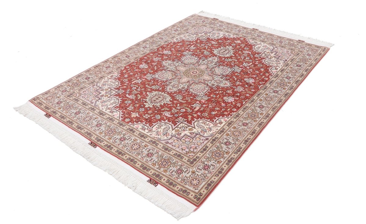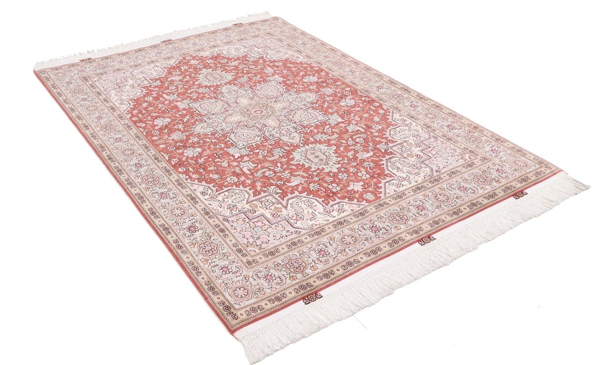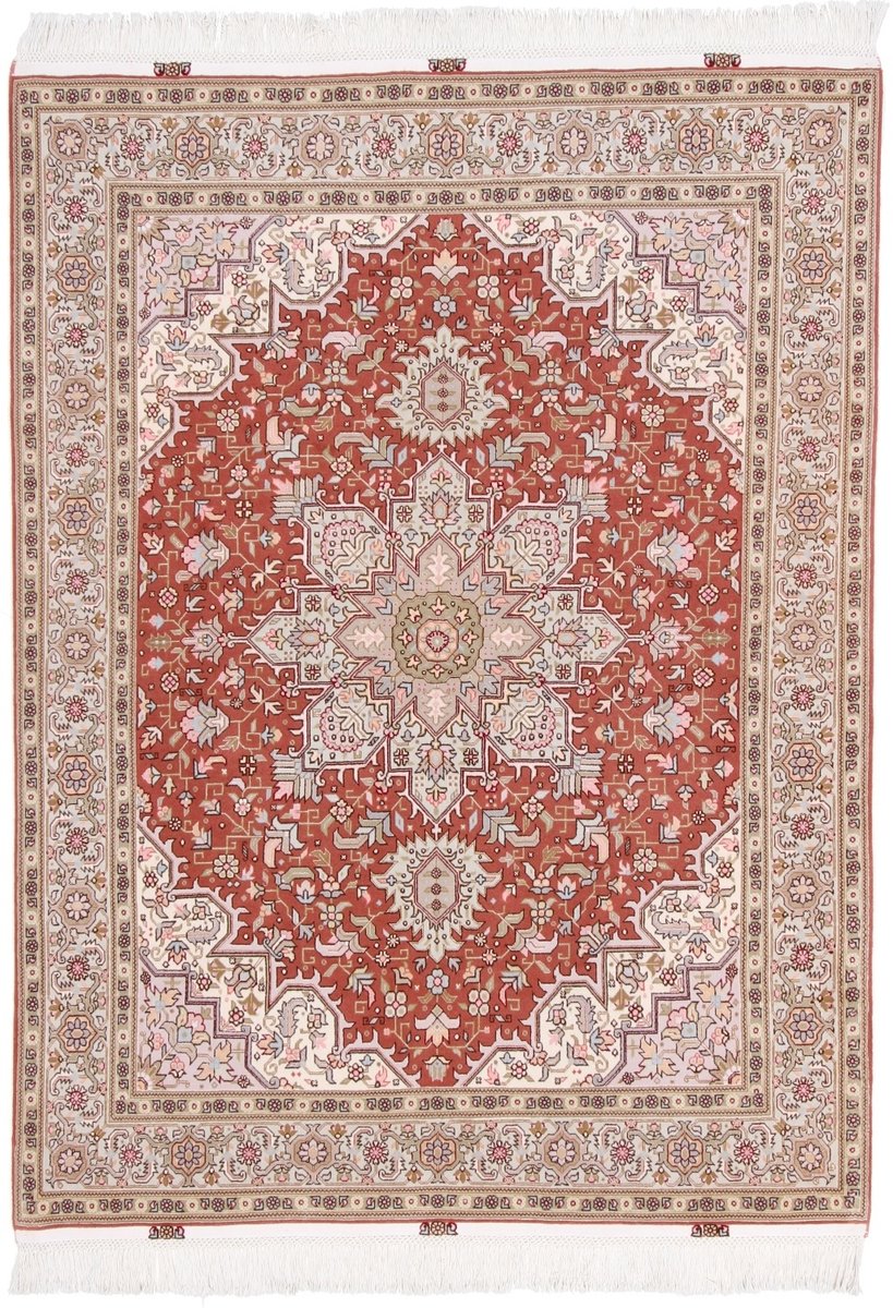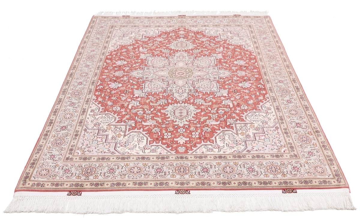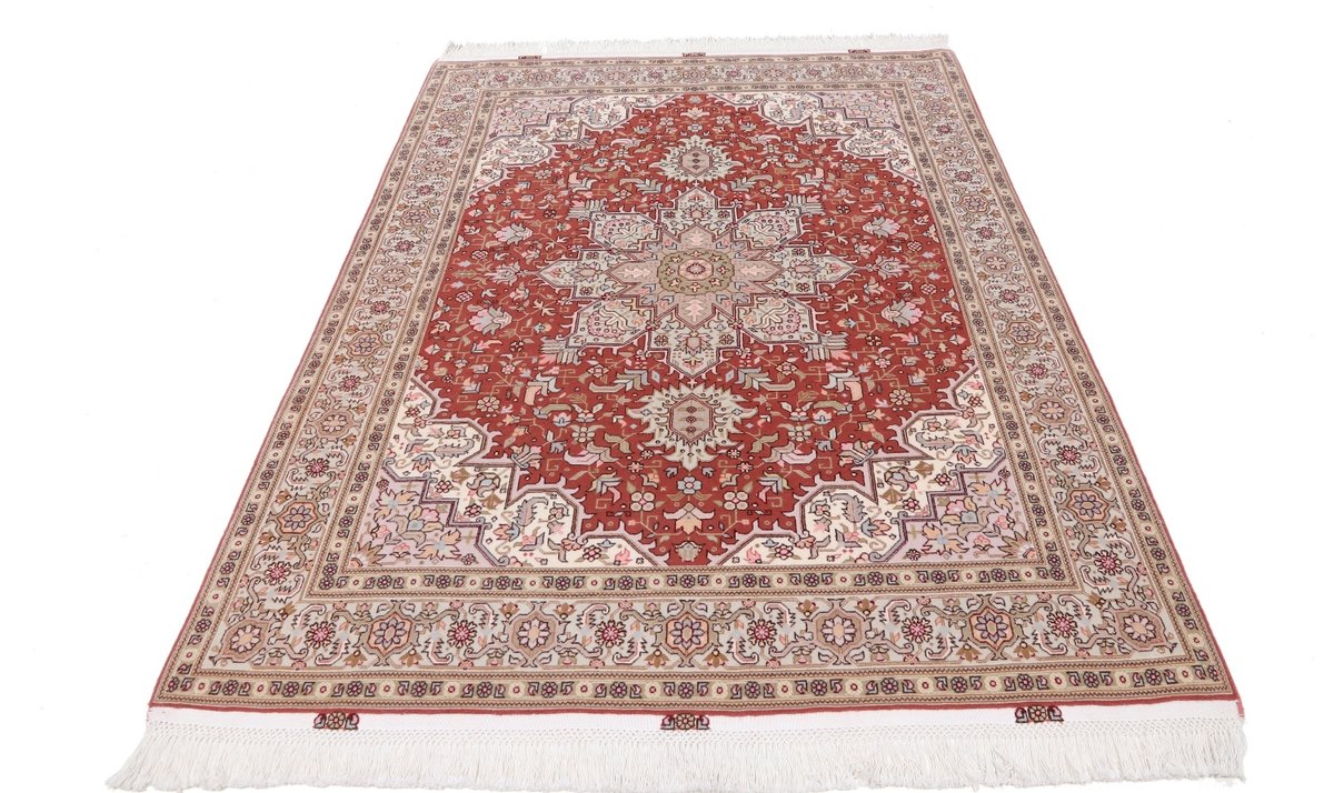 Für die besondere Eleganz des Täbriz-Flors sorgen hervorragende Materialien wie samtig anmutende Korkwolle und glänzende Seidenfäden. Die Knüpfqualität eines Täbriz-Teppichs lässt sich aus der angegebenen Raj-Zahl erschließen – je höher diese ausfällt, umso feiner ist die Knüpfdichte, die eine Million und mehr Knoten pro Quadratmeter erreichen kann. Bei besonders feingeknüpften Qualitäten kommt für die Kette statt des üblichen Baumwollgarns sogar Seide zum Einsatz.