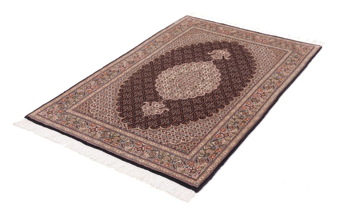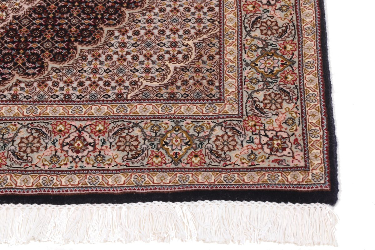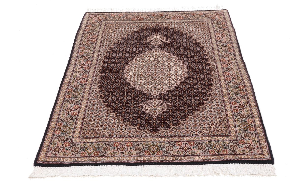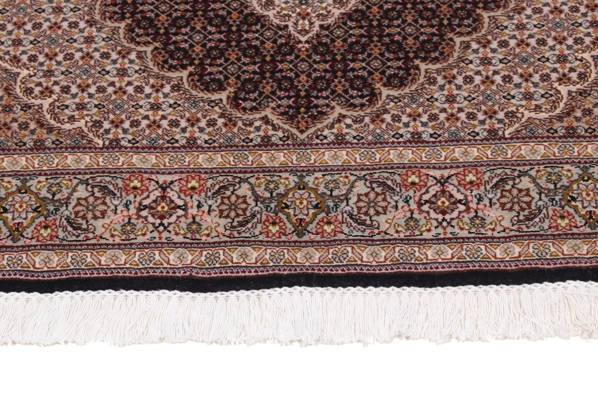 Für die besondere Eleganz des Täbriz-Flors sorgen hervorragende Materialien wie samtig anmutende Korkwolle und glänzende Seidenfäden. Die Knüpfqualität eines Täbriz-Teppichs lässt sich aus der angegebenen Raj-Zahl erschließen – je höher diese ausfällt, umso feiner ist die Knüpfdichte, die eine Million und mehr Knoten pro Quadratmeter erreichen kann. Bei besonders feingeknüpften Qualitäten kommt für die Kette statt des üblichen Baumwollgarns sogar Seide zum Einsatz.