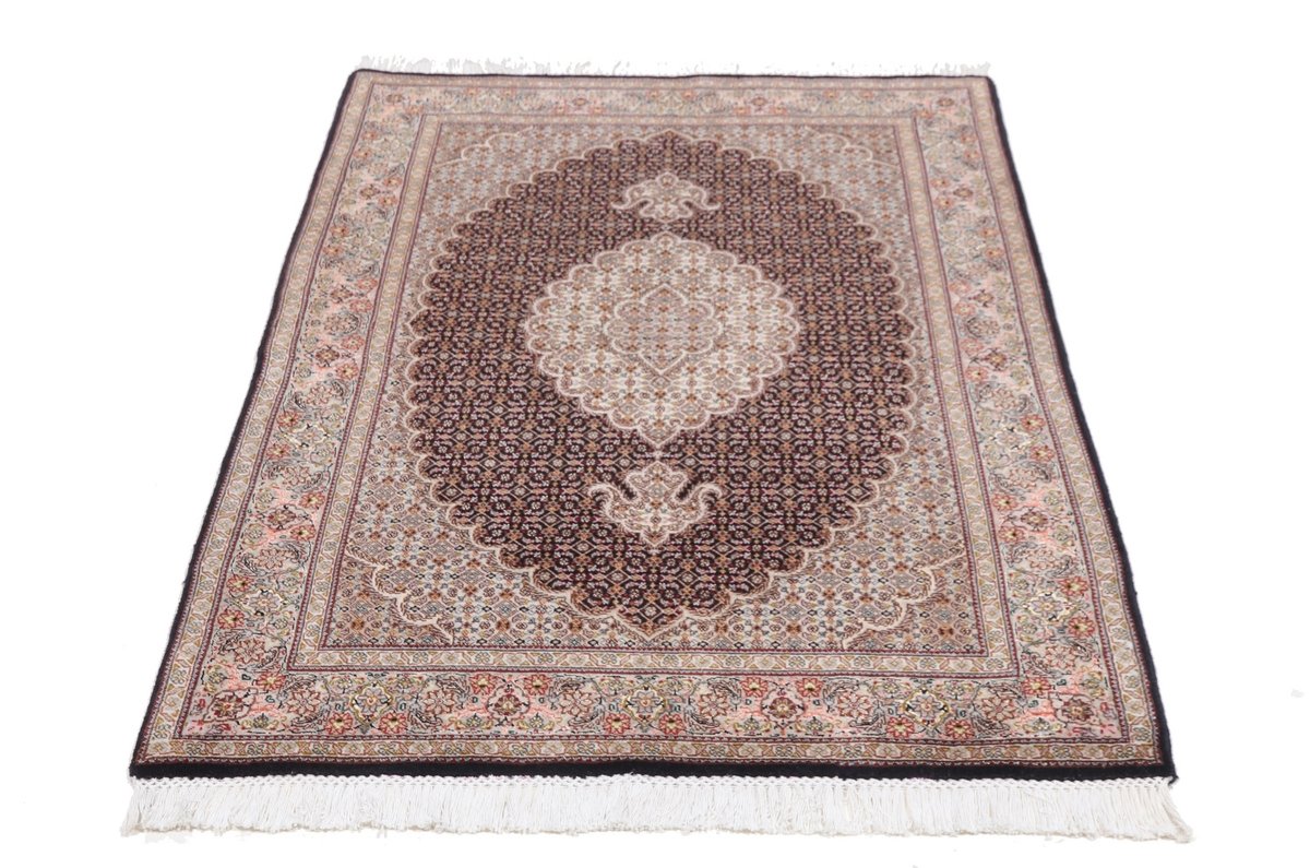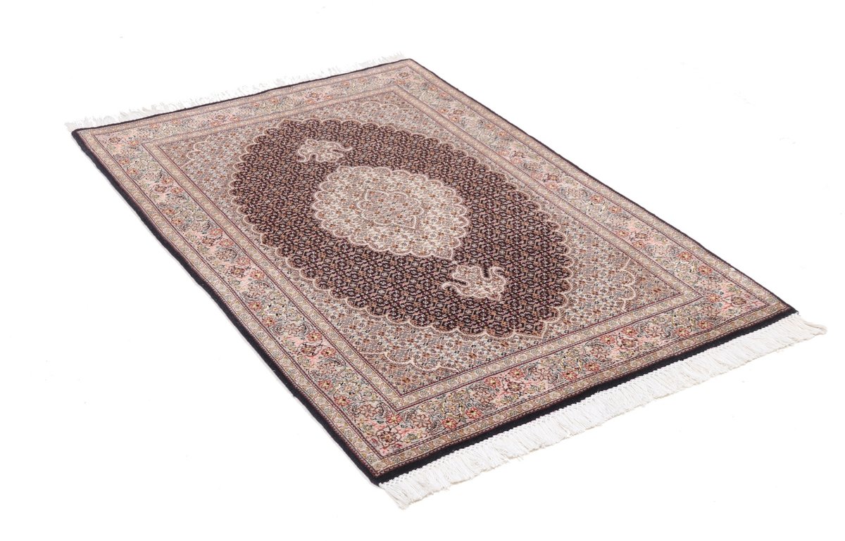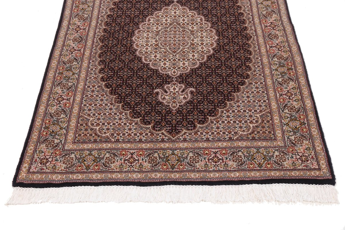 Für die besondere Eleganz des Täbriz-Flors sorgen hervorragende Materialien wie samtig anmutende Korkwolle und glänzende Seidenfäden. Die Knüpfqualität eines Täbriz-Teppichs lässt sich aus der angegebenen Raj-Zahl erschließen – je höher diese ausfällt, umso feiner ist die Knüpfdichte, die eine Million und mehr Knoten pro Quadratmeter erreichen kann. Bei besonders feingeknüpften Qualitäten kommt für die Kette statt des üblichen Baumwollgarns sogar Seide zum Einsatz.