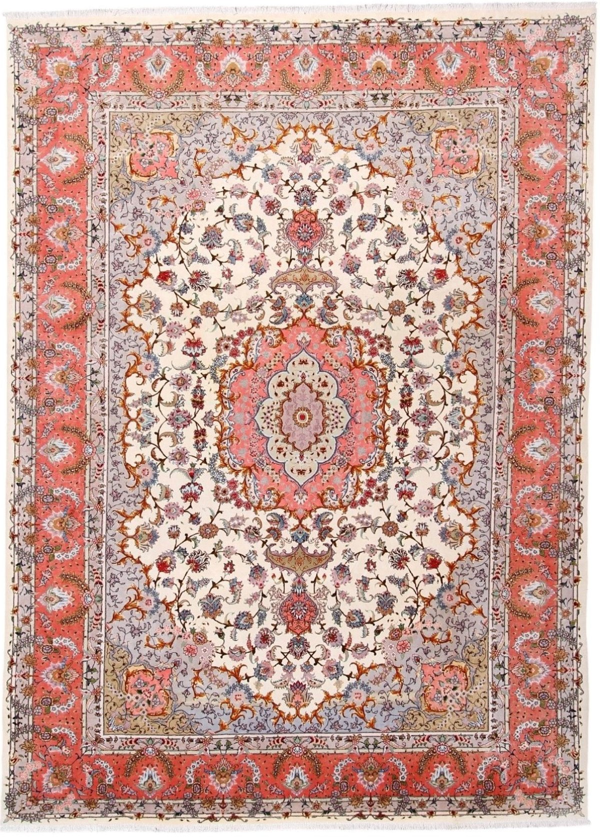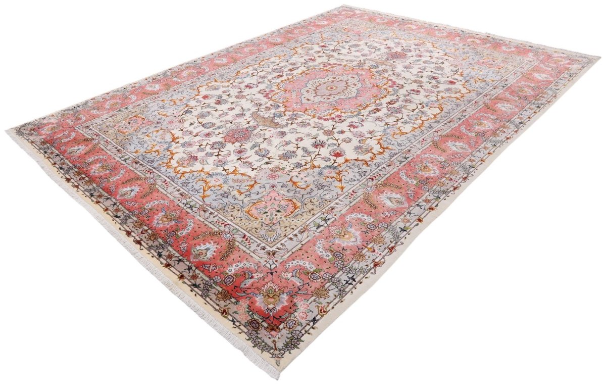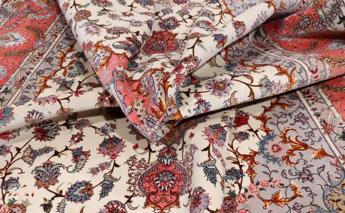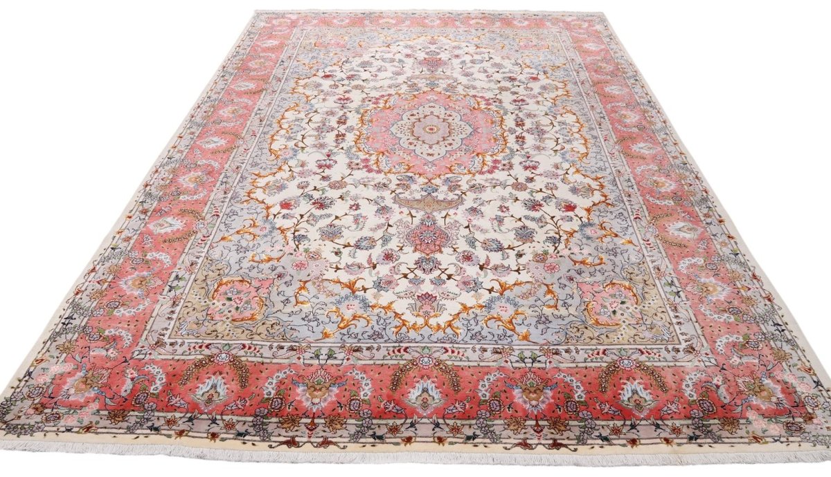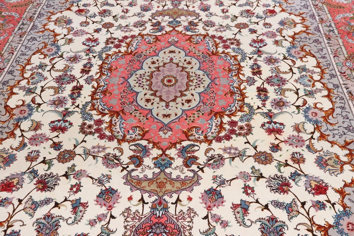 Für die besondere Eleganz des Täbriz-Flors sorgen hervorragende Materialien wie samtig anmutende Korkwolle und glänzende Seidenfäden. Die Knüpfqualität eines Täbriz-Teppichs lässt sich aus der angegebenen Raj-Zahl erschließen – je höher diese ausfällt, umso feiner ist die Knüpfdichte, die eine Million und mehr Knoten pro Quadratmeter erreichen kann. Bei besonders feingeknüpften Qualitäten kommt für die Kette statt des üblichen Baumwollgarns sogar Seide zum Einsatz.