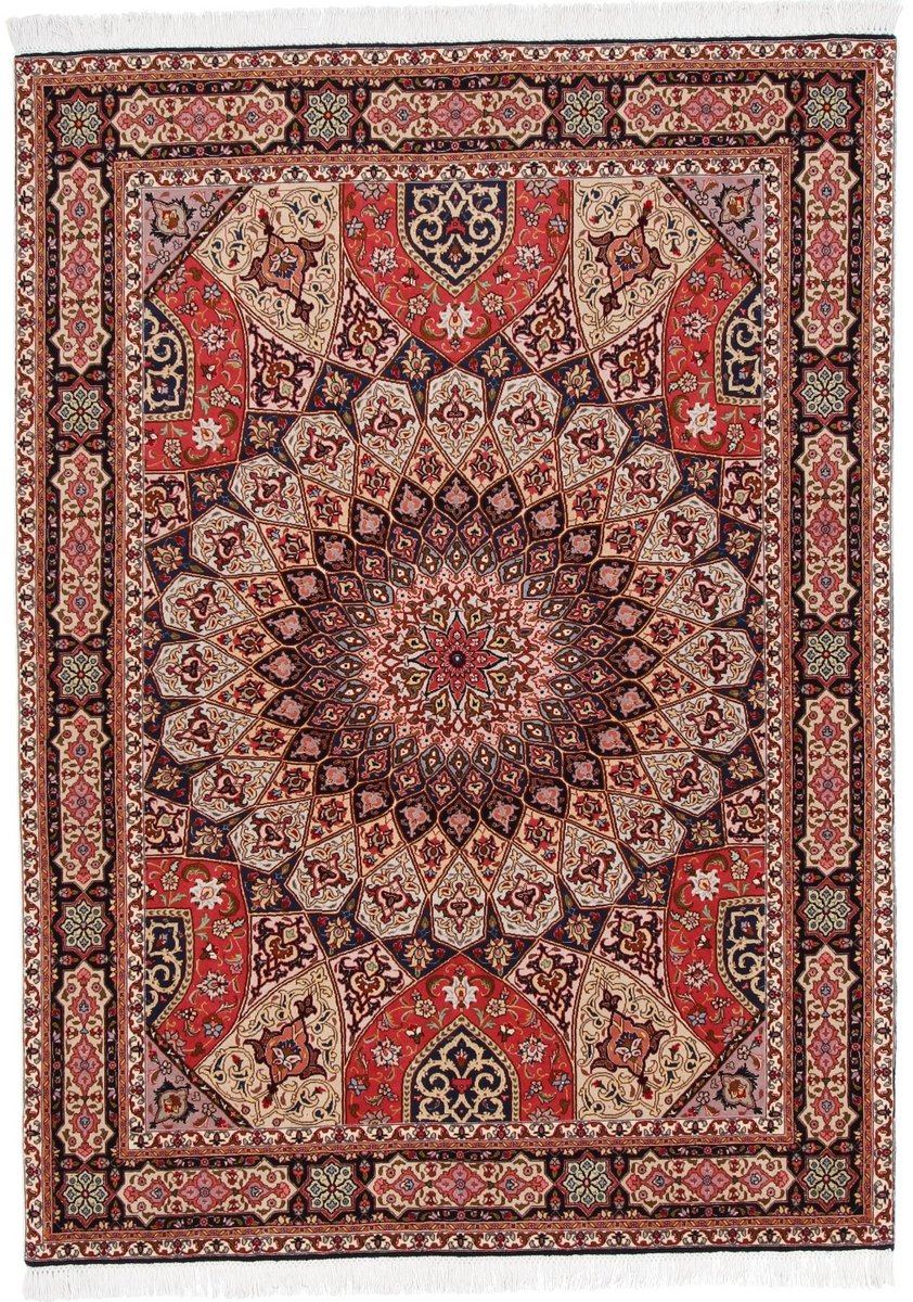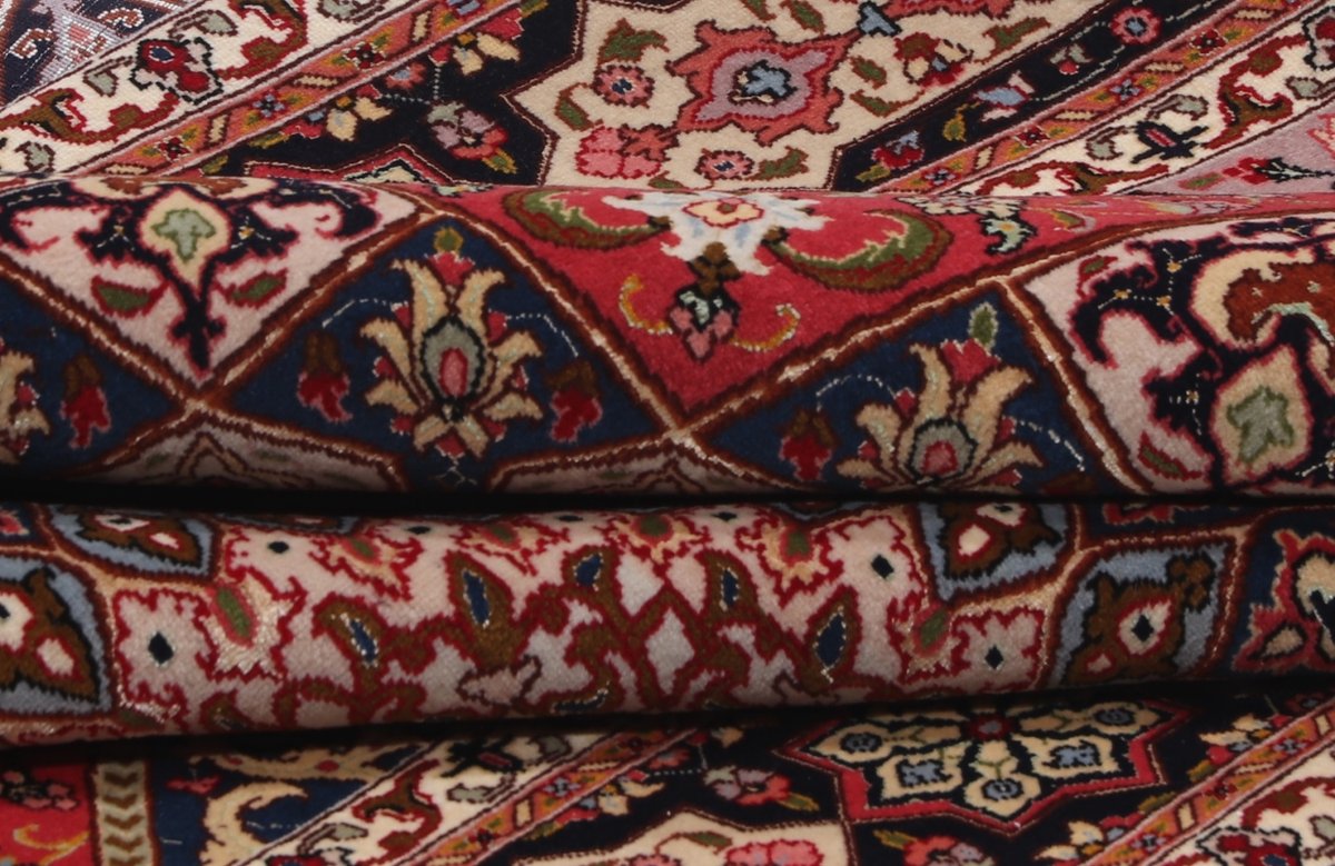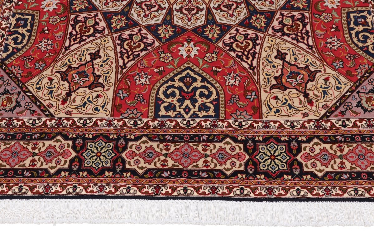 Für die besondere Eleganz des Täbriz-Flors sorgen hervorragende Materialien wie samtig anmutende Korkwolle und glänzende Seidenfäden. Die Knüpfqualität eines Täbriz-Teppichs lässt sich aus der angegebenen Raj-Zahl erschließen – je höher diese ausfällt, umso feiner ist die Knüpfdichte, die eine Million und mehr Knoten pro Quadratmeter erreichen kann. Bei besonders feingeknüpften Qualitäten kommt für die Kette statt des üblichen Baumwollgarns sogar Seide zum Einsatz.
