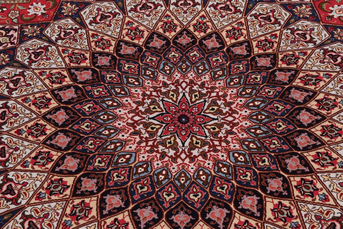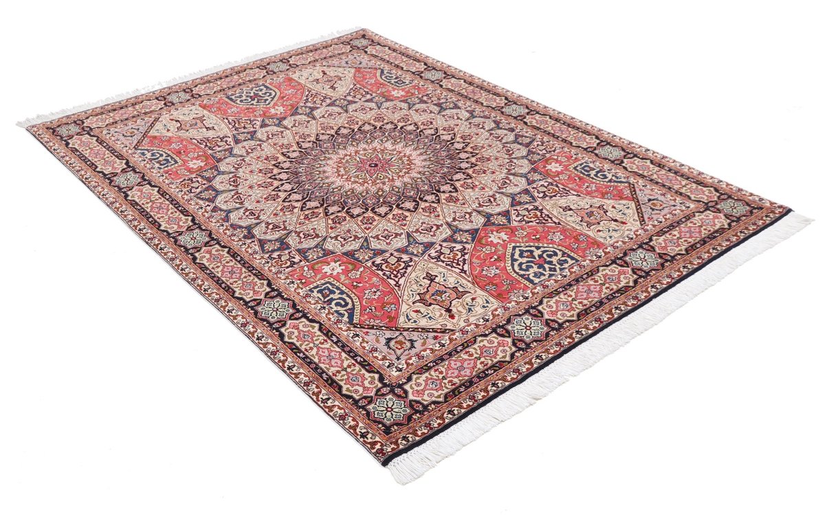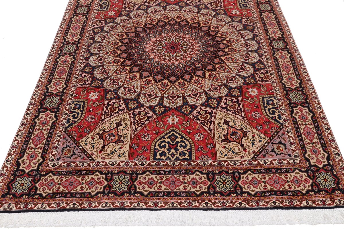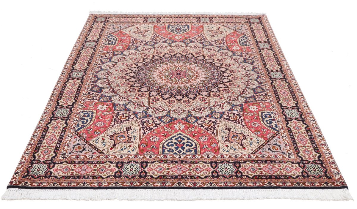 Für die besondere Eleganz des Täbriz-Flors sorgen hervorragende Materialien wie samtig anmutende Korkwolle und glänzende Seidenfäden. Die Knüpfqualität eines Täbriz-Teppichs lässt sich aus der angegebenen Raj-Zahl erschließen – je höher diese ausfällt, umso feiner ist die Knüpfdichte, die eine Million und mehr Knoten pro Quadratmeter erreichen kann. Bei besonders feingeknüpften Qualitäten kommt für die Kette statt des üblichen Baumwollgarns sogar Seide zum Einsatz.