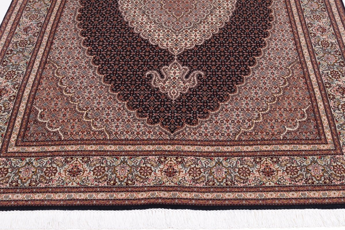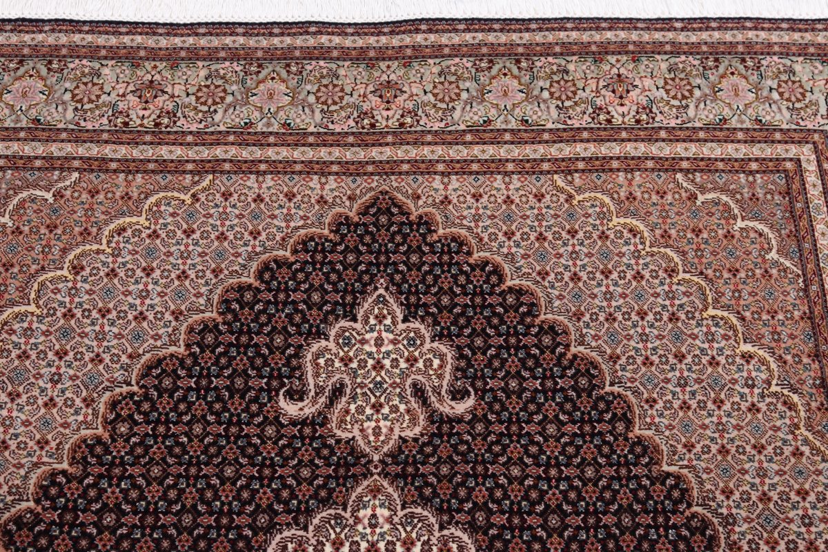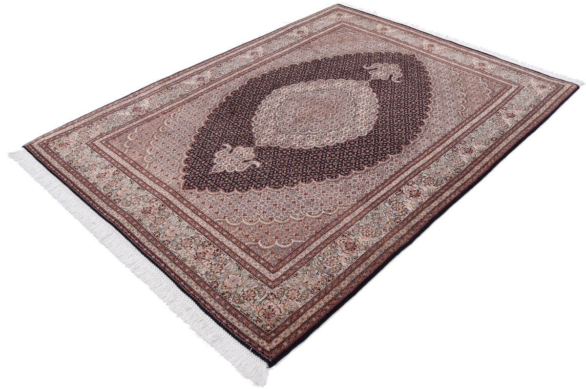 Für die besondere Eleganz des Täbriz-Flors sorgen hervorragende Materialien wie samtig anmutende Korkwolle und glänzende Seidenfäden. Die Knüpfqualität eines Täbriz-Teppichs lässt sich aus der angegebenen Raj-Zahl erschließen – je höher diese ausfällt, umso feiner ist die Knüpfdichte, die eine Million und mehr Knoten pro Quadratmeter erreichen kann. Bei besonders feingeknüpften Qualitäten kommt für die Kette statt des üblichen Baumwollgarns sogar Seide zum Einsatz.