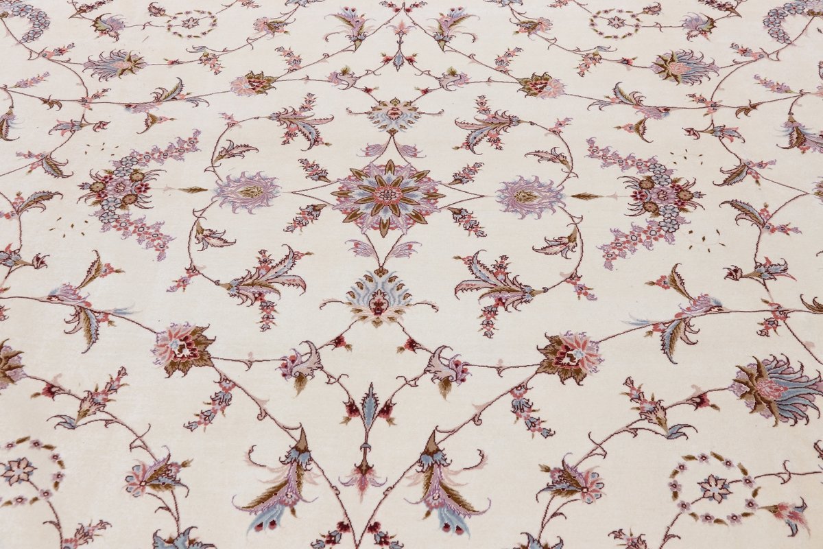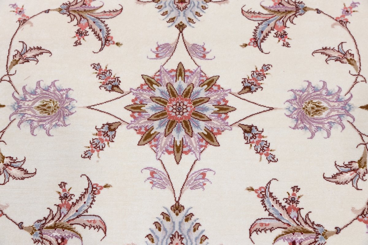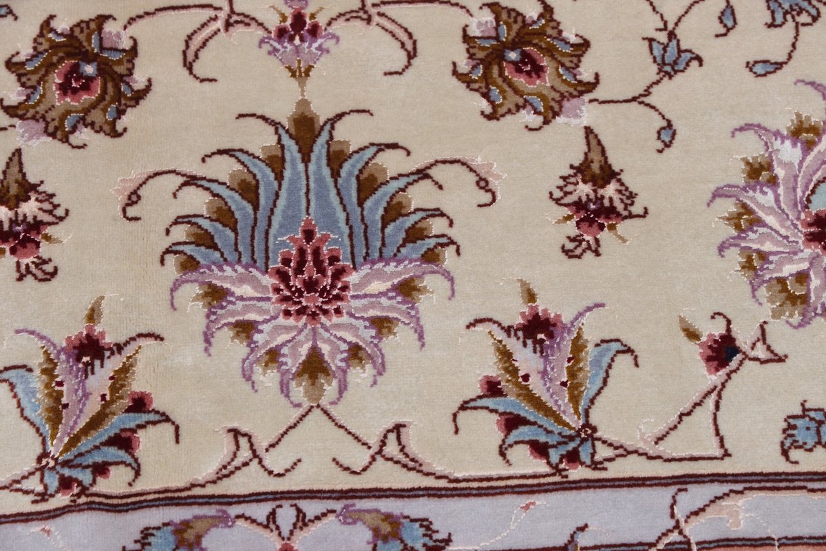 Für die besondere Eleganz des Täbriz-Flors sorgen hervorragende Materialien wie samtig anmutende Korkwolle und glänzende Seidenfäden. Die Knüpfqualität eines Täbriz-Teppichs lässt sich aus der angegebenen Raj-Zahl erschließen – je höher diese ausfällt, umso feiner ist die Knüpfdichte, die eine Million und mehr Knoten pro Quadratmeter erreichen kann. Bei besonders feingeknüpften Qualitäten kommt für die Kette statt des üblichen Baumwollgarns sogar Seide zum Einsatz.