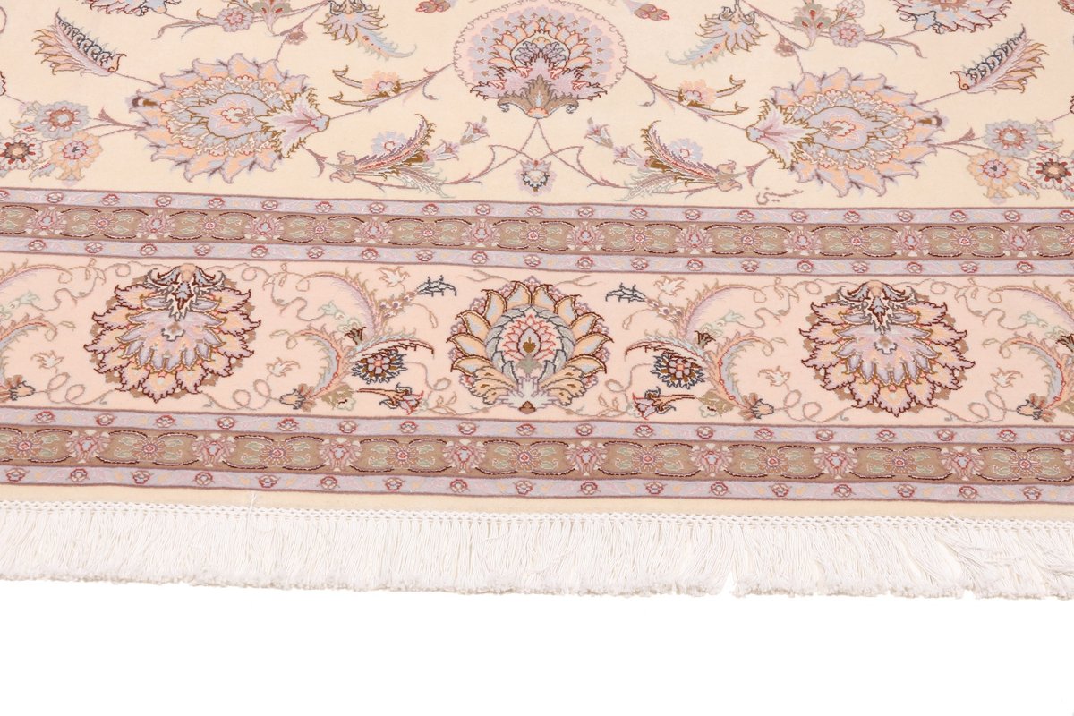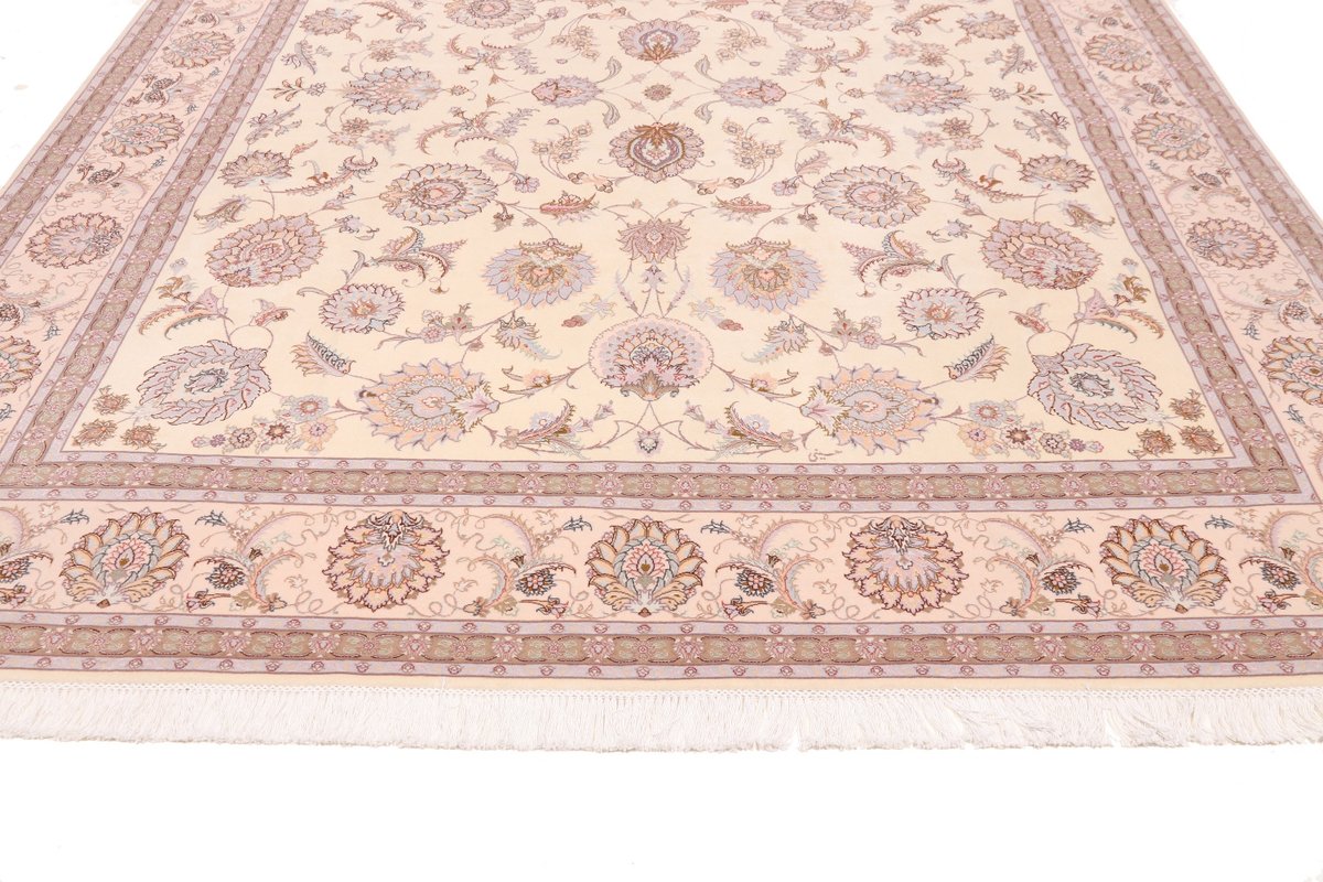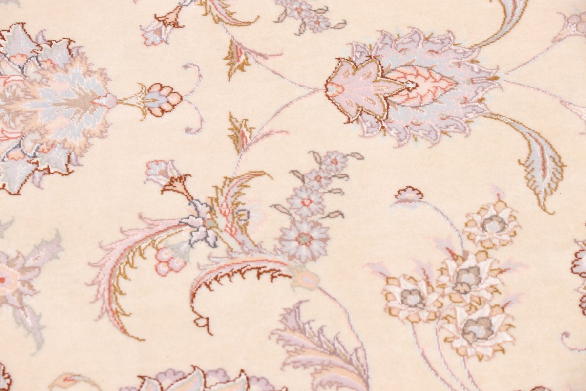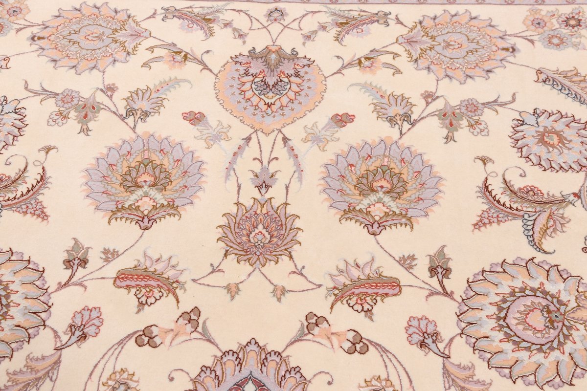 Für die besondere Eleganz des Täbriz-Flors sorgen hervorragende Materialien wie samtig anmutende Korkwolle und glänzende Seidenfäden. Die Knüpfqualität eines Täbriz-Teppichs lässt sich aus der angegebenen Raj-Zahl erschließen – je höher diese ausfällt, umso feiner ist die Knüpfdichte, die eine Million und mehr Knoten pro Quadratmeter erreichen kann. Bei besonders feingeknüpften Qualitäten kommt für die Kette statt des üblichen Baumwollgarns sogar Seide zum Einsatz.