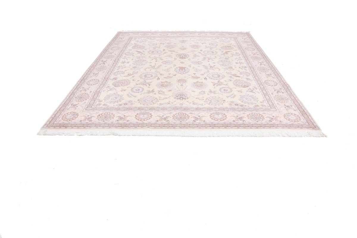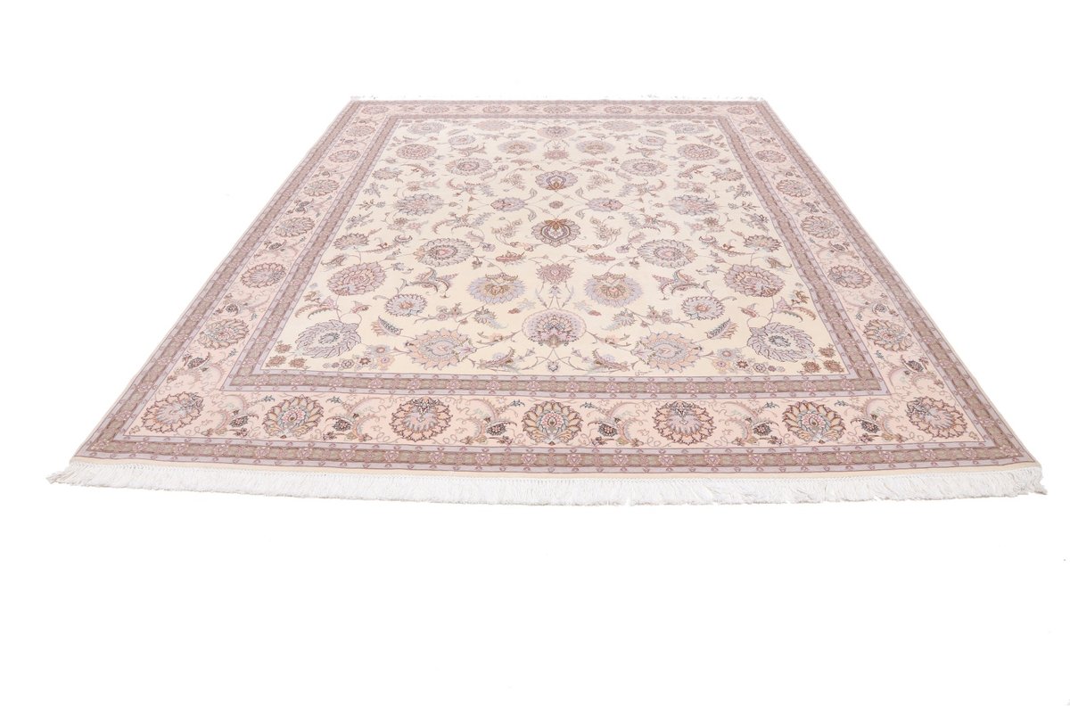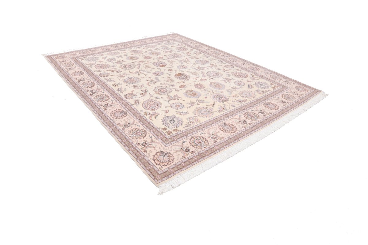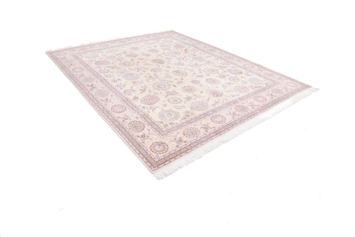 Für die besondere Eleganz des Täbriz-Flors sorgen hervorragende Materialien wie samtig anmutende Korkwolle und glänzende Seidenfäden. Die Knüpfqualität eines Täbriz-Teppichs lässt sich aus der angegebenen Raj-Zahl erschließen – je höher diese ausfällt, umso feiner ist die Knüpfdichte, die eine Million und mehr Knoten pro Quadratmeter erreichen kann. Bei besonders feingeknüpften Qualitäten kommt für die Kette statt des üblichen Baumwollgarns sogar Seide zum Einsatz.