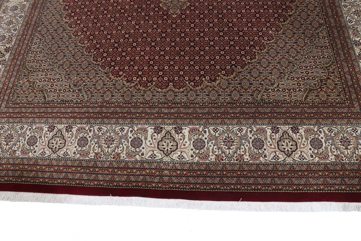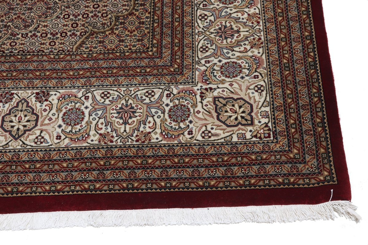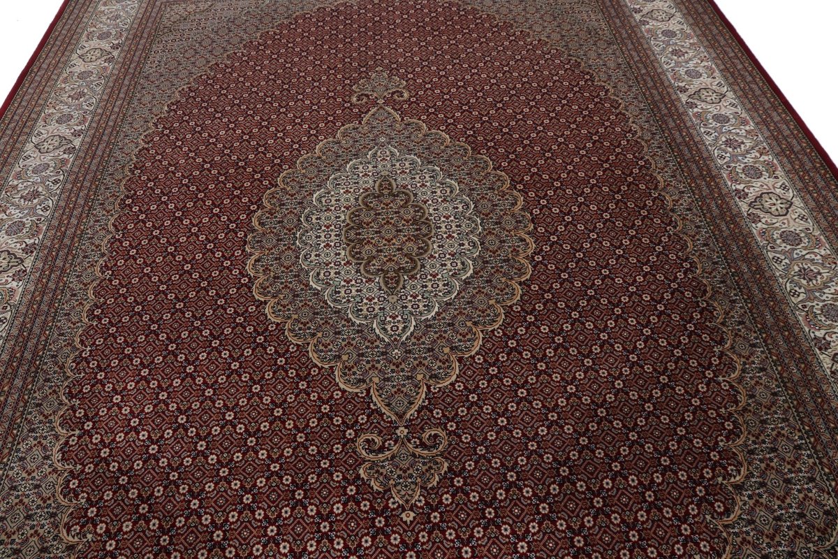 Für die besondere Eleganz des Täbriz-Flors sorgen hervorragende Materialien wie samtig anmutende Korkwolle und glänzende Seidenfäden. Die Knüpfqualität eines Täbriz-Teppichs lässt sich aus der angegebenen Raj-Zahl erschließen – je höher diese ausfällt, umso feiner ist die Knüpfdichte, die eine Million und mehr Knoten pro Quadratmeter erreichen kann. Bei besonders feingeknüpften Qualitäten kommt für die Kette statt des üblichen Baumwollgarns sogar Seide zum Einsatz.