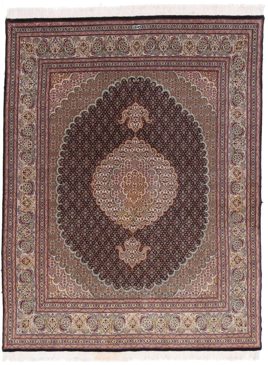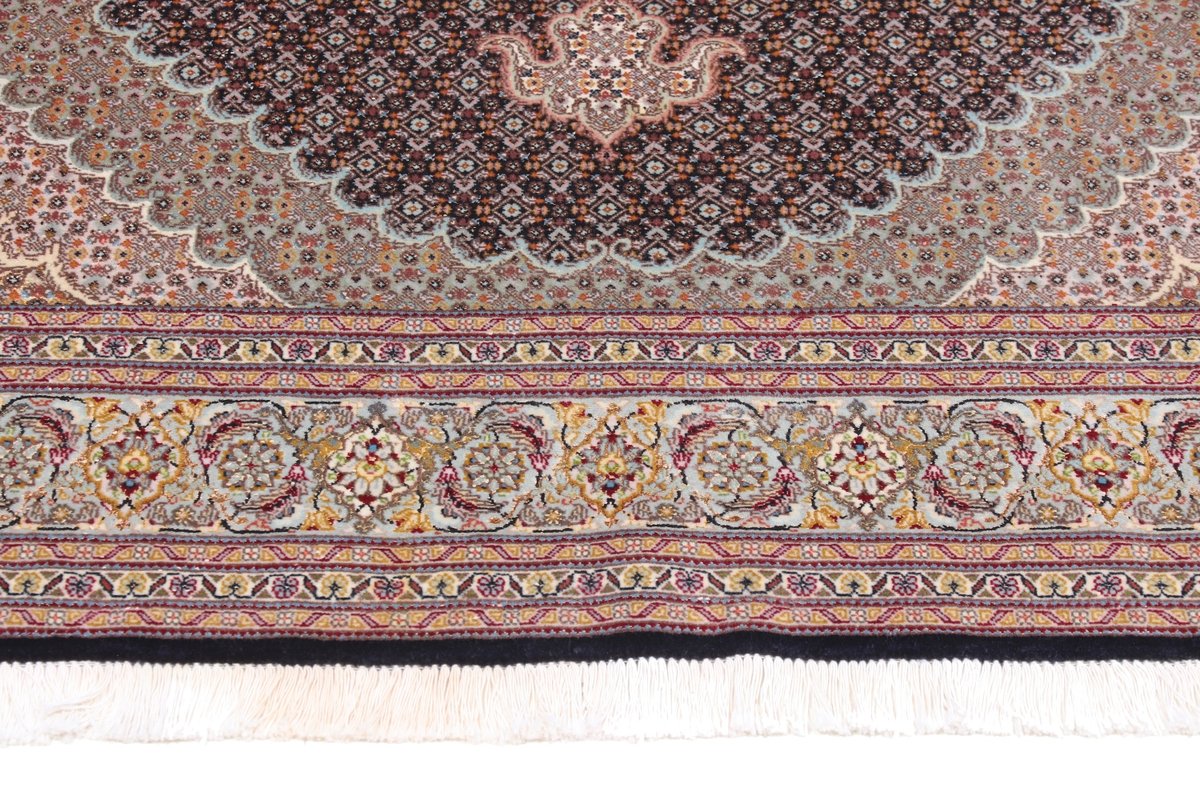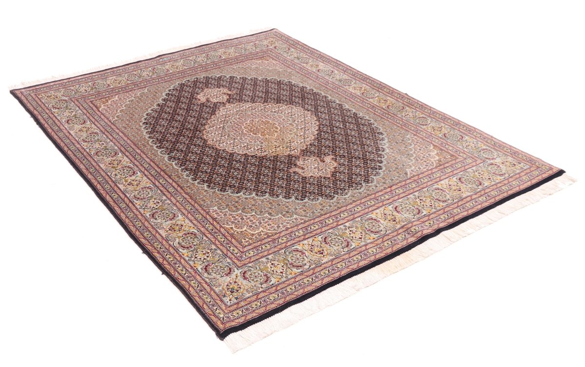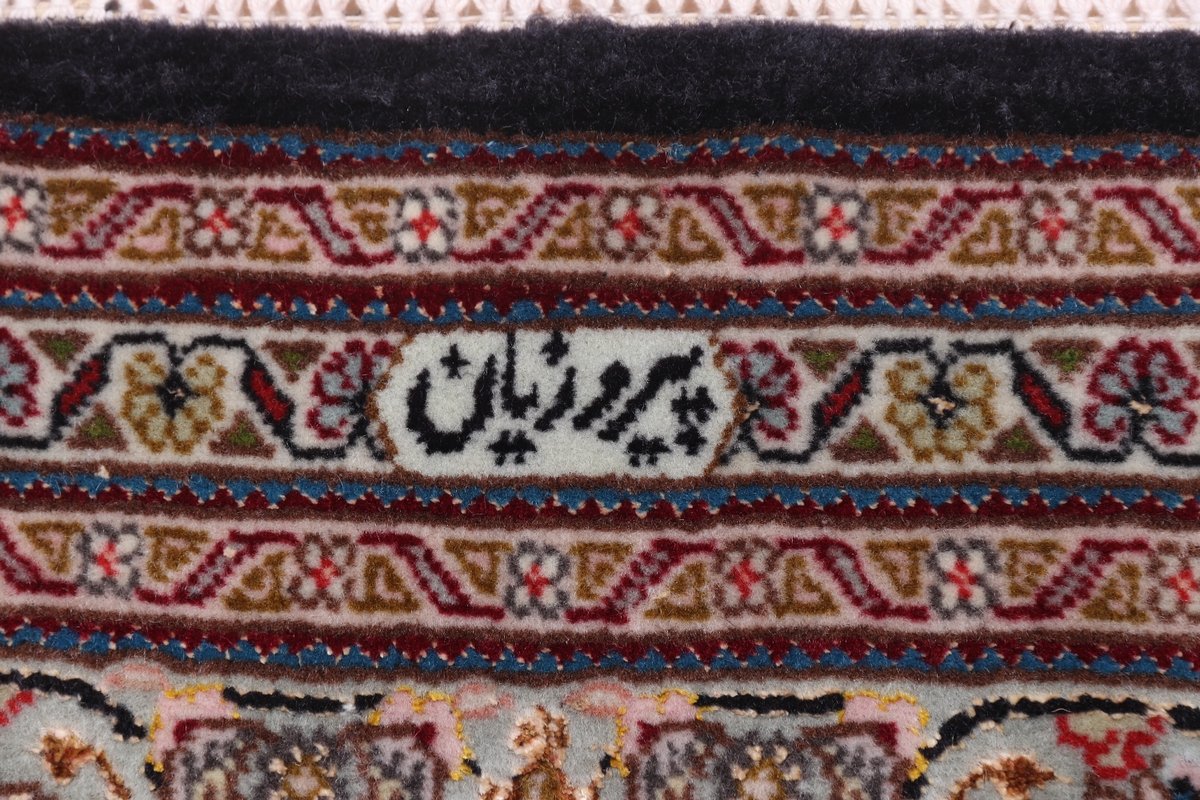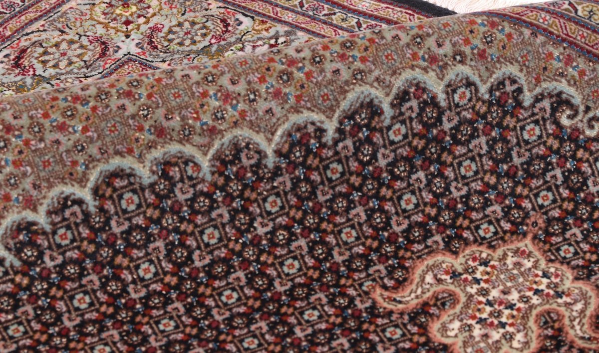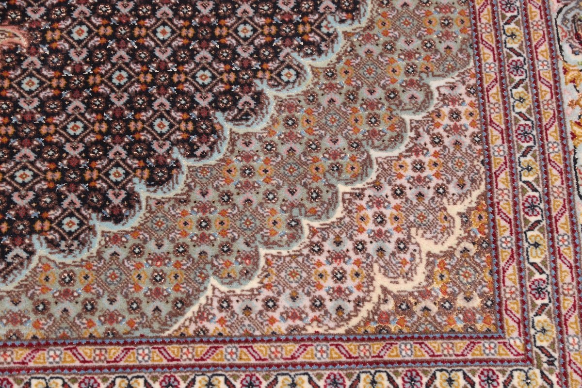Für die besondere Eleganz des Täbriz-Flors sorgen hervorragende Materialien wie samtig anmutende Korkwolle und glänzende Seidenfäden. Die Knüpfqualität eines Täbriz-Teppichs lässt sich aus der angegebenen Raj-Zahl erschließen – je höher diese ausfällt, umso feiner ist die Knüpfdichte, die eine Million und mehr Knoten pro Quadratmeter erreichen kann. Bei besonders feingeknüpften Qualitäten kommt für die Kette statt des üblichen Baumwollgarns sogar Seide zum Einsatz.