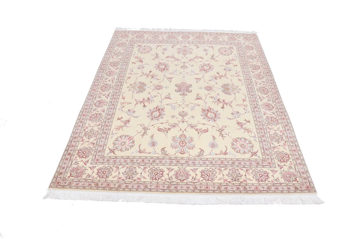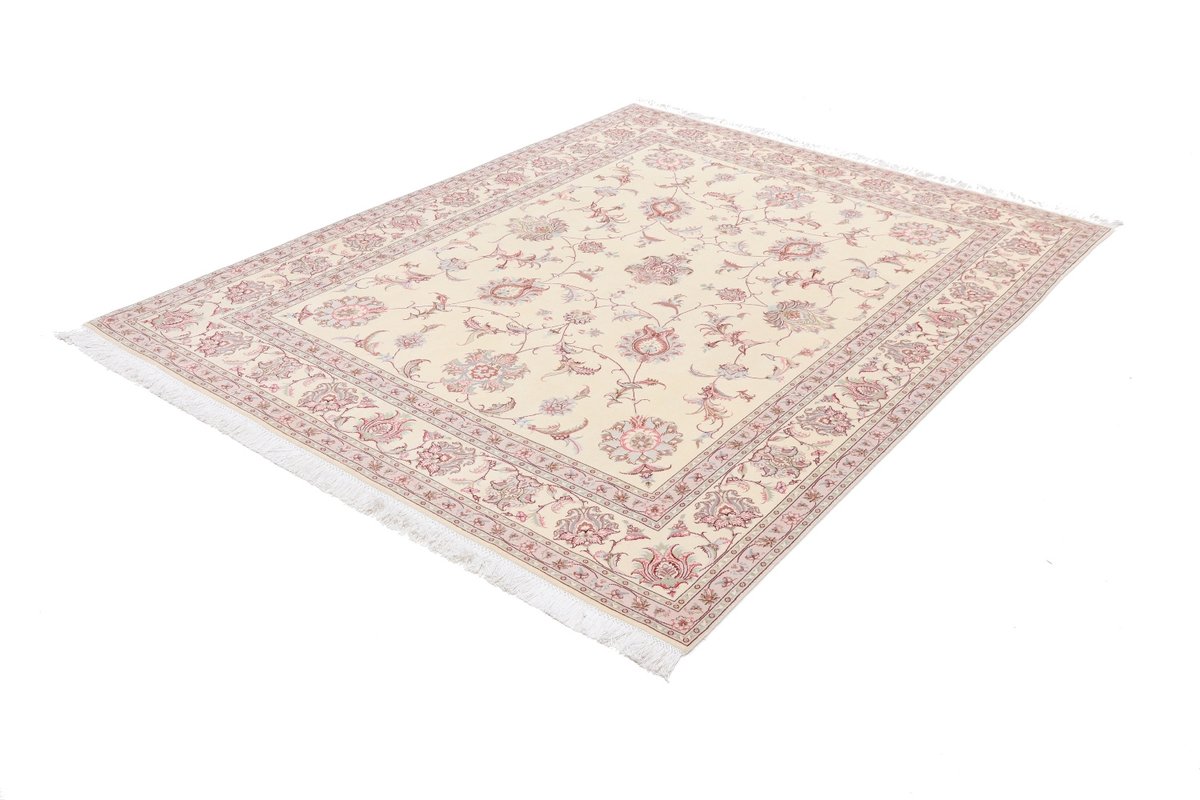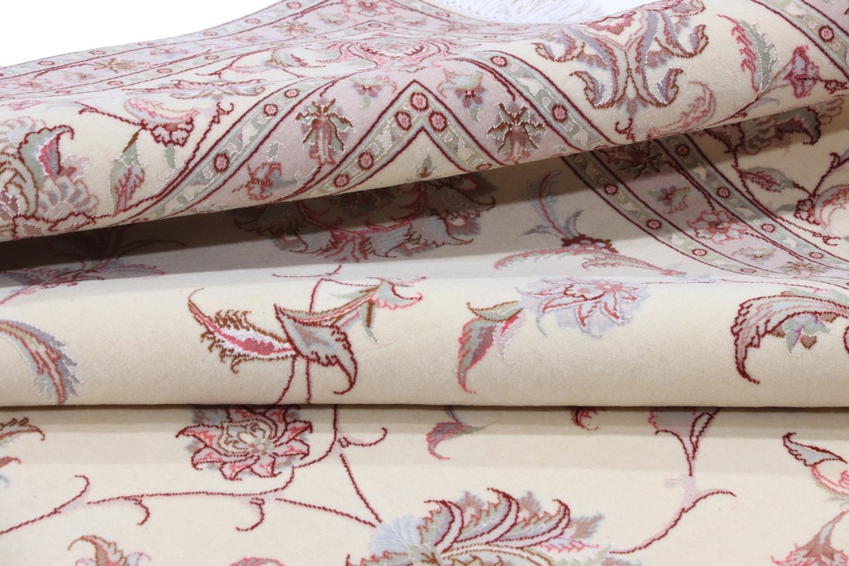Für die besondere Eleganz des Täbriz-Flors sorgen hervorragende Materialien wie samtig anmutende Korkwolle und glänzende Seidenfäden. Die Knüpfqualität eines Täbriz-Teppichs lässt sich aus der angegebenen Raj-Zahl erschließen – je höher diese ausfällt, umso feiner ist die Knüpfdichte, die eine Million und mehr Knoten pro Quadratmeter erreichen kann. Bei besonders feingeknüpften Qualitäten kommt für die Kette statt des üblichen Baumwollgarns sogar Seide zum Einsatz.