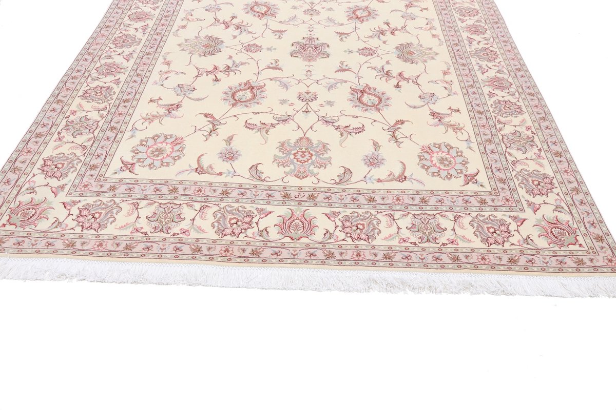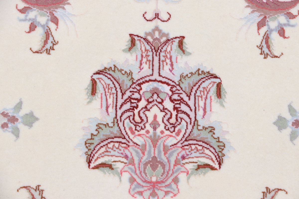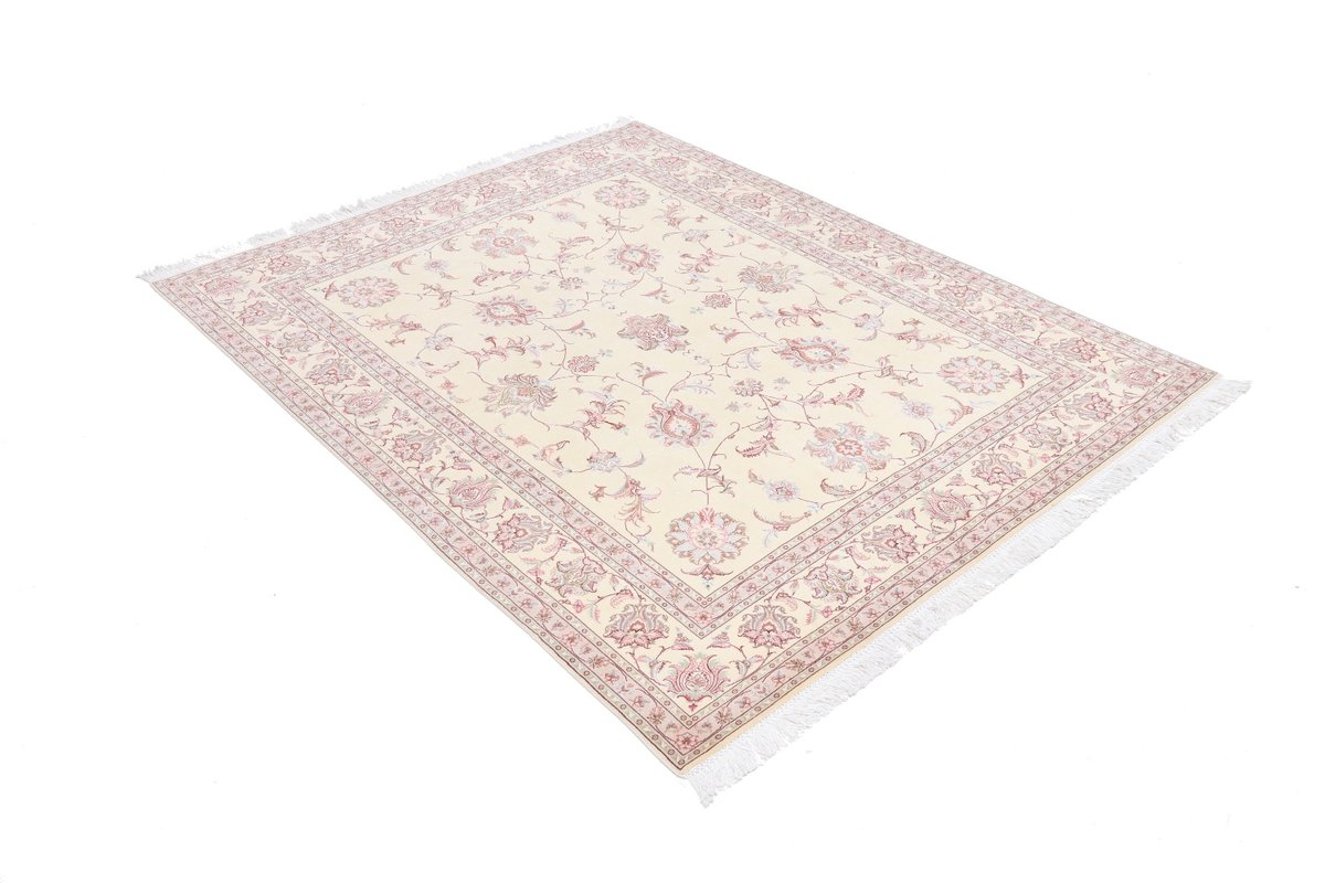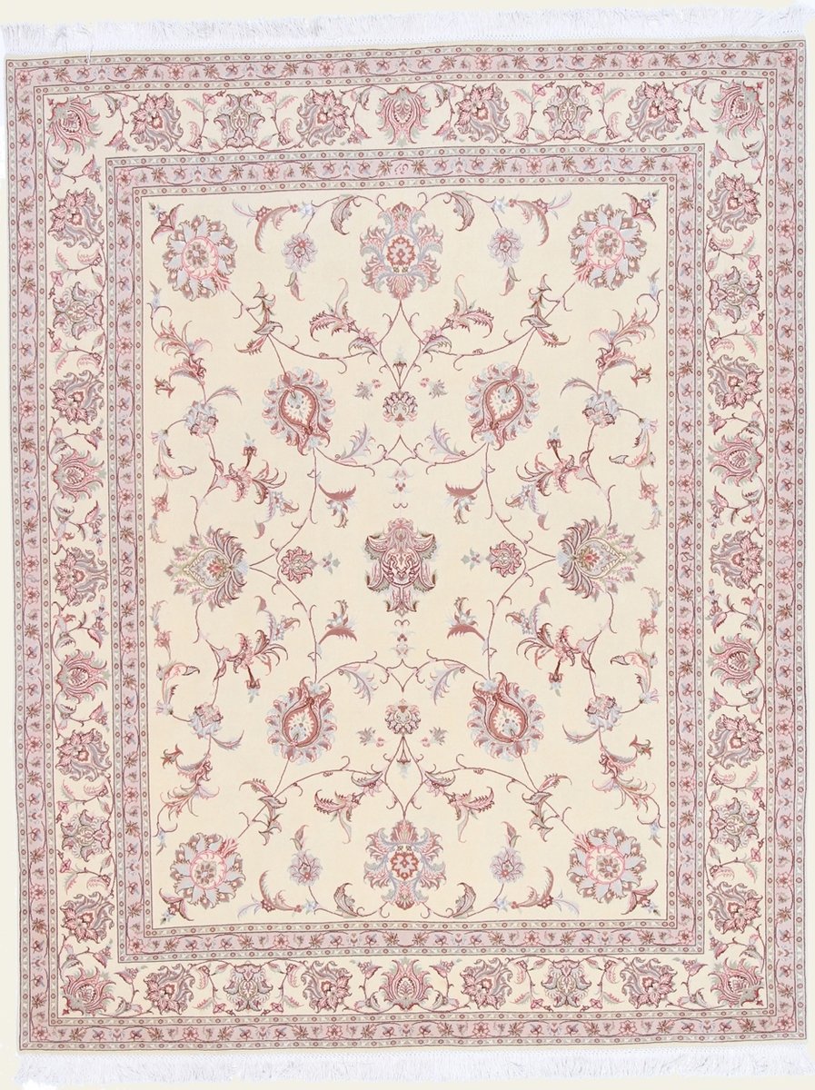 Für die besondere Eleganz des Täbriz-Flors sorgen hervorragende Materialien wie samtig anmutende Korkwolle und glänzende Seidenfäden. Die Knüpfqualität eines Täbriz-Teppichs lässt sich aus der angegebenen Raj-Zahl erschließen – je höher diese ausfällt, umso feiner ist die Knüpfdichte, die eine Million und mehr Knoten pro Quadratmeter erreichen kann. Bei besonders feingeknüpften Qualitäten kommt für die Kette statt des üblichen Baumwollgarns sogar Seide zum Einsatz.