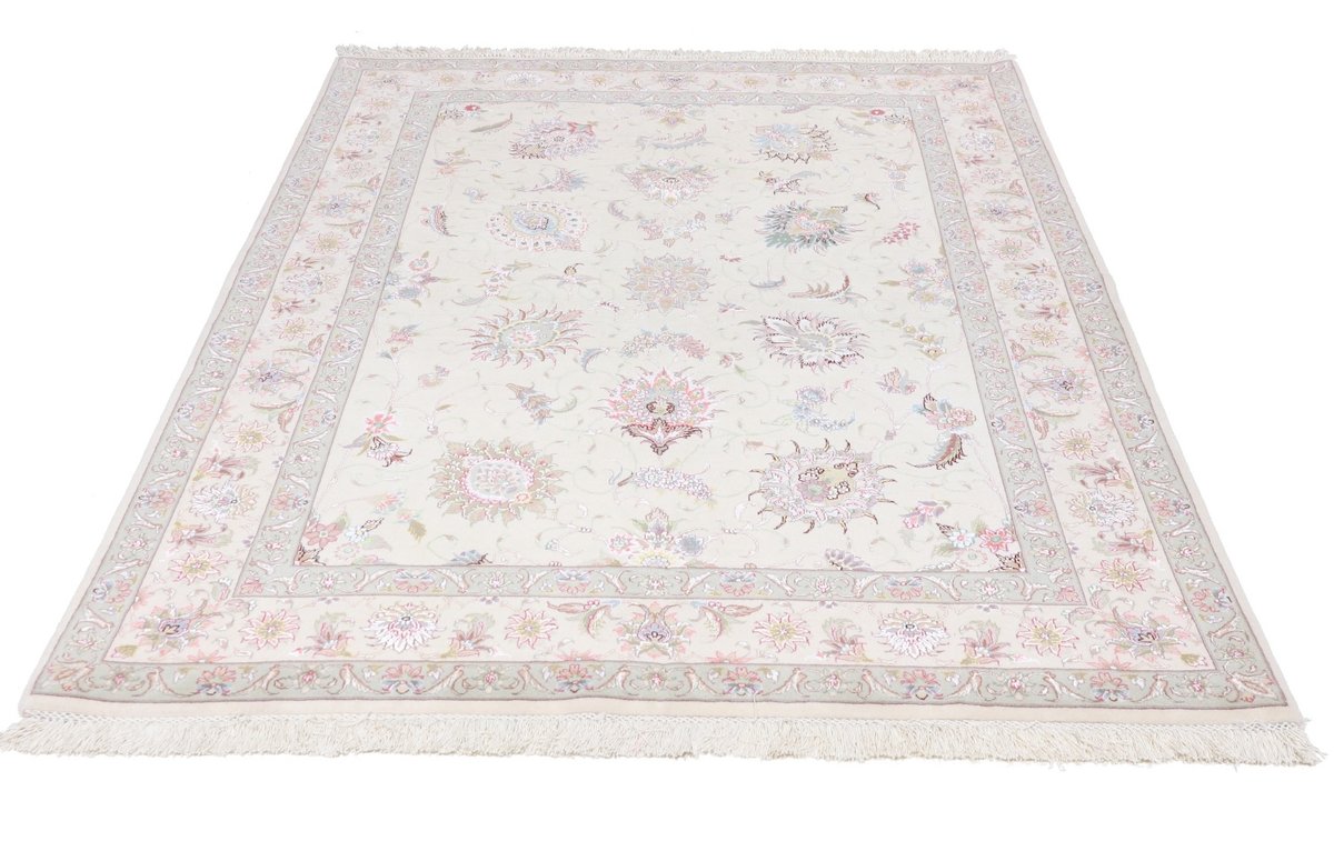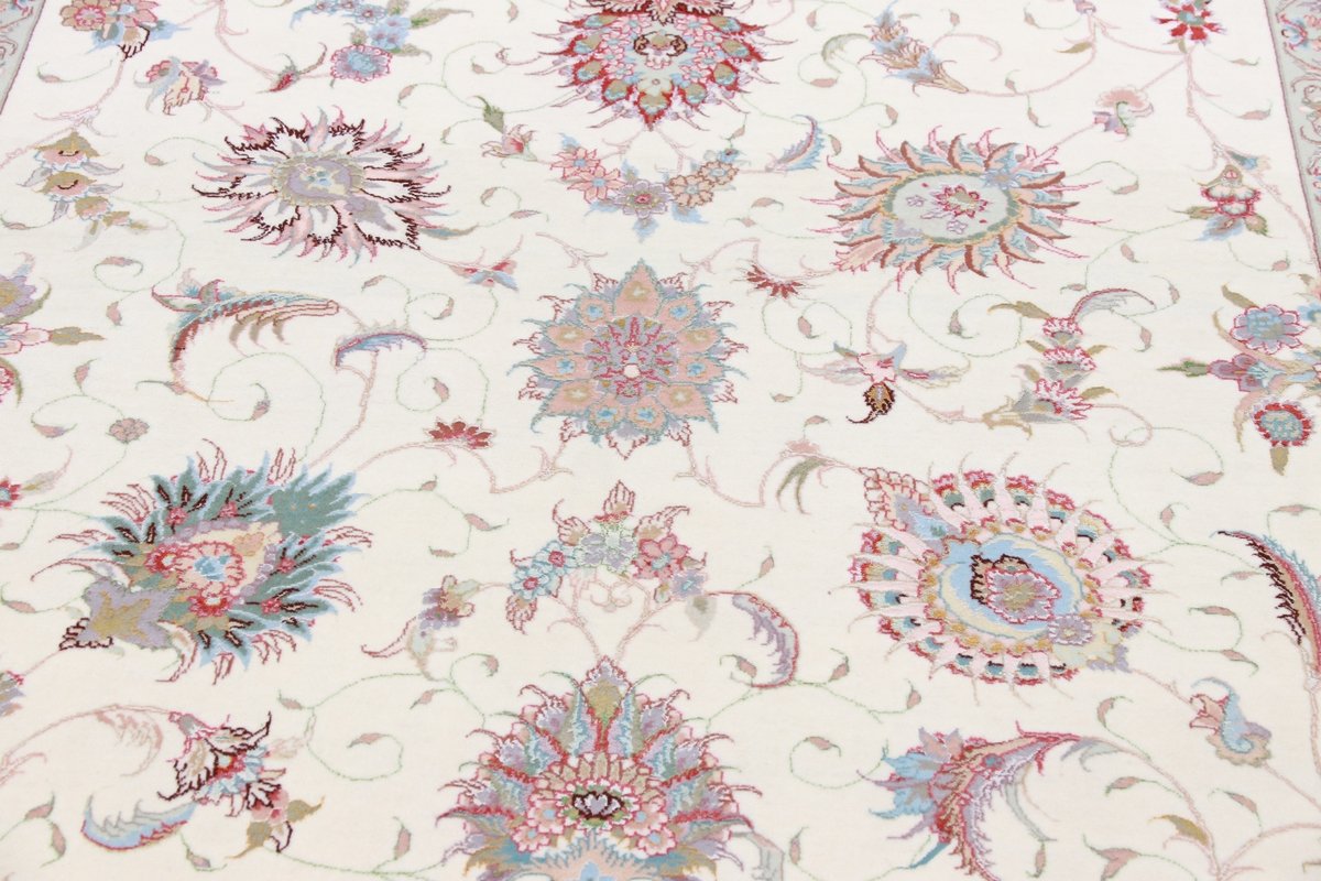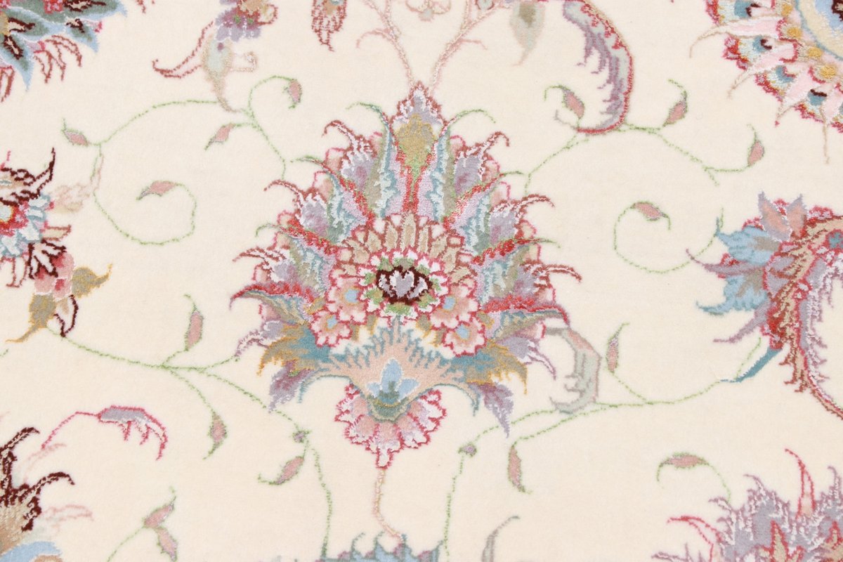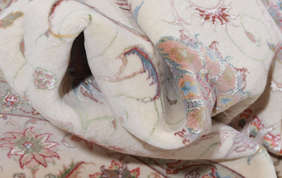 Für die besondere Eleganz des Täbriz-Flors sorgen hervorragende Materialien wie samtig anmutende Korkwolle und glänzende Seidenfäden. Die Knüpfqualität eines Täbriz-Teppichs lässt sich aus der angegebenen Raj-Zahl erschließen – je höher diese ausfällt, umso feiner ist die Knüpfdichte, die eine Million und mehr Knoten pro Quadratmeter erreichen kann. Bei besonders feingeknüpften Qualitäten kommt für die Kette statt des üblichen Baumwollgarns sogar Seide zum Einsatz.