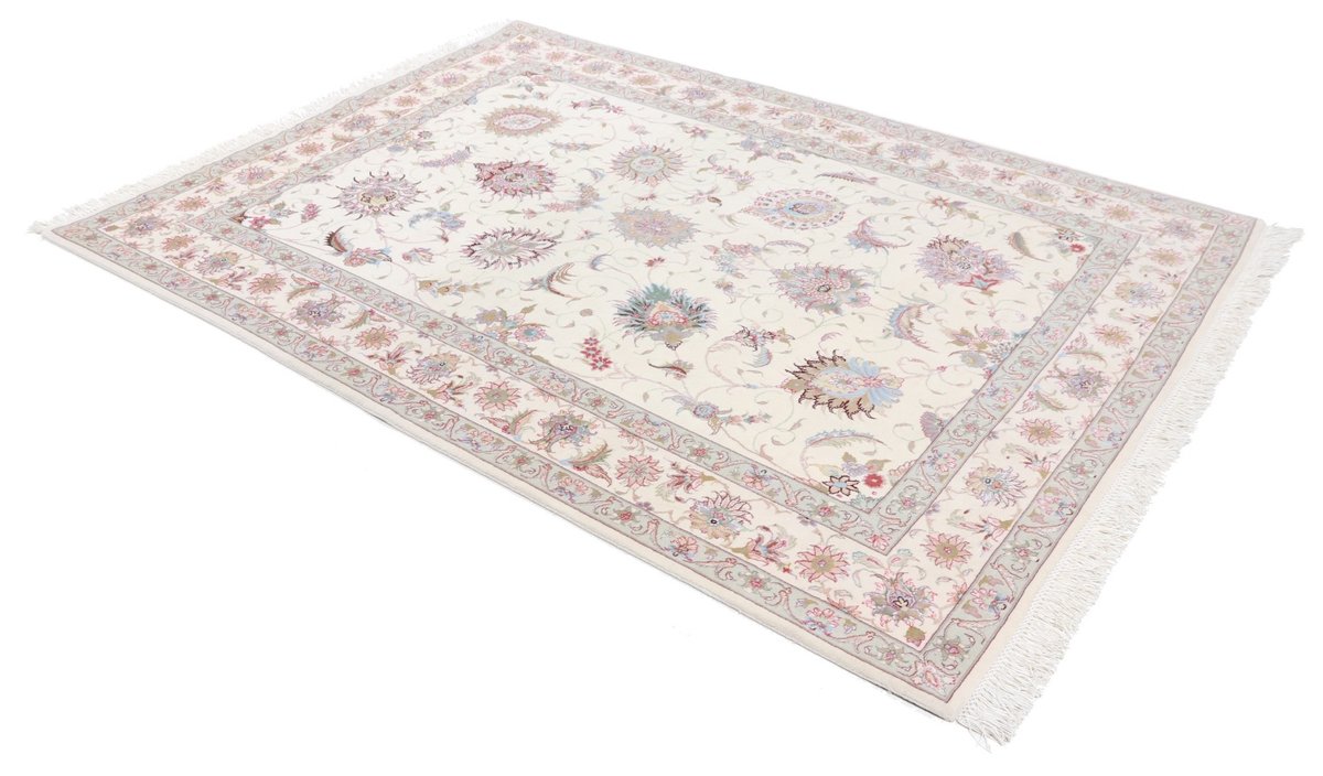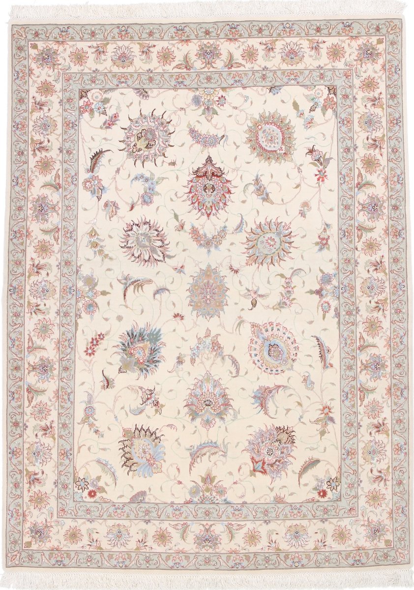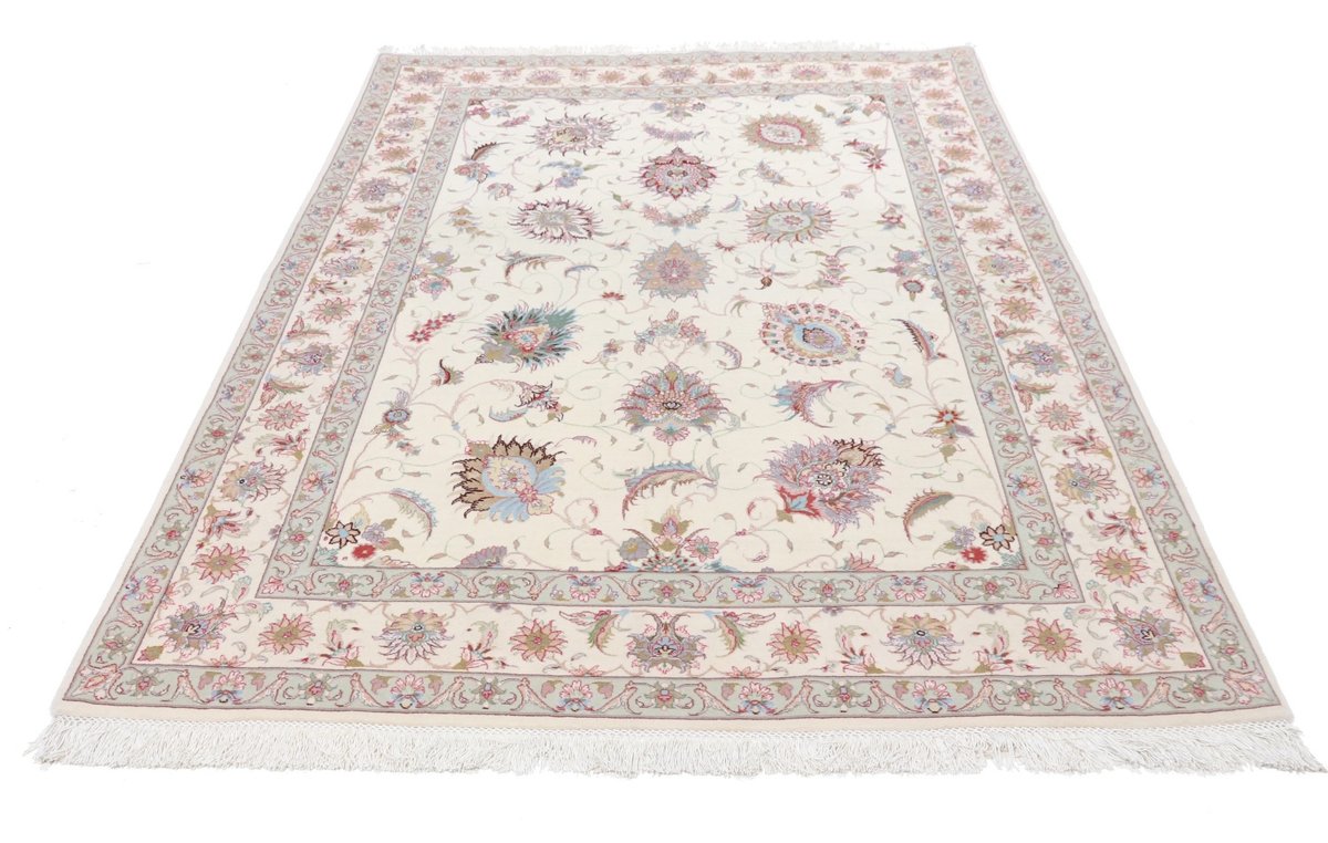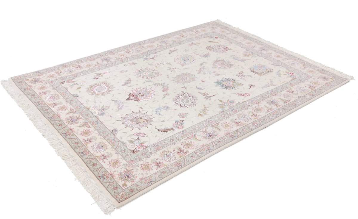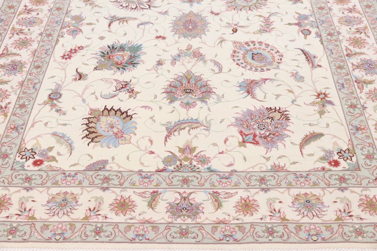Für die besondere Eleganz des Täbriz-Flors sorgen hervorragende Materialien wie samtig anmutende Korkwolle und glänzende Seidenfäden. Die Knüpfqualität eines Täbriz-Teppichs lässt sich aus der angegebenen Raj-Zahl erschließen – je höher diese ausfällt, umso feiner ist die Knüpfdichte, die eine Million und mehr Knoten pro Quadratmeter erreichen kann. Bei besonders feingeknüpften Qualitäten kommt für die Kette statt des üblichen Baumwollgarns sogar Seide zum Einsatz.