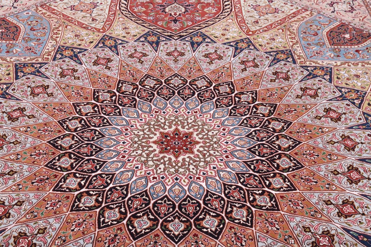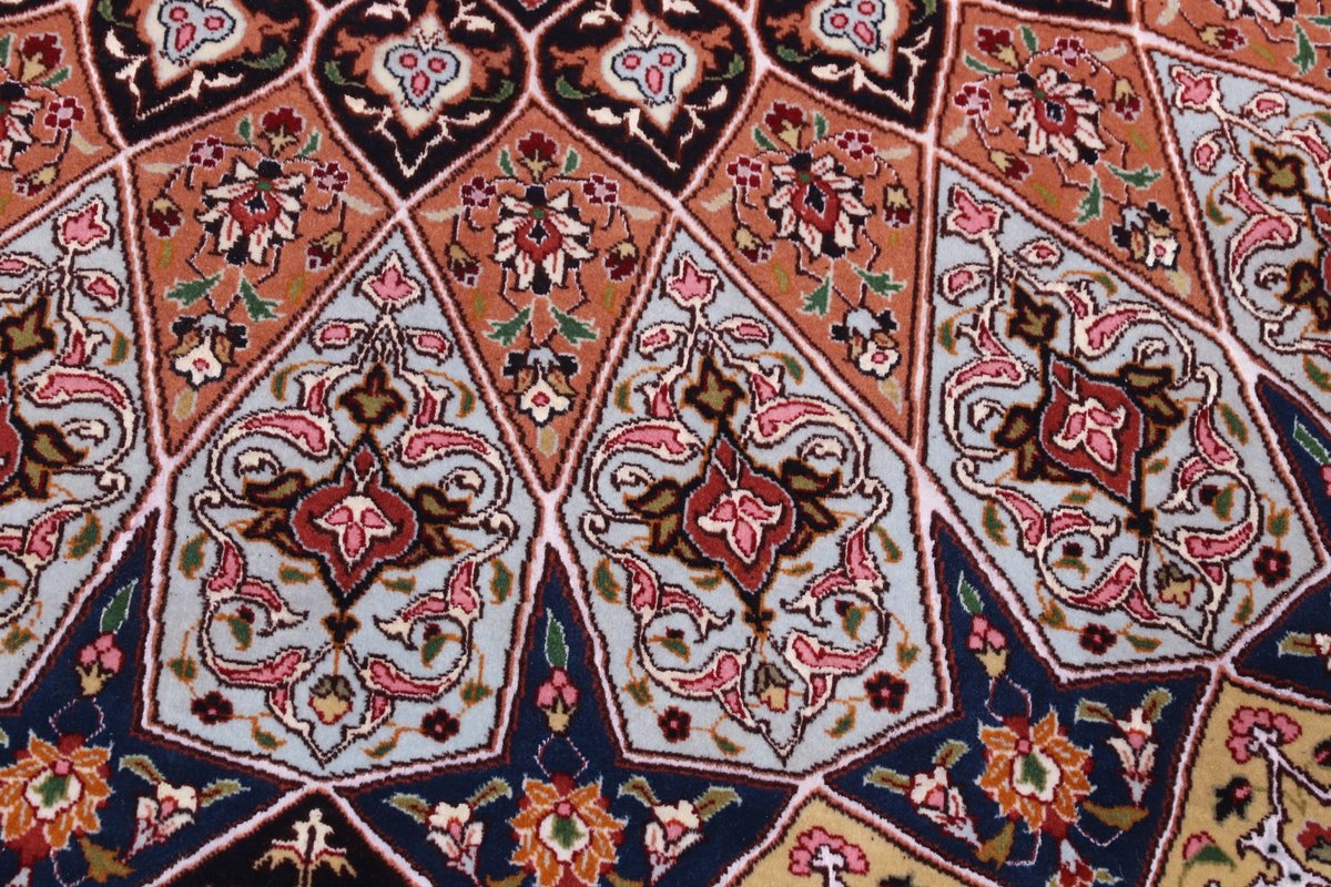 Für die besondere Eleganz des Täbriz-Flors sorgen hervorragende Materialien wie samtig anmutende Korkwolle und glänzende Seidenfäden. Die Knüpfqualität eines Täbriz-Teppichs lässt sich aus der angegebenen Raj-Zahl erschließen – je höher diese ausfällt, umso feiner ist die Knüpfdichte, die eine Million und mehr Knoten pro Quadratmeter erreichen kann. Bei besonders feingeknüpften Qualitäten kommt für die Kette statt des üblichen Baumwollgarns sogar Seide zum Einsatz.