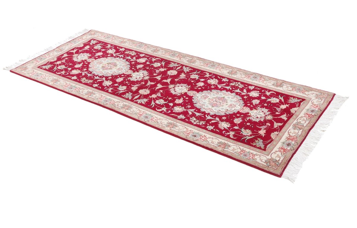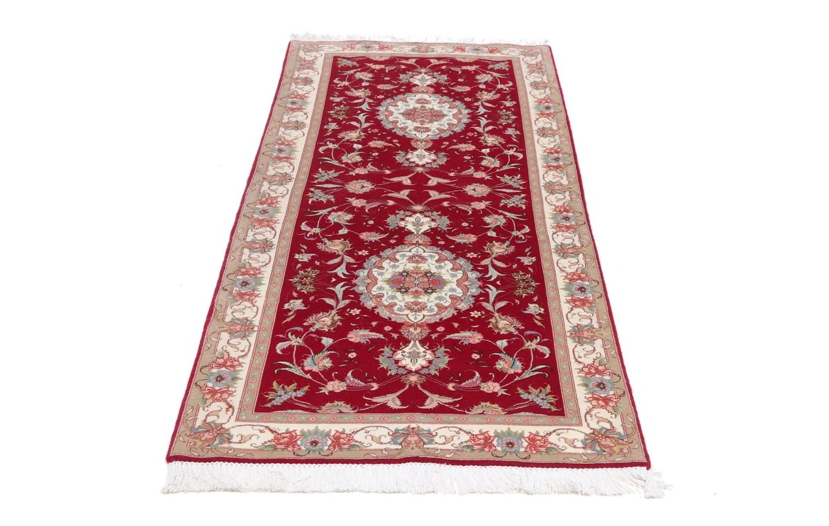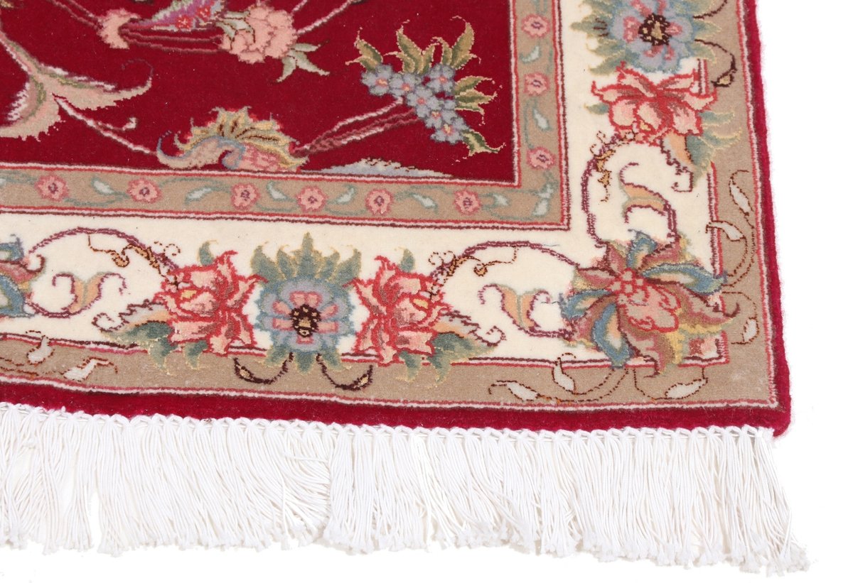 Für die besondere Eleganz des Täbriz-Flors sorgen hervorragende Materialien wie samtig anmutende Korkwolle und glänzende Seidenfäden. Die Knüpfqualität eines Täbriz-Teppichs lässt sich aus der angegebenen Raj-Zahl erschließen – je höher diese ausfällt, umso feiner ist die Knüpfdichte, die eine Million und mehr Knoten pro Quadratmeter erreichen kann. Bei besonders feingeknüpften Qualitäten kommt für die Kette statt des üblichen Baumwollgarns sogar Seide zum Einsatz.
