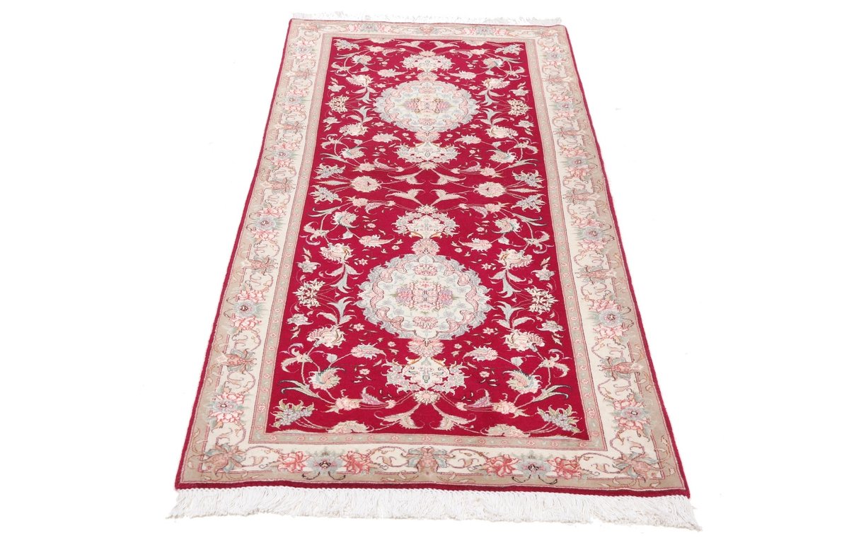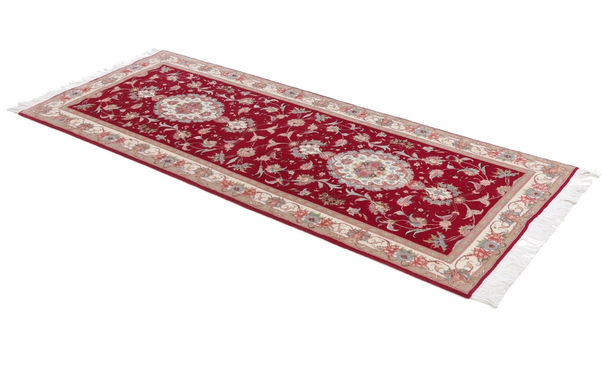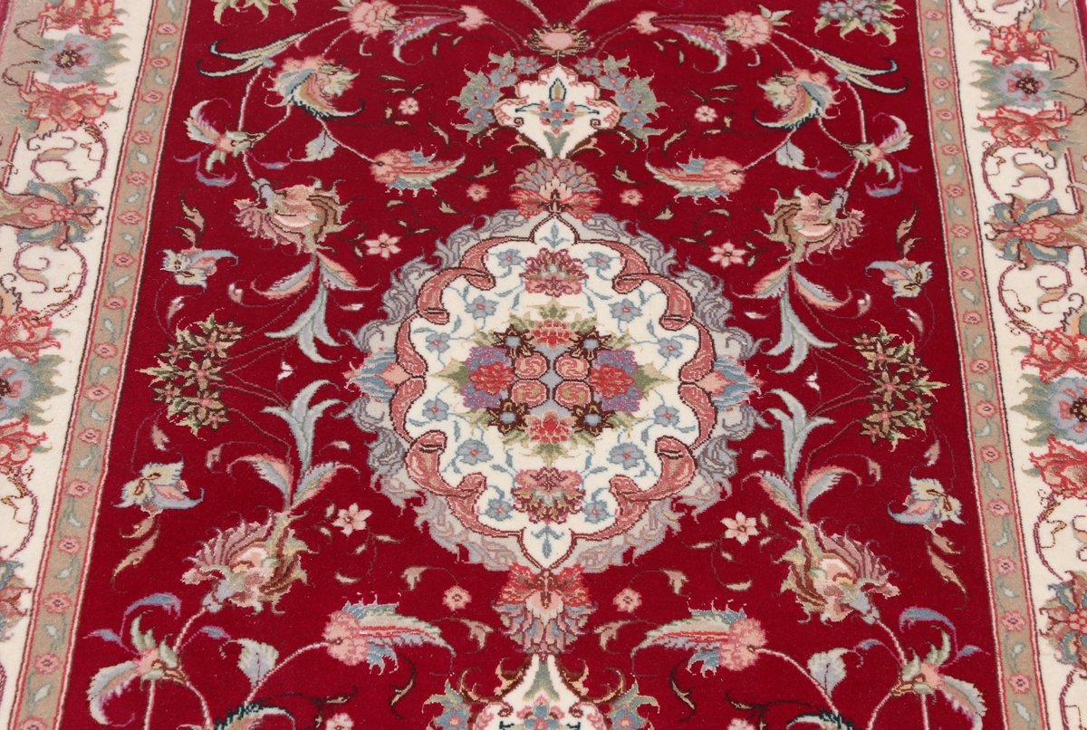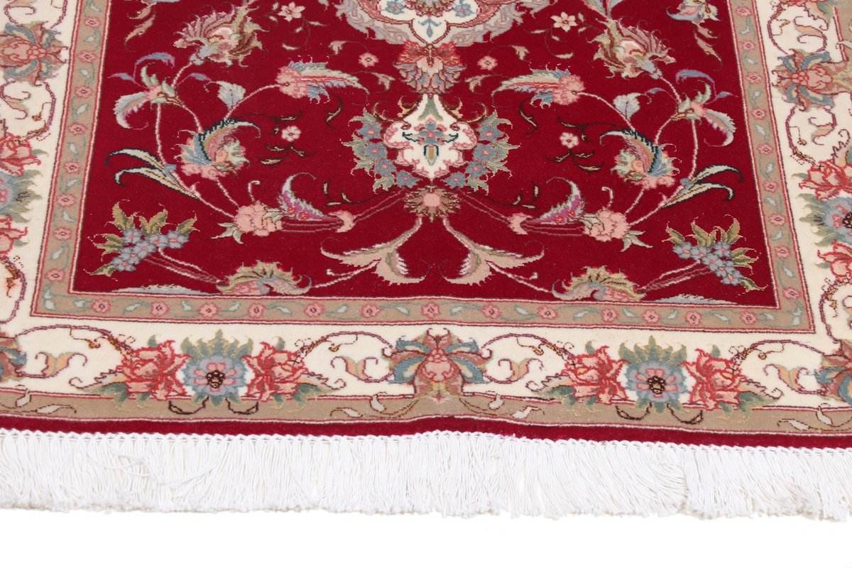 Für die besondere Eleganz des Täbriz-Flors sorgen hervorragende Materialien wie samtig anmutende Korkwolle und glänzende Seidenfäden. Die Knüpfqualität eines Täbriz-Teppichs lässt sich aus der angegebenen Raj-Zahl erschließen – je höher diese ausfällt, umso feiner ist die Knüpfdichte, die eine Million und mehr Knoten pro Quadratmeter erreichen kann. Bei besonders feingeknüpften Qualitäten kommt für die Kette statt des üblichen Baumwollgarns sogar Seide zum Einsatz.