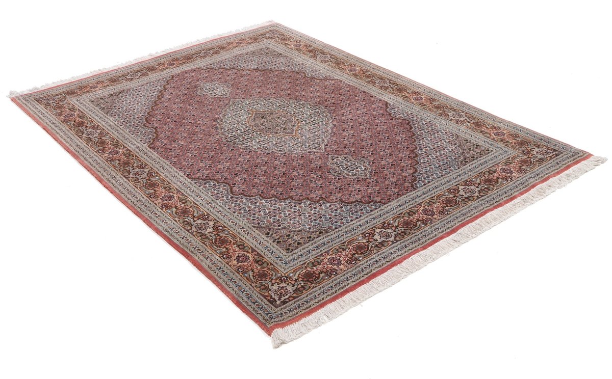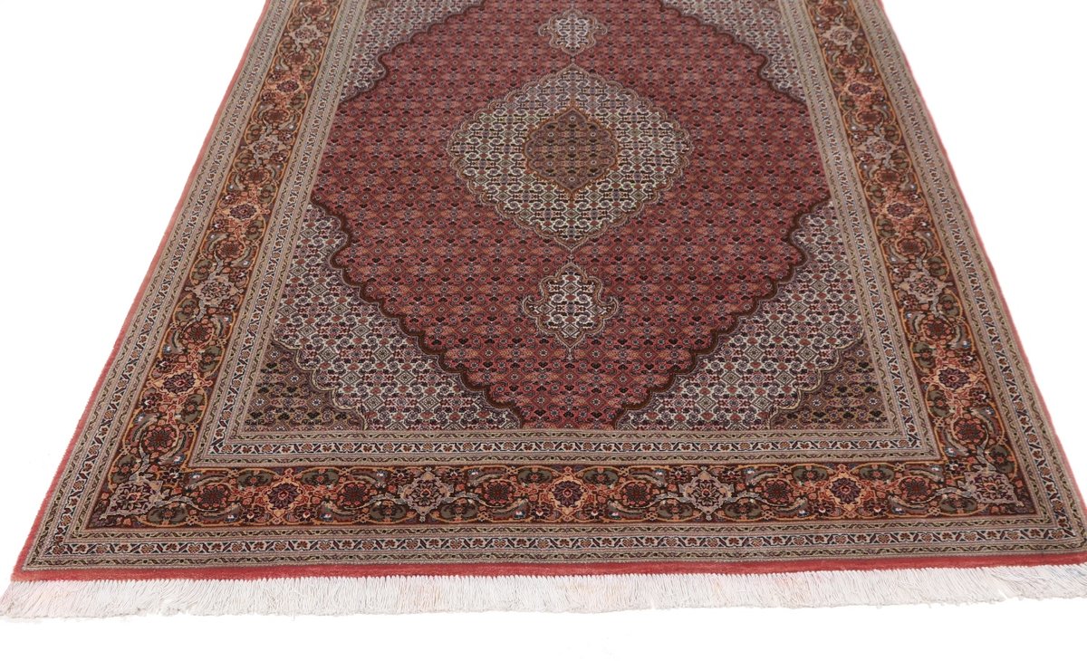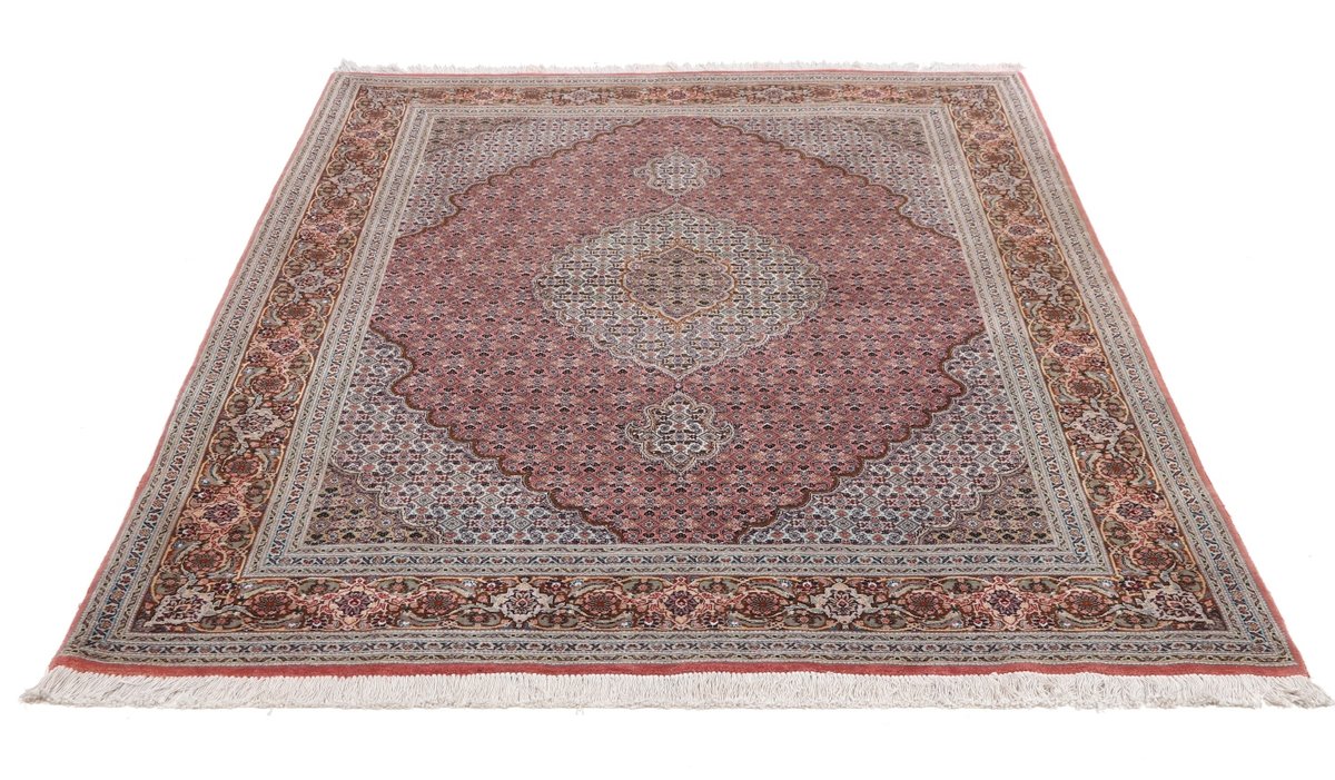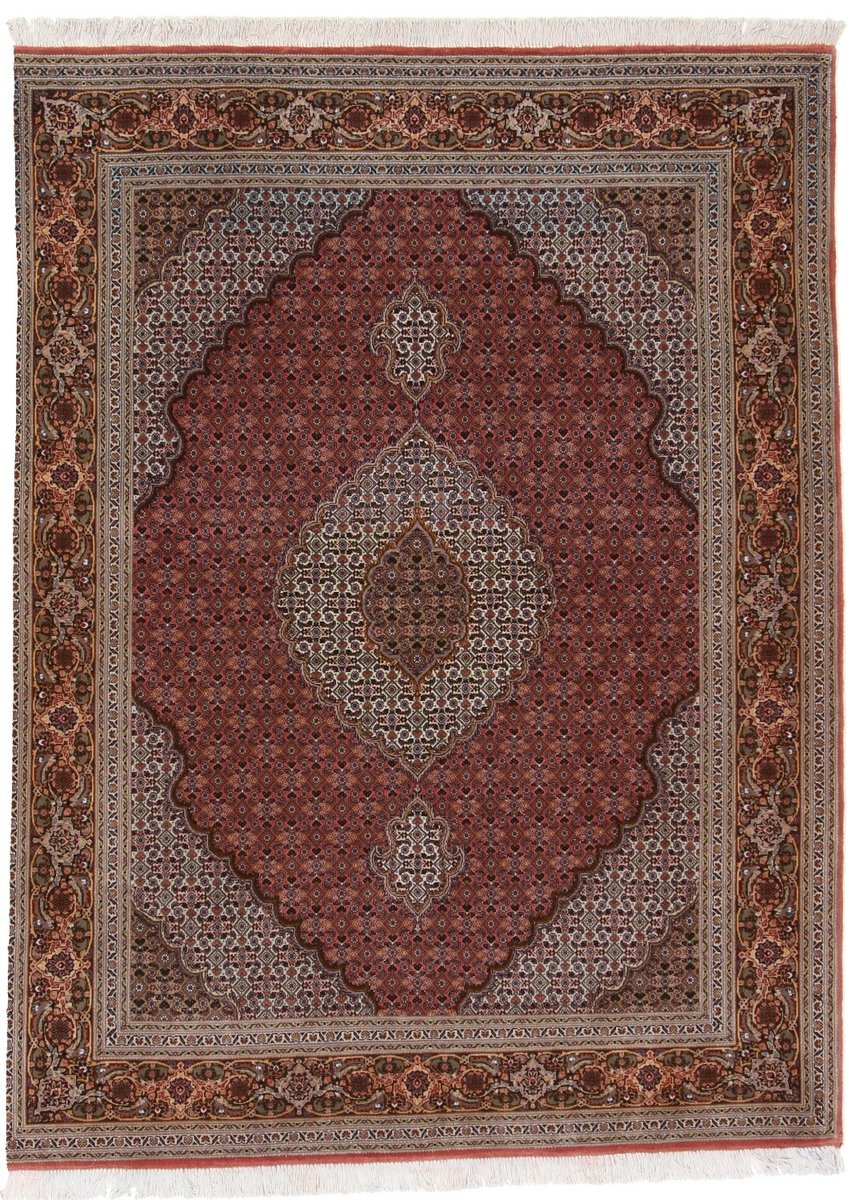 Für die besondere Eleganz des Täbriz-Flors sorgen hervorragende Materialien wie samtig anmutende Korkwolle und glänzende Seidenfäden. Die Knüpfqualität eines Täbriz-Teppichs lässt sich aus der angegebenen Raj-Zahl erschließen – je höher diese ausfällt, umso feiner ist die Knüpfdichte, die eine Million und mehr Knoten pro Quadratmeter erreichen kann. Bei besonders feingeknüpften Qualitäten kommt für die Kette statt des üblichen Baumwollgarns sogar Seide zum Einsatz.