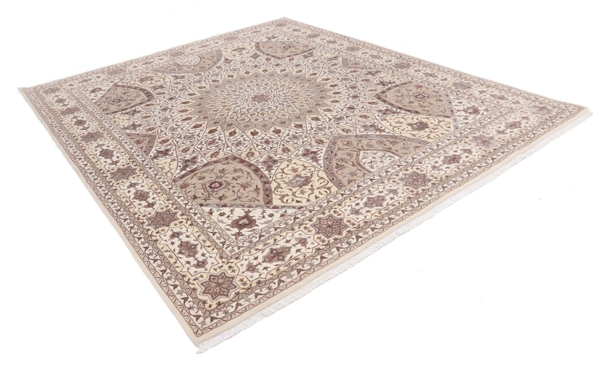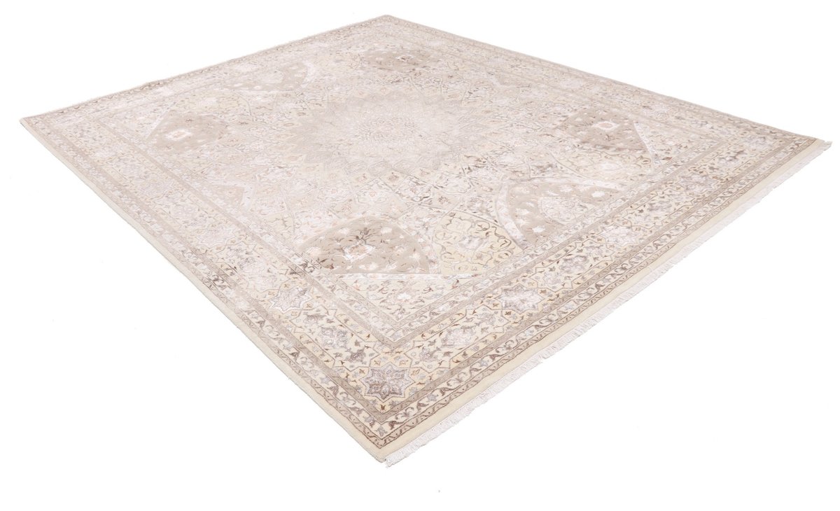 Für die besondere Eleganz des Täbriz-Flors sorgen hervorragende Materialien wie samtig anmutende Korkwolle und glänzende Seidenfäden. Die Knüpfqualität eines Täbriz-Teppichs lässt sich aus der angegebenen Raj-Zahl erschließen – je höher diese ausfällt, umso feiner ist die Knüpfdichte, die eine Million und mehr Knoten pro Quadratmeter erreichen kann. Bei besonders feingeknüpften Qualitäten kommt für die Kette statt des üblichen Baumwollgarns sogar Seide zum Einsatz.