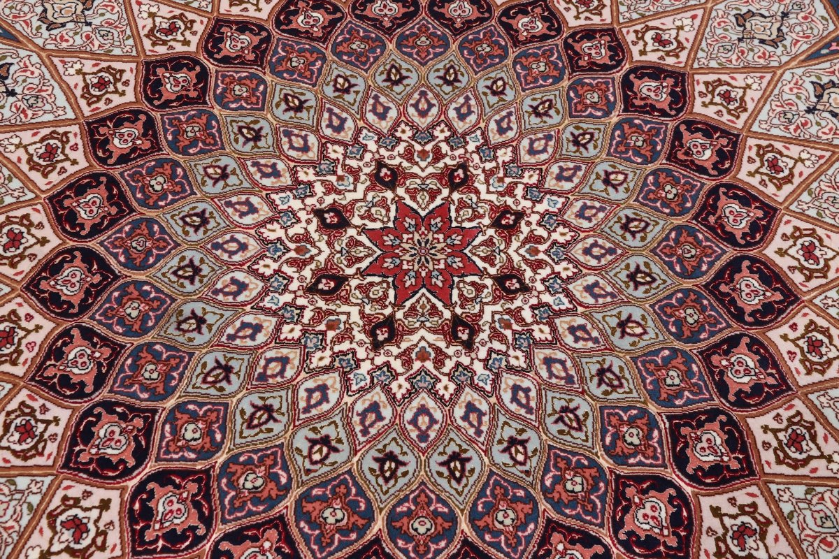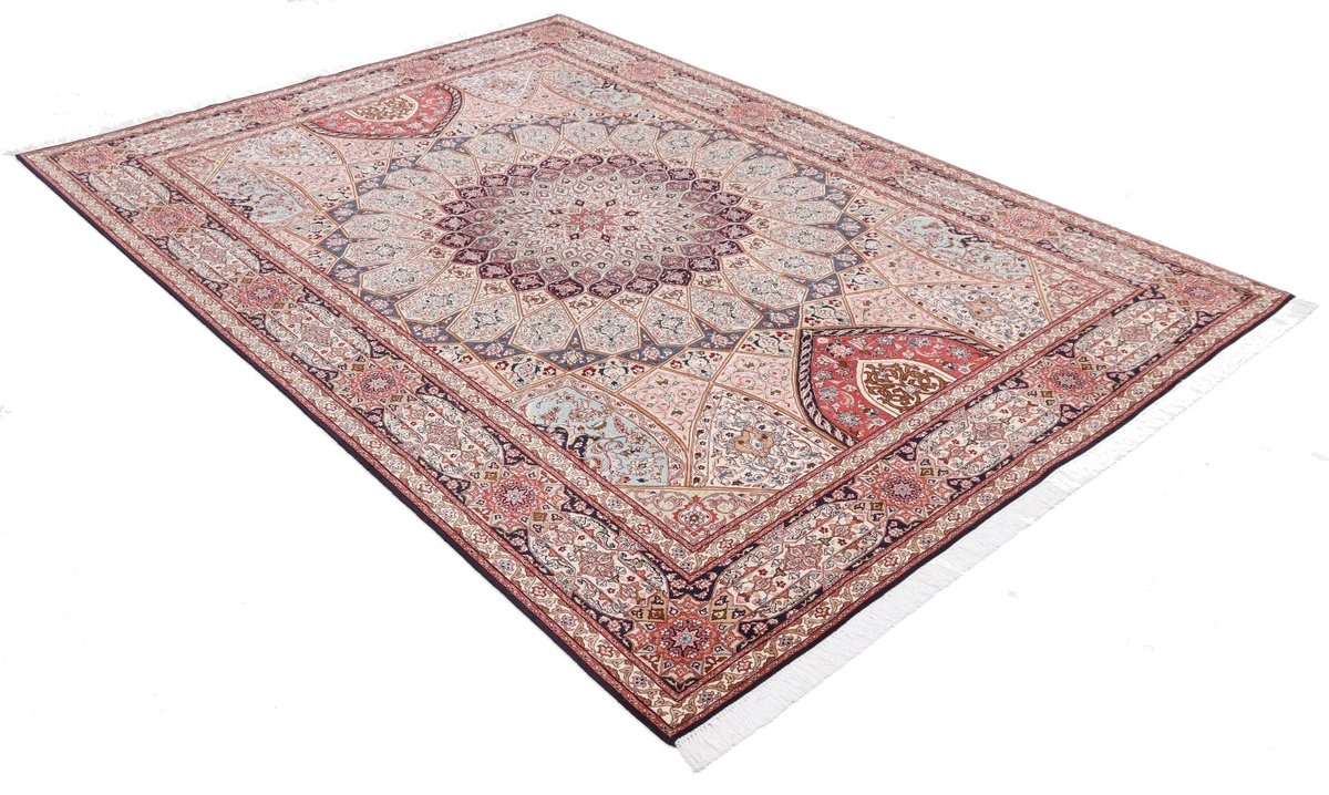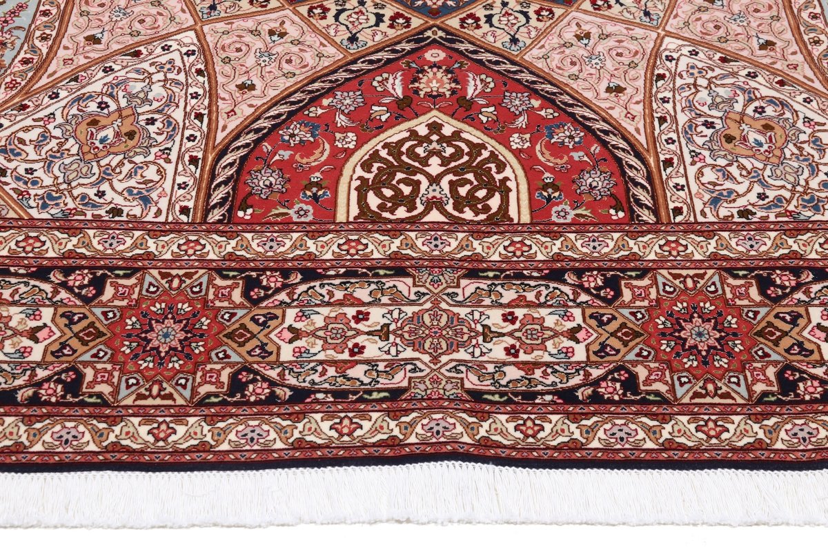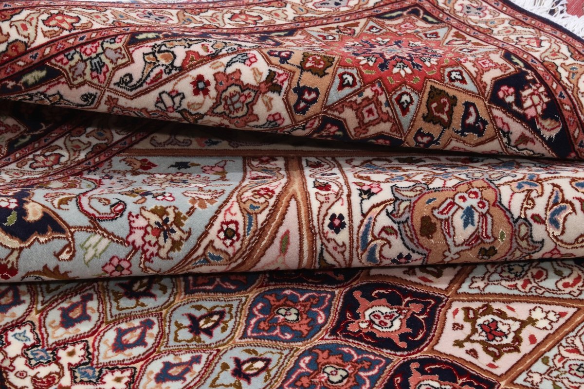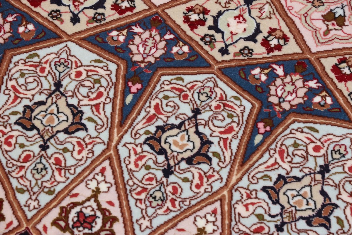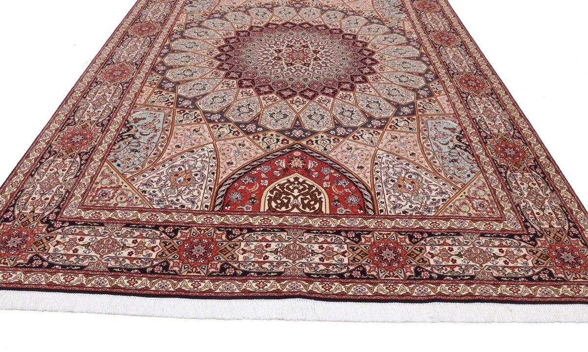 Für die besondere Eleganz des Täbriz-Flors sorgen hervorragende Materialien wie samtig anmutende Korkwolle und glänzende Seidenfäden. Die Knüpfqualität eines Täbriz-Teppichs lässt sich aus der angegebenen Raj-Zahl erschließen – je höher diese ausfällt, umso feiner ist die Knüpfdichte, die eine Million und mehr Knoten pro Quadratmeter erreichen kann. Bei besonders feingeknüpften Qualitäten kommt für die Kette statt des üblichen Baumwollgarns sogar Seide zum Einsatz.