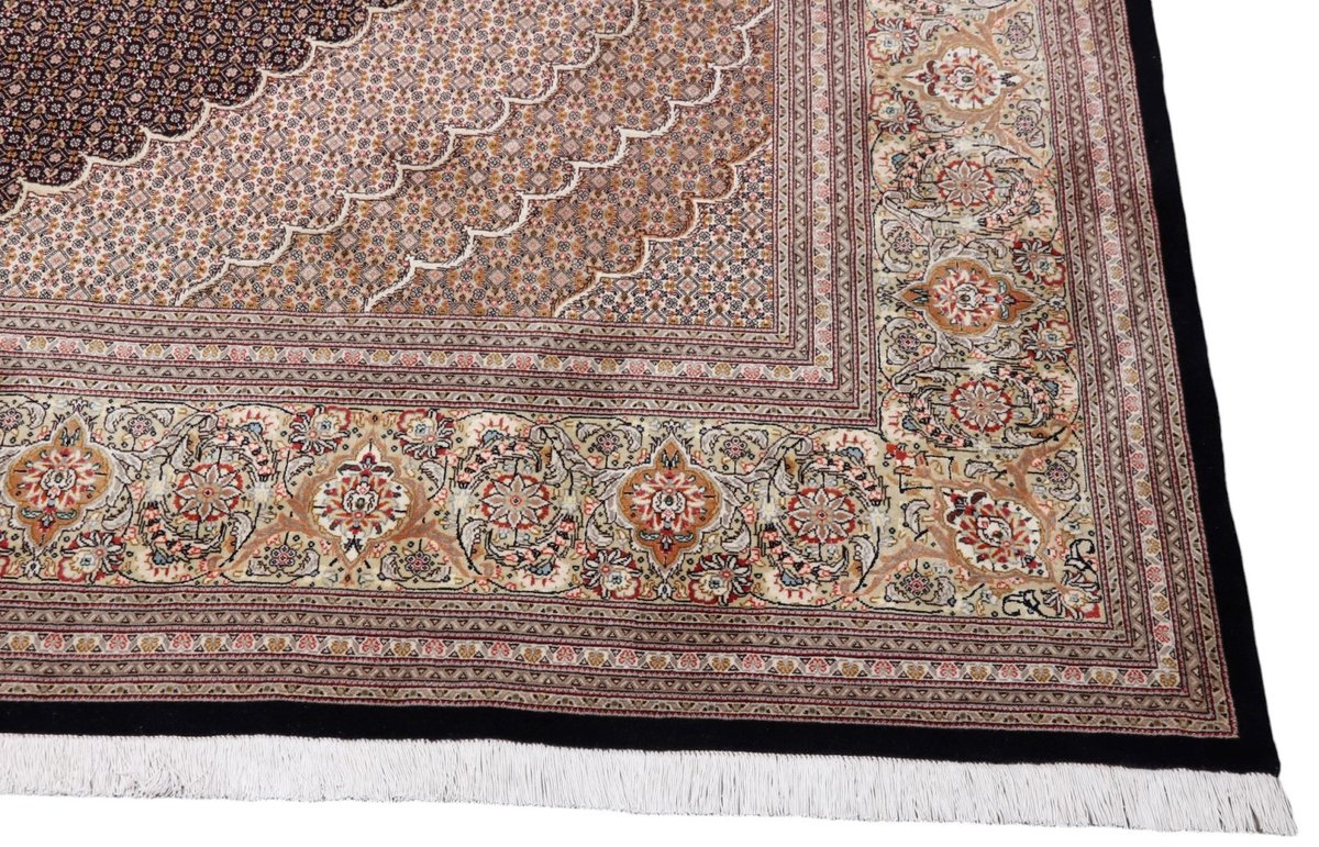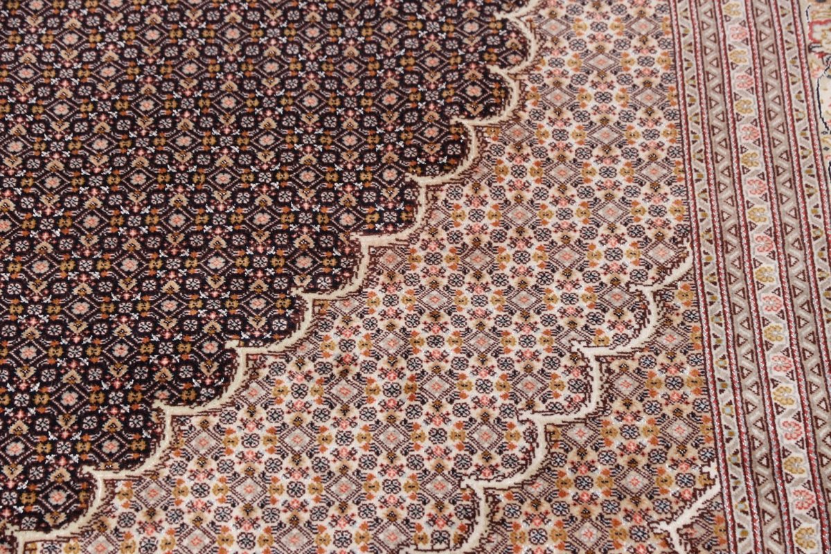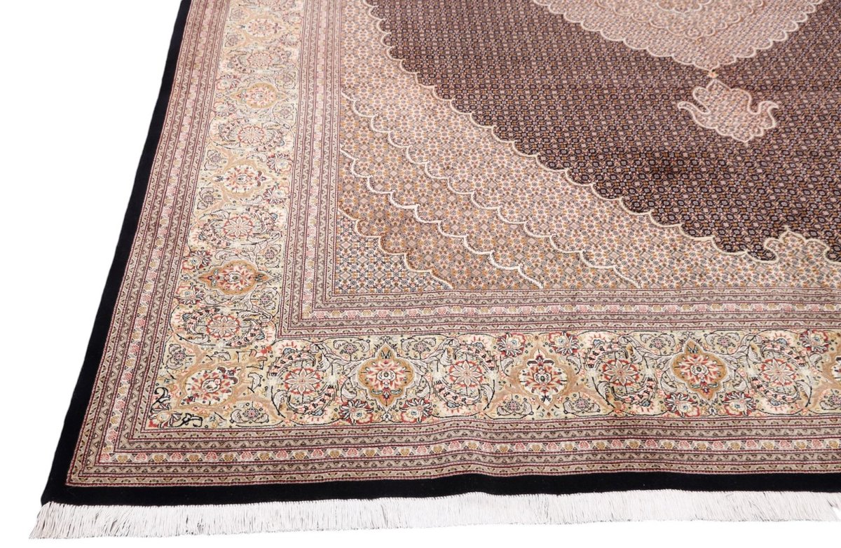 Für die besondere Eleganz des Täbriz-Flors sorgen hervorragende Materialien wie samtig anmutende Korkwolle und glänzende Seidenfäden. Die Knüpfqualität eines Täbriz-Teppichs lässt sich aus der angegebenen Raj-Zahl erschließen – je höher diese ausfällt, umso feiner ist die Knüpfdichte, die eine Million und mehr Knoten pro Quadratmeter erreichen kann. Bei besonders feingeknüpften Qualitäten kommt für die Kette statt des üblichen Baumwollgarns sogar Seide zum Einsatz.