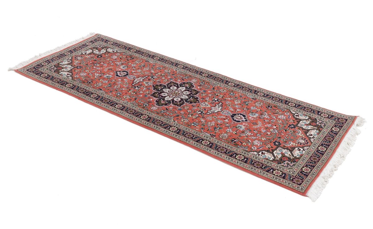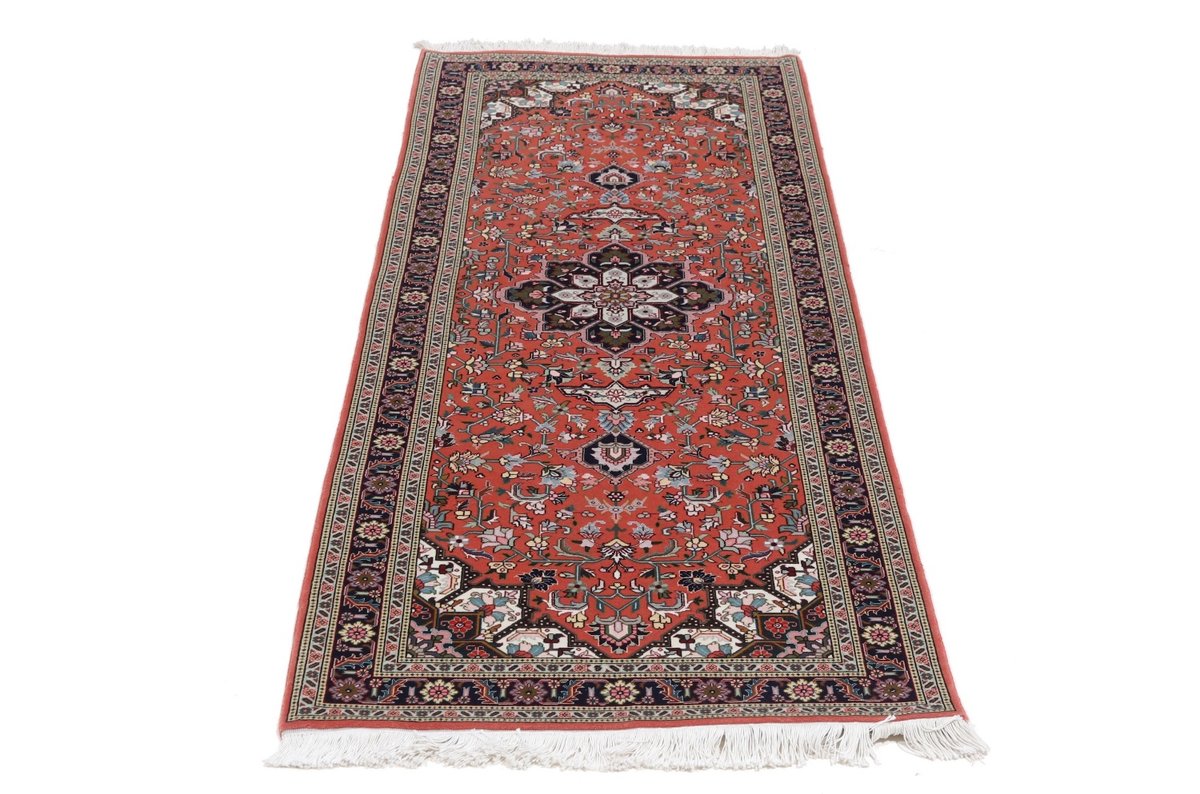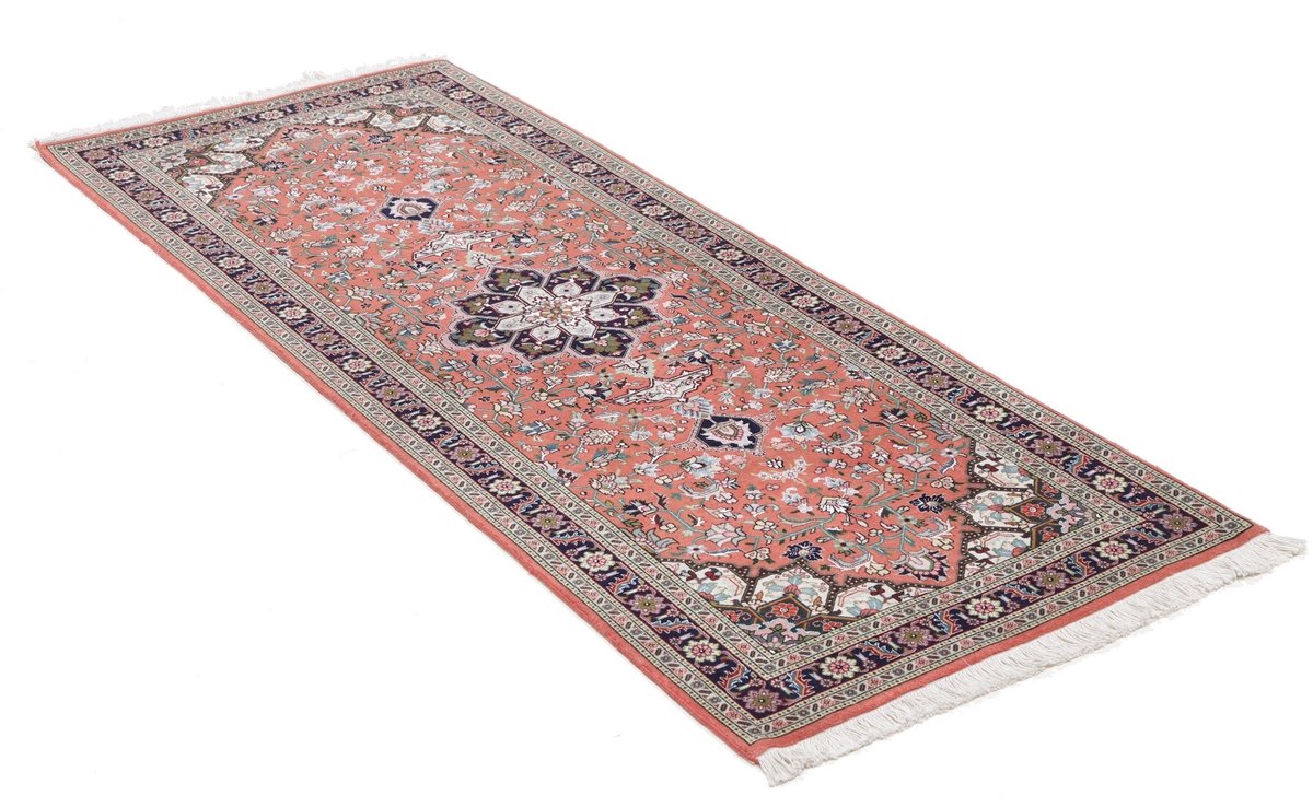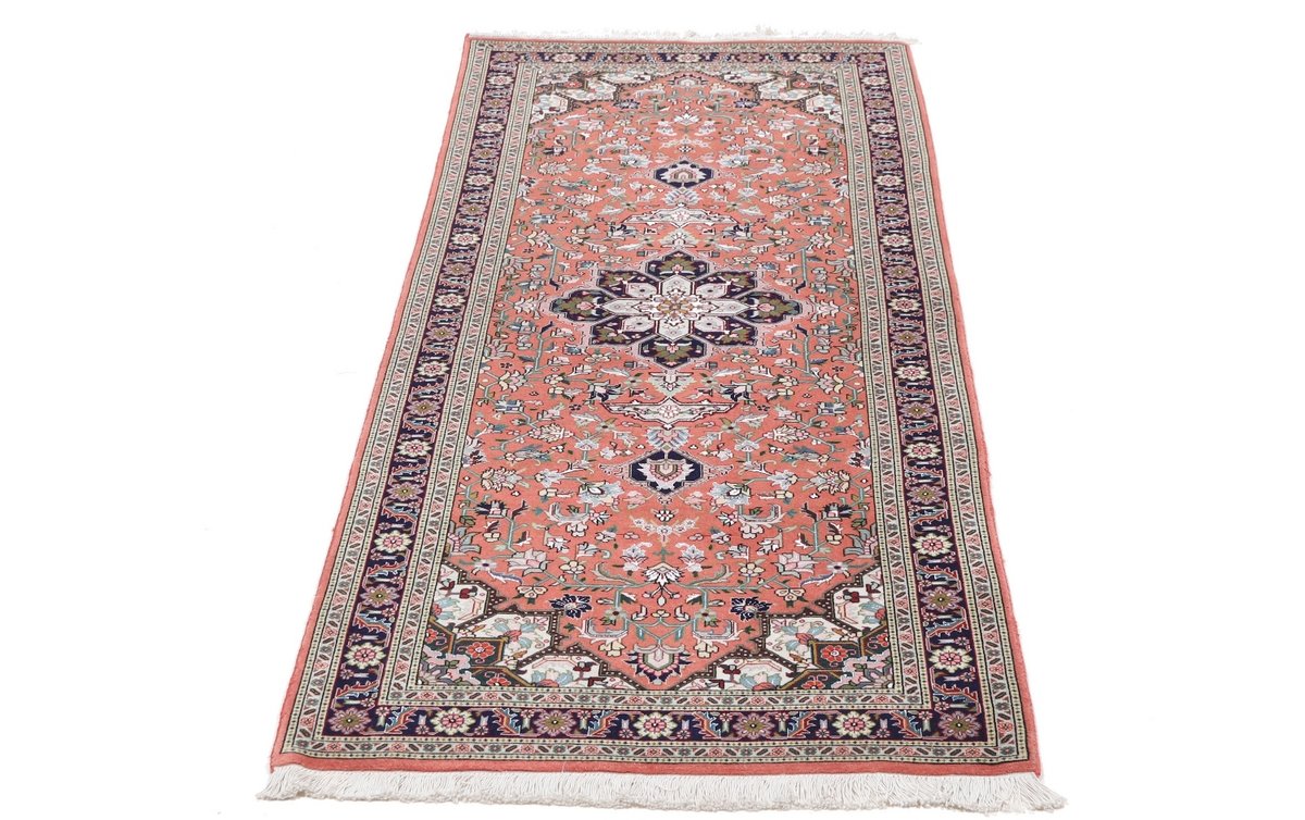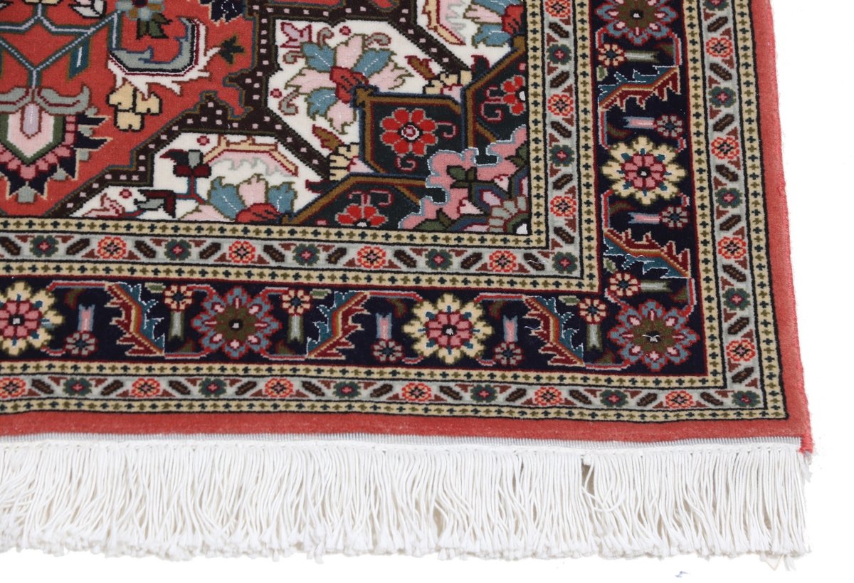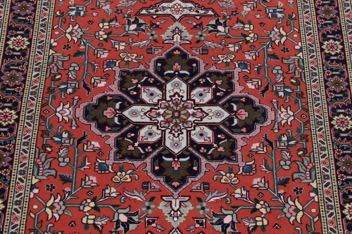 Für die besondere Eleganz des Täbriz-Flors sorgen hervorragende Materialien wie samtig anmutende Korkwolle und glänzende Seidenfäden. Die Knüpfqualität eines Täbriz-Teppichs lässt sich aus der angegebenen Raj-Zahl erschließen – je höher diese ausfällt, umso feiner ist die Knüpfdichte, die eine Million und mehr Knoten pro Quadratmeter erreichen kann. Bei besonders feingeknüpften Qualitäten kommt für die Kette statt des üblichen Baumwollgarns sogar Seide zum Einsatz.